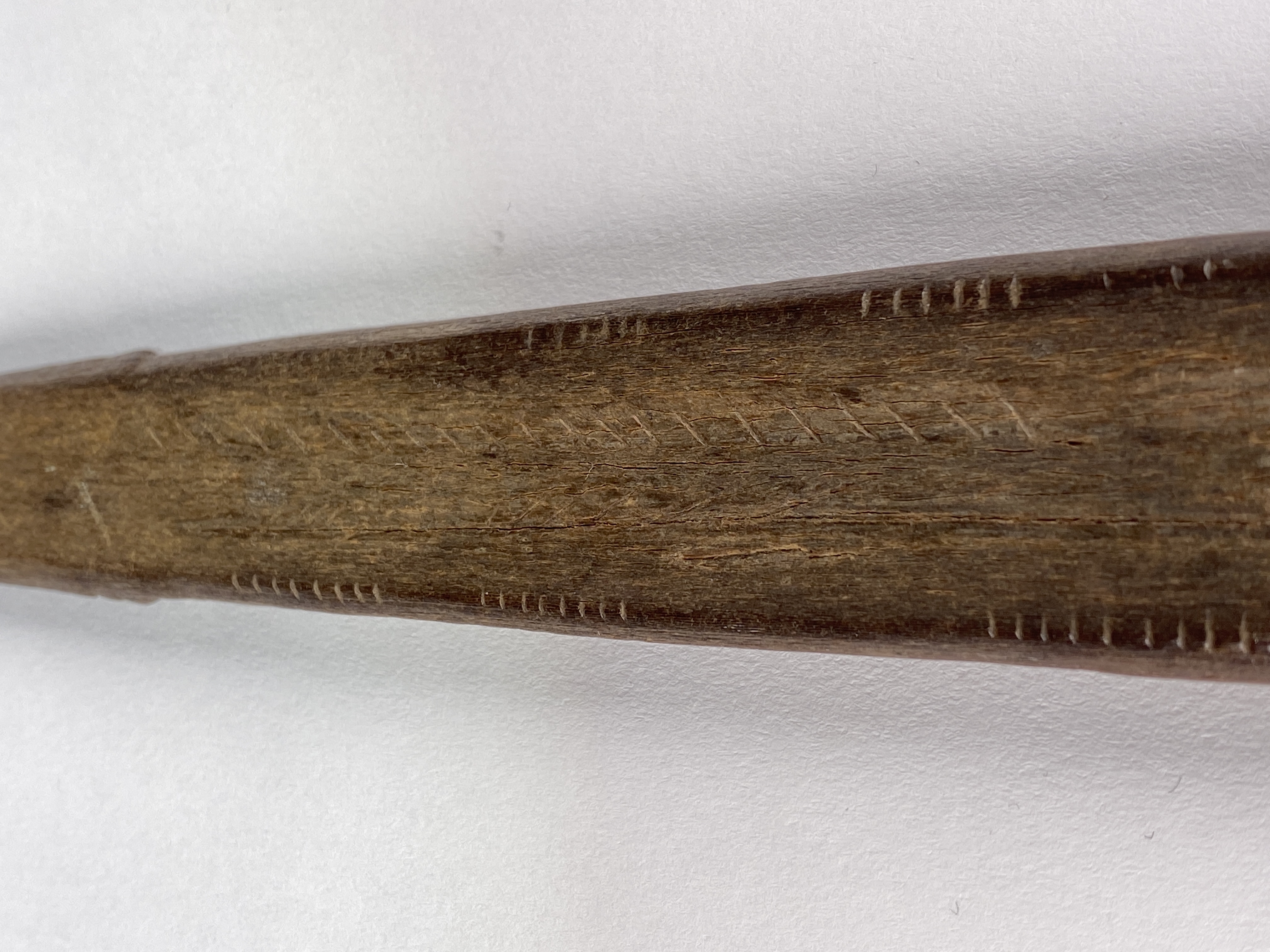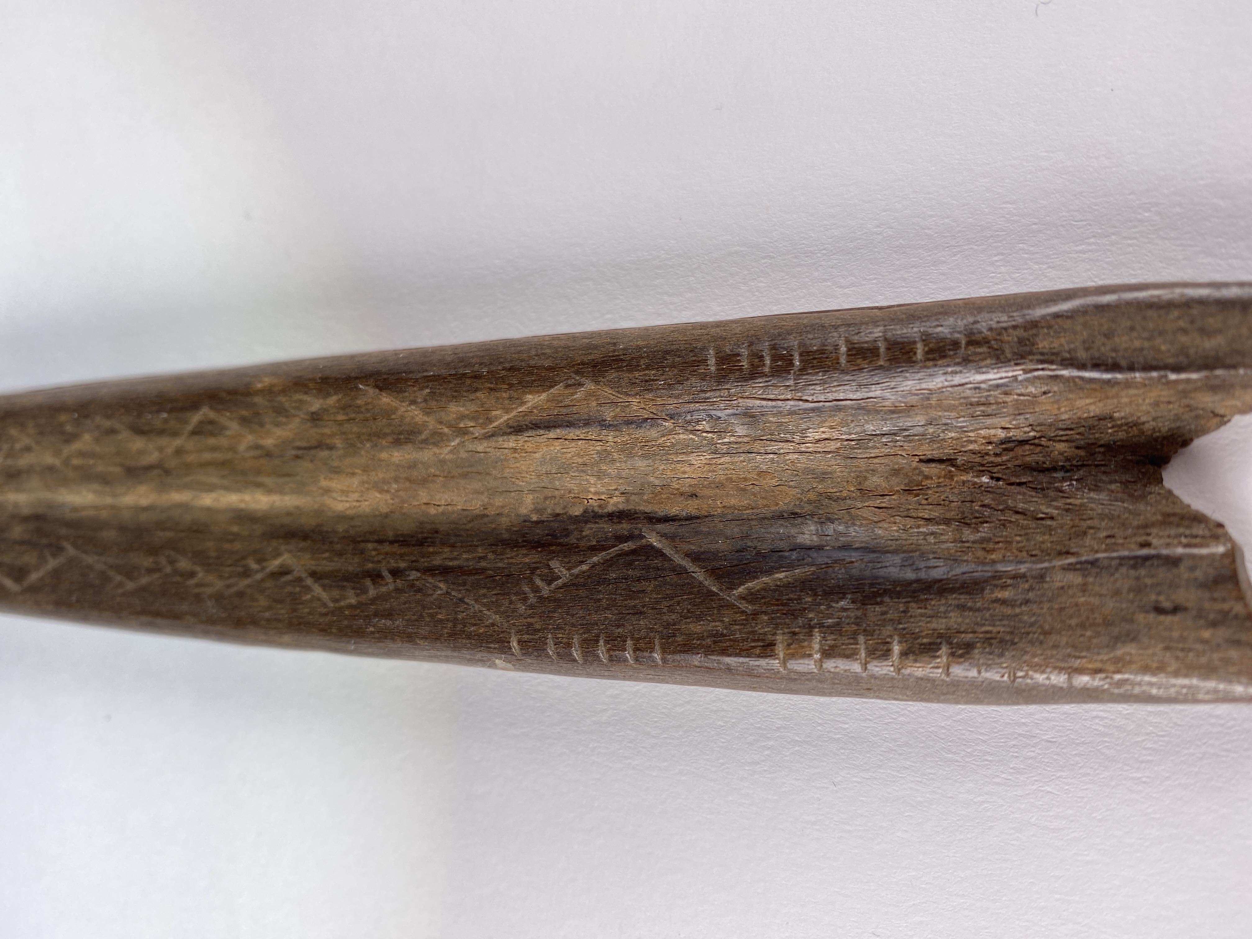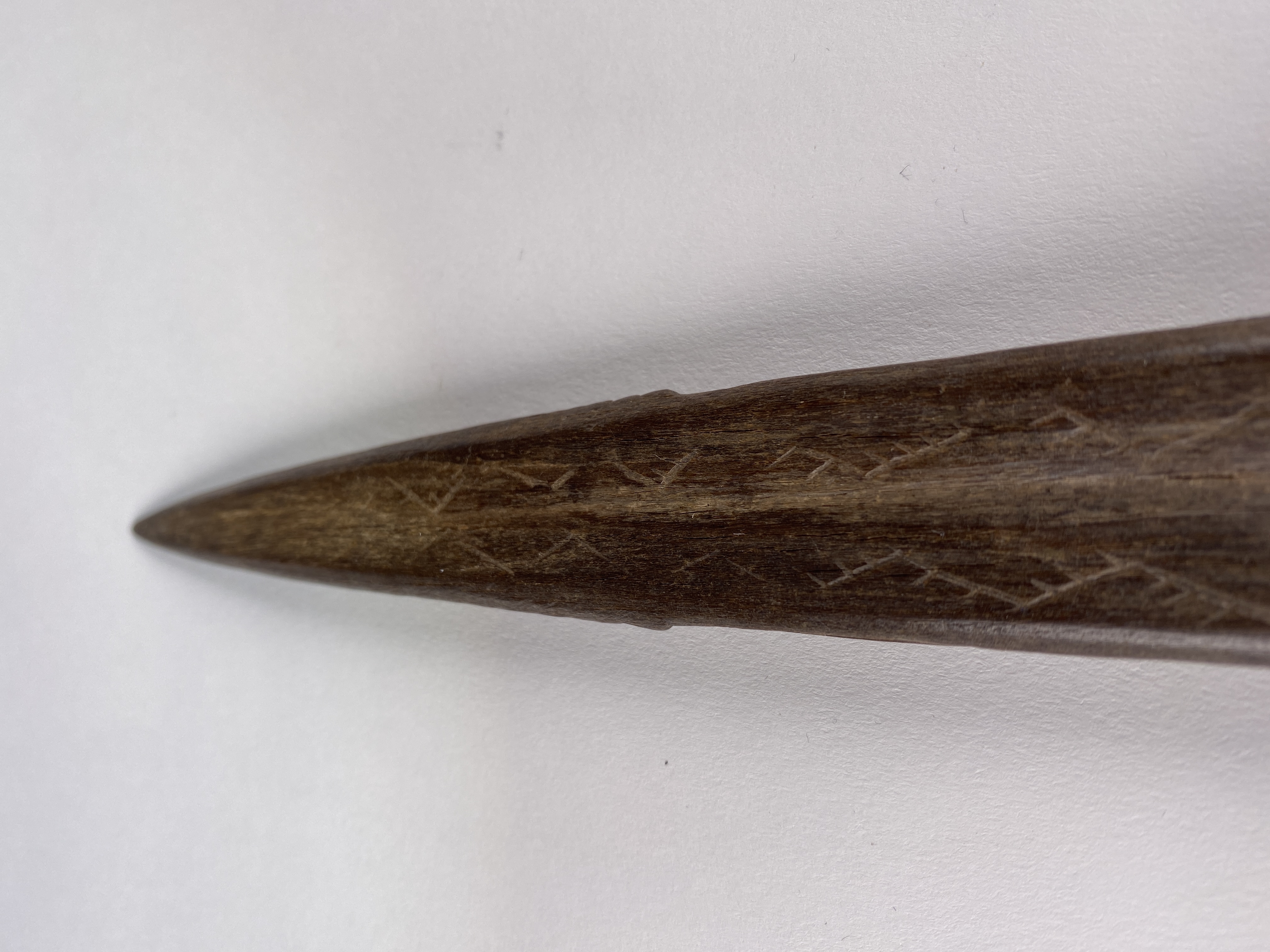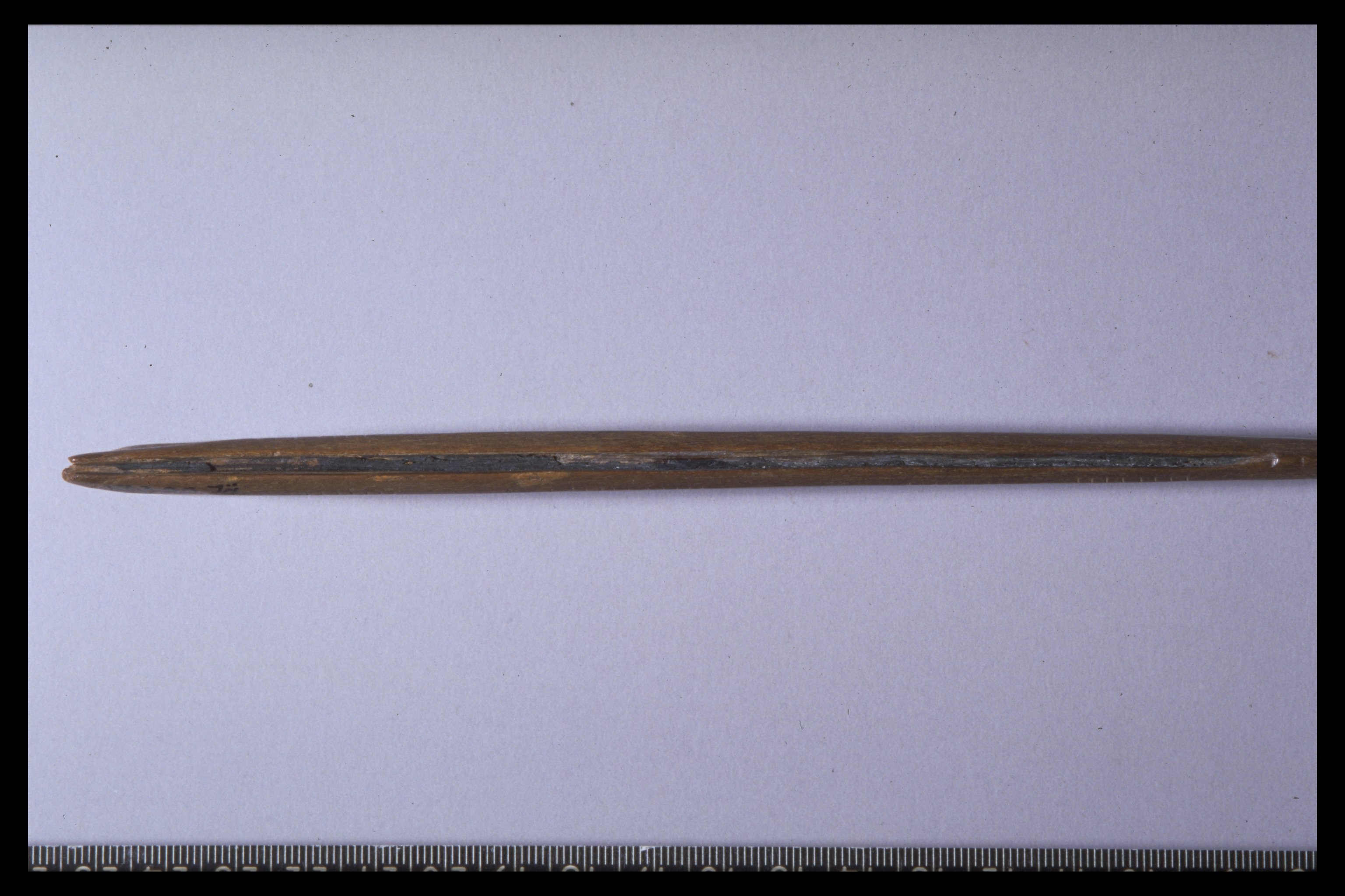 Spets av ben med kantfåror för flinteggar, ovanligt stor och bred. Utmärkt vacker med rik linjeornering, olika på båda sidorna.