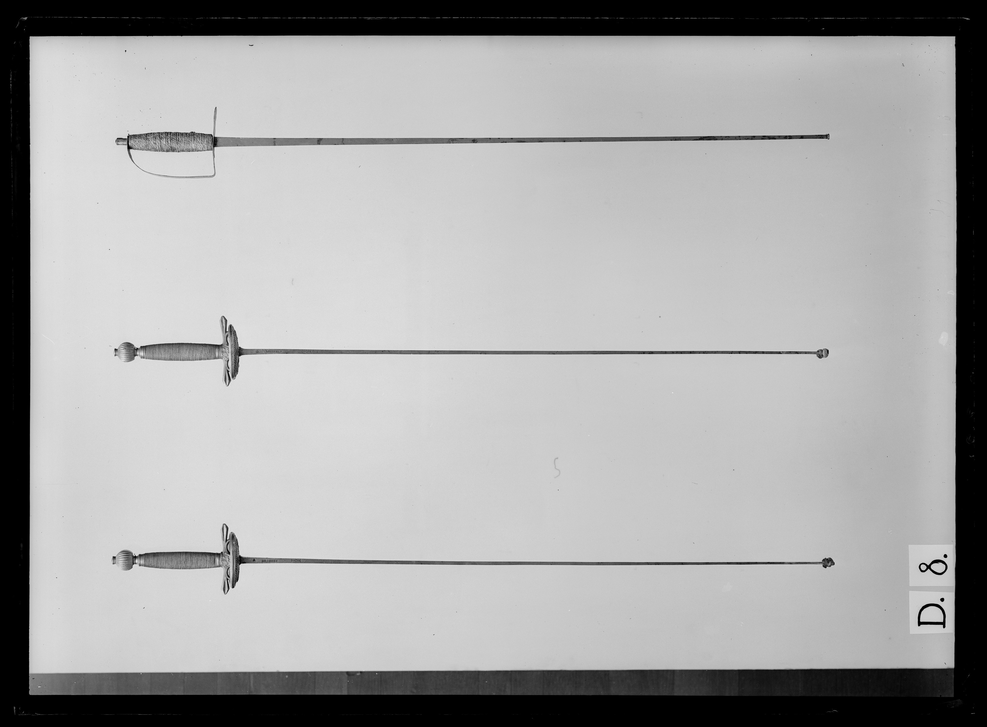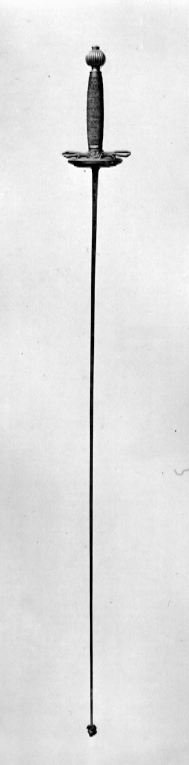 Fäste av förgylld reliefornerad mässing. Knapp kulformig med rakt avskuren nederdel och ornerad med vertikala räfflor. Nitknapp med nästan plan översida. Parerstänger raka tämligen korta, de ansvällda ytterdelarna med längsgående räfflor. Fingerbyglar mycket låga. Kryss med bladornament. Parerplåtar symmetriskt njurformiga med små rutformiga hål utmed mitten akantusrankor. Kavel lindad med tvinnad silvertråd. Ringbeslag med intryckta linjer utmed kanterna. Klinga rak, med rektangulärt tvärsnitt ytterdelen avslutad med en liten rund platta omvirad med sämskskinn (till ett knappliknande skydd). På båda bredsidorna, nära klingans bas inpunsat: " A SOLINGEN " och ett märke med ovalt mittparti, varifrån utgår två streck i klingans längdriktning, avslutade med ett kryss respektive tre flikar.