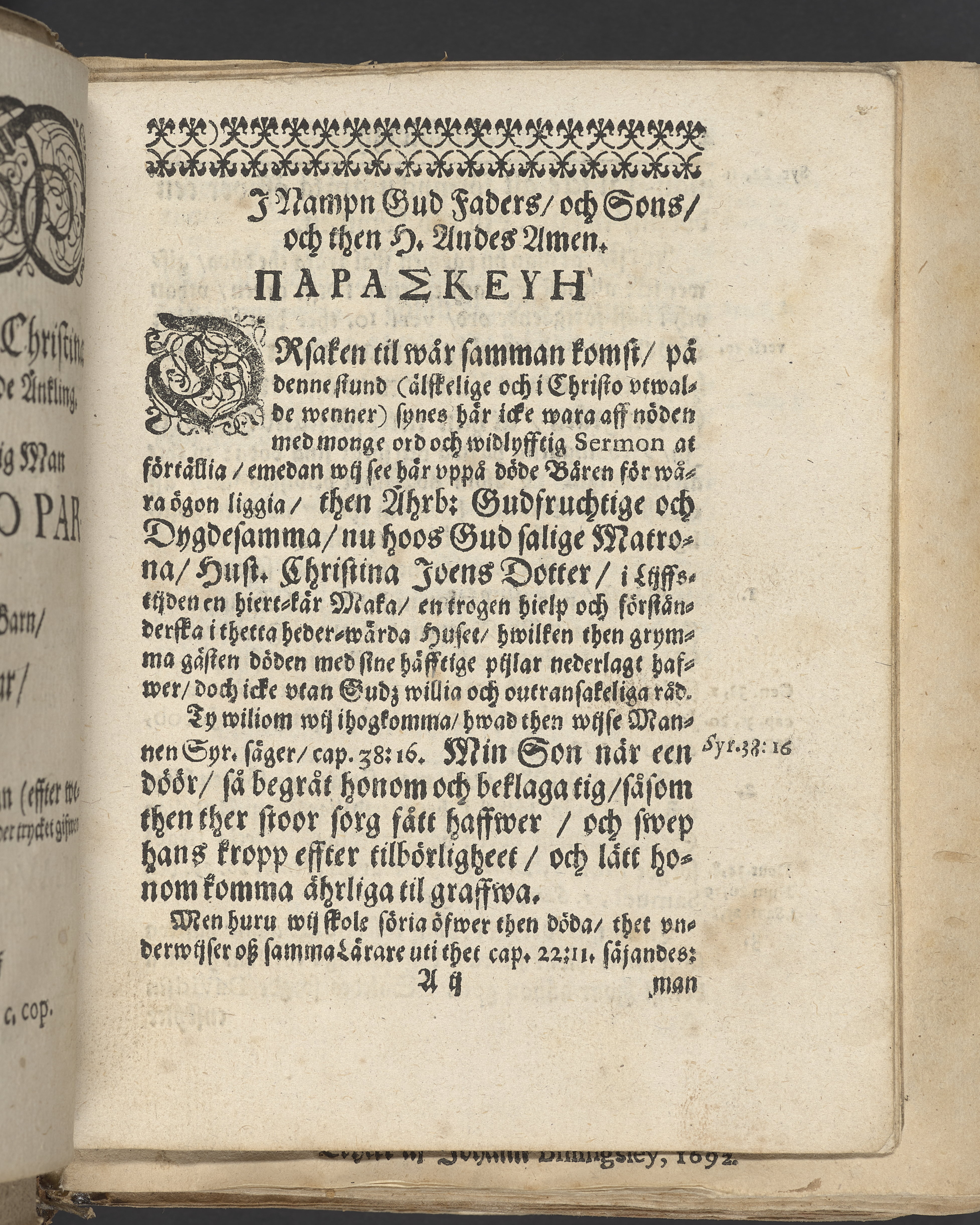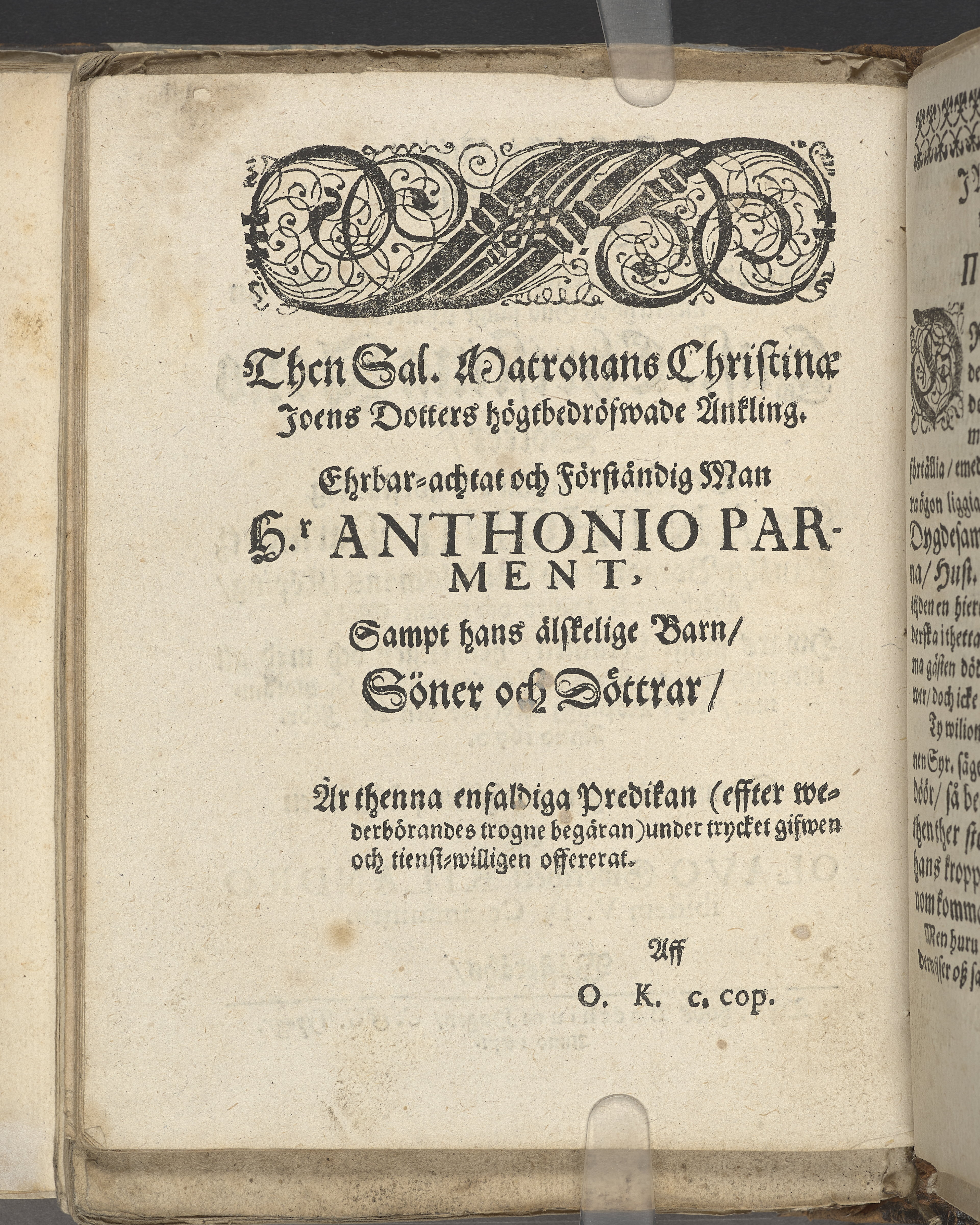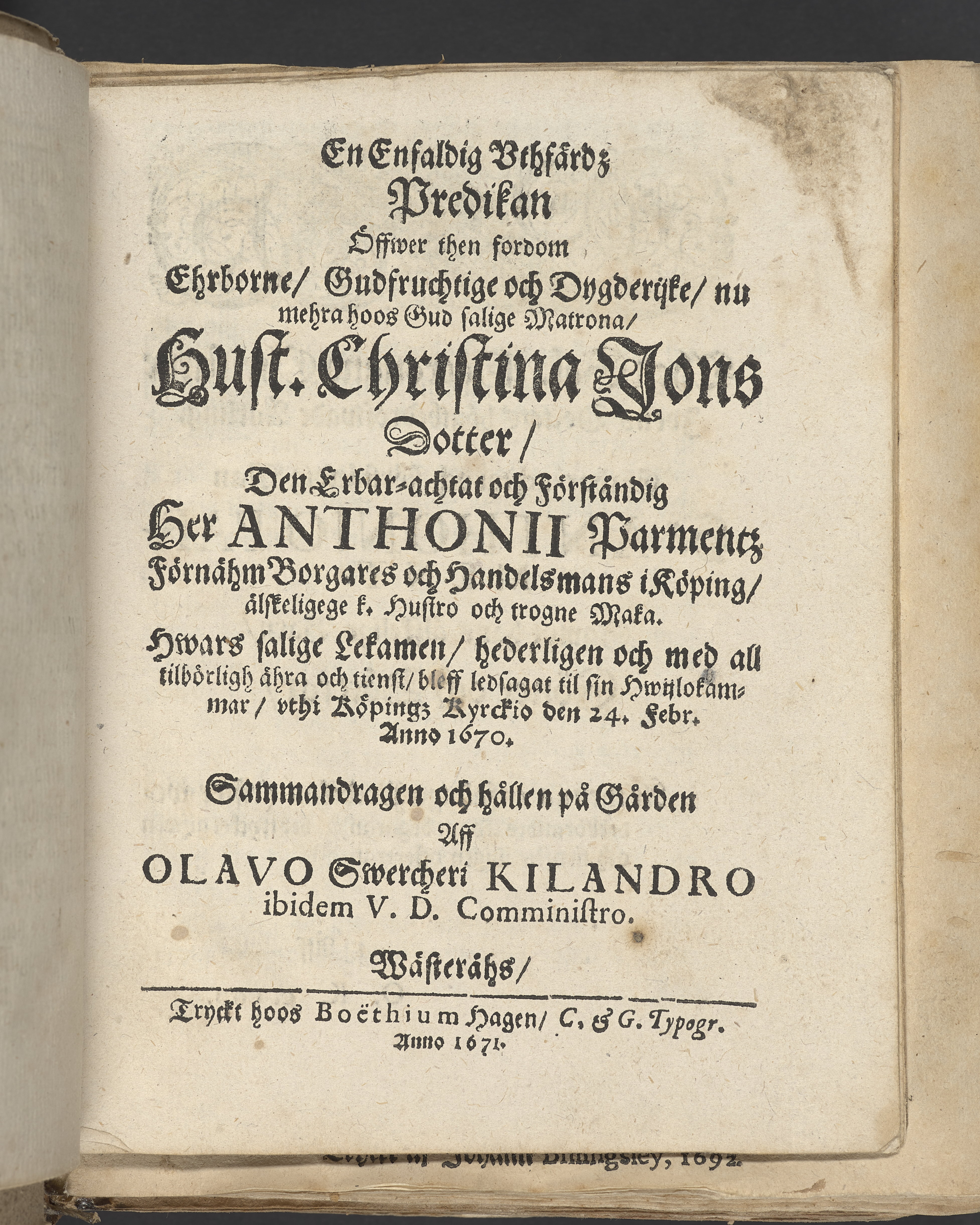 En enfaldig uthfärdz predikan öffwer ... Hust. Christina Jons Dotter ... Her. Anthonii Parmentz ... borgares och handelsmans i Köping ... maka ... vthi Köpingz kyrckio den 24. febr. anno 1670: Sammandragen ... aff Olavo Schwercheri Kilandro ... Wästeråhs, tryckt hoos Boëthium Hagen ... 1671.