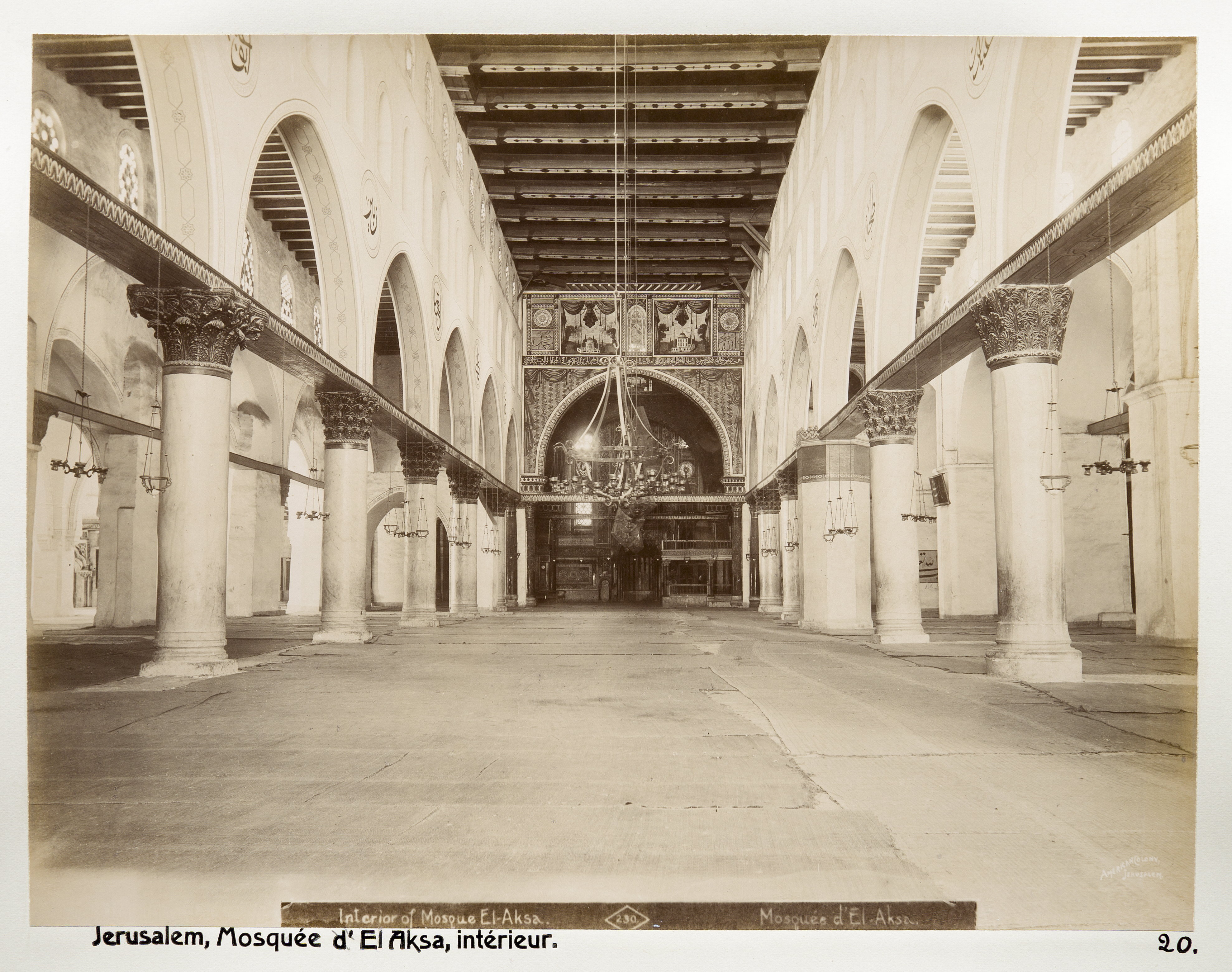 al-Aqsamoskén i Jerusalem, interiör. Text på originalet: "Interior of Mosque El-Aksa./Mosquée d'El-Aksa, intérieur." Fotografierna LXVI:N.01.-180. kommer från resan till Palestina och Syrien som Wilhelmina och Walther von Hallwyl gjorde den 30 mars-27 april 1901. De lämnade Sverige den 5 november 1900 för Egypten, där de stannade till den 28 mars 1901, då de fortsatte till Palestina. Med på resan var Wilhelminas sällskapsdam, fröken Ida Uhse. Den 27 april fortsatte de till Turkiet och Mindre Asien. De mindre fotografierna (utom de från Samos) LXVI:N.90.-100. är tagna av Wilhelmina själv, under en resa till häst från Jerusalem till Damaskus 8-20 april 1901. Övriga fotografier är inköpta av Wilhelmina i Jerusalem, Damaskus och Beirut. Alla uppgifter kommer från Ida Uhses reseanteckningar.