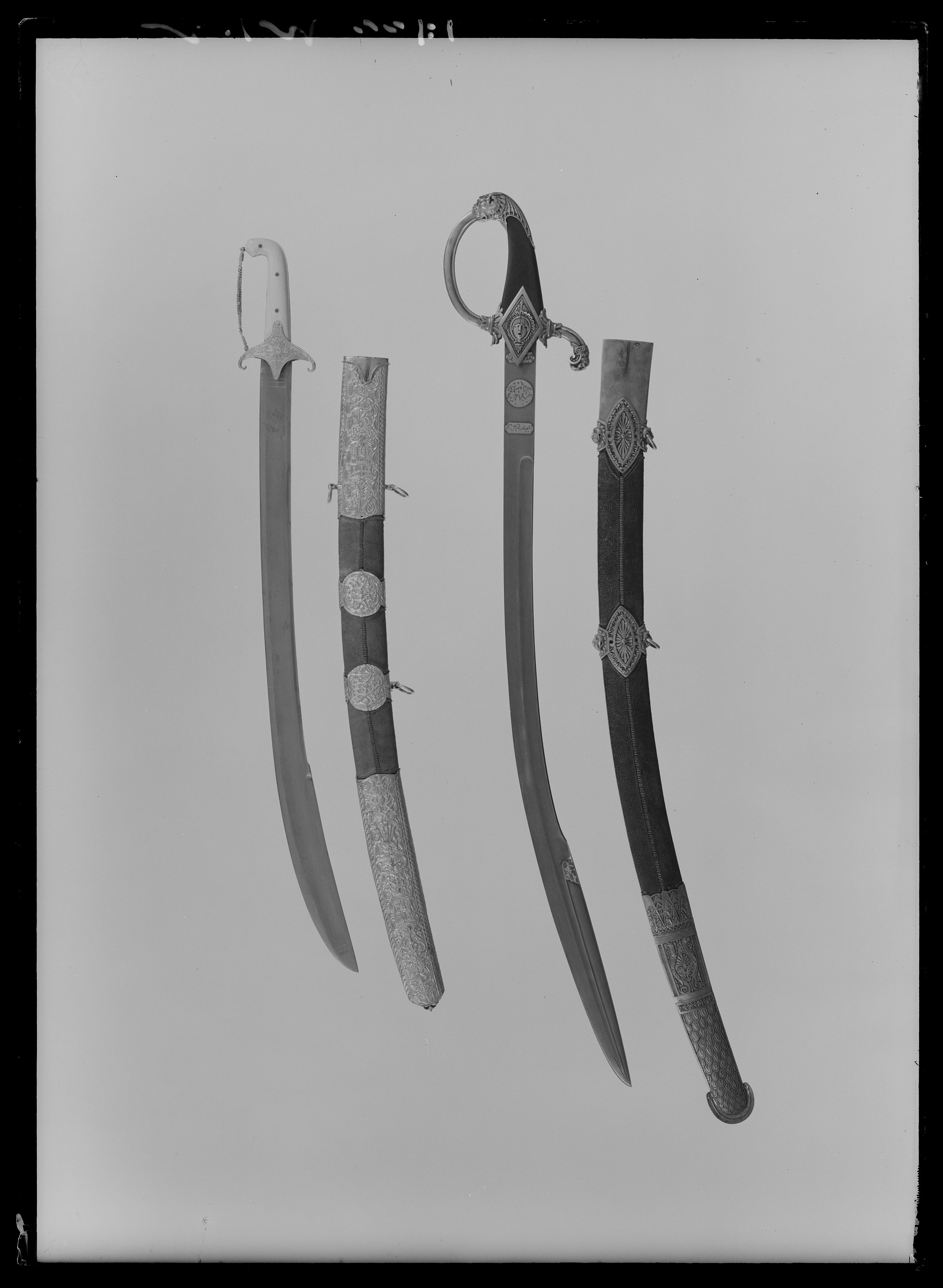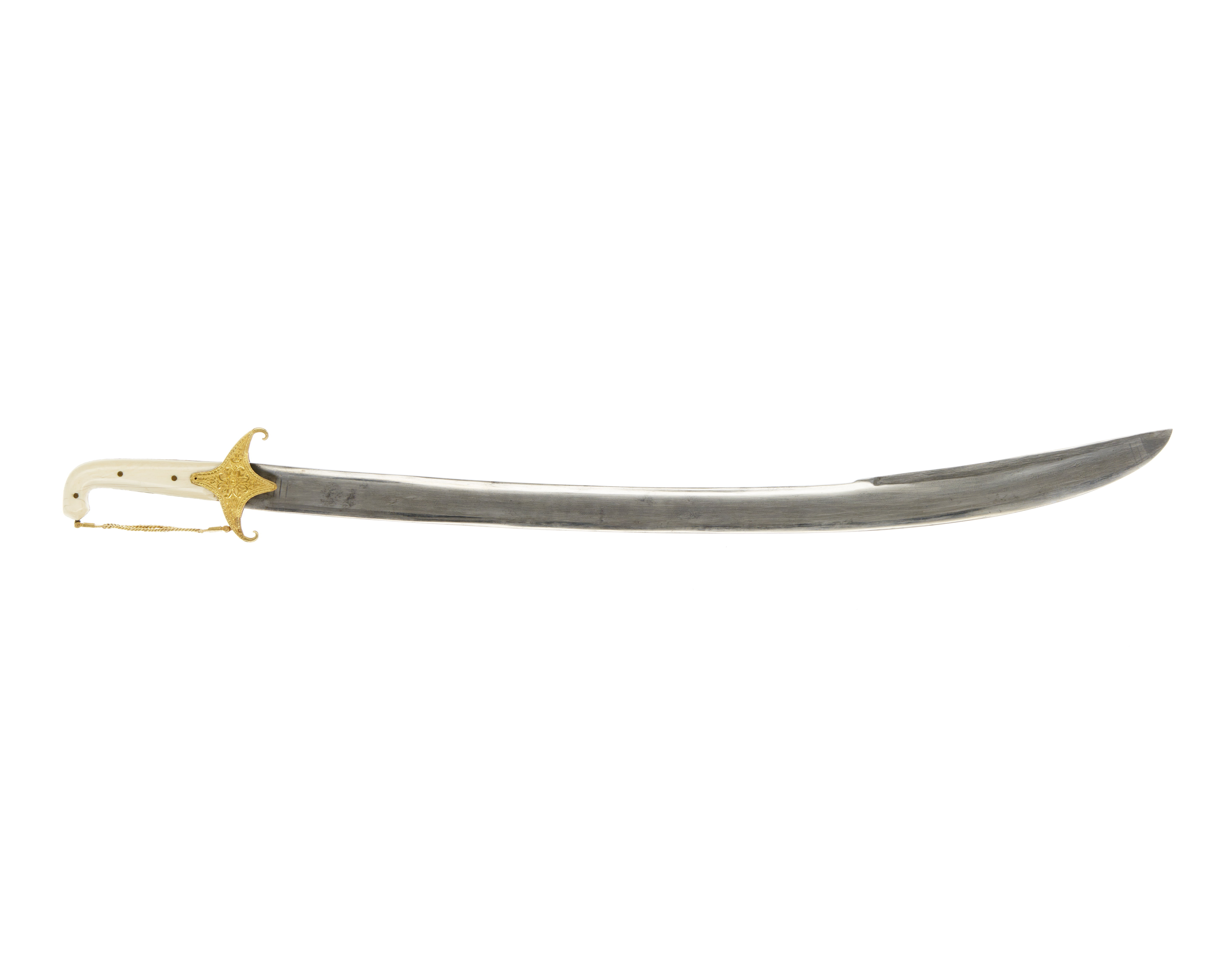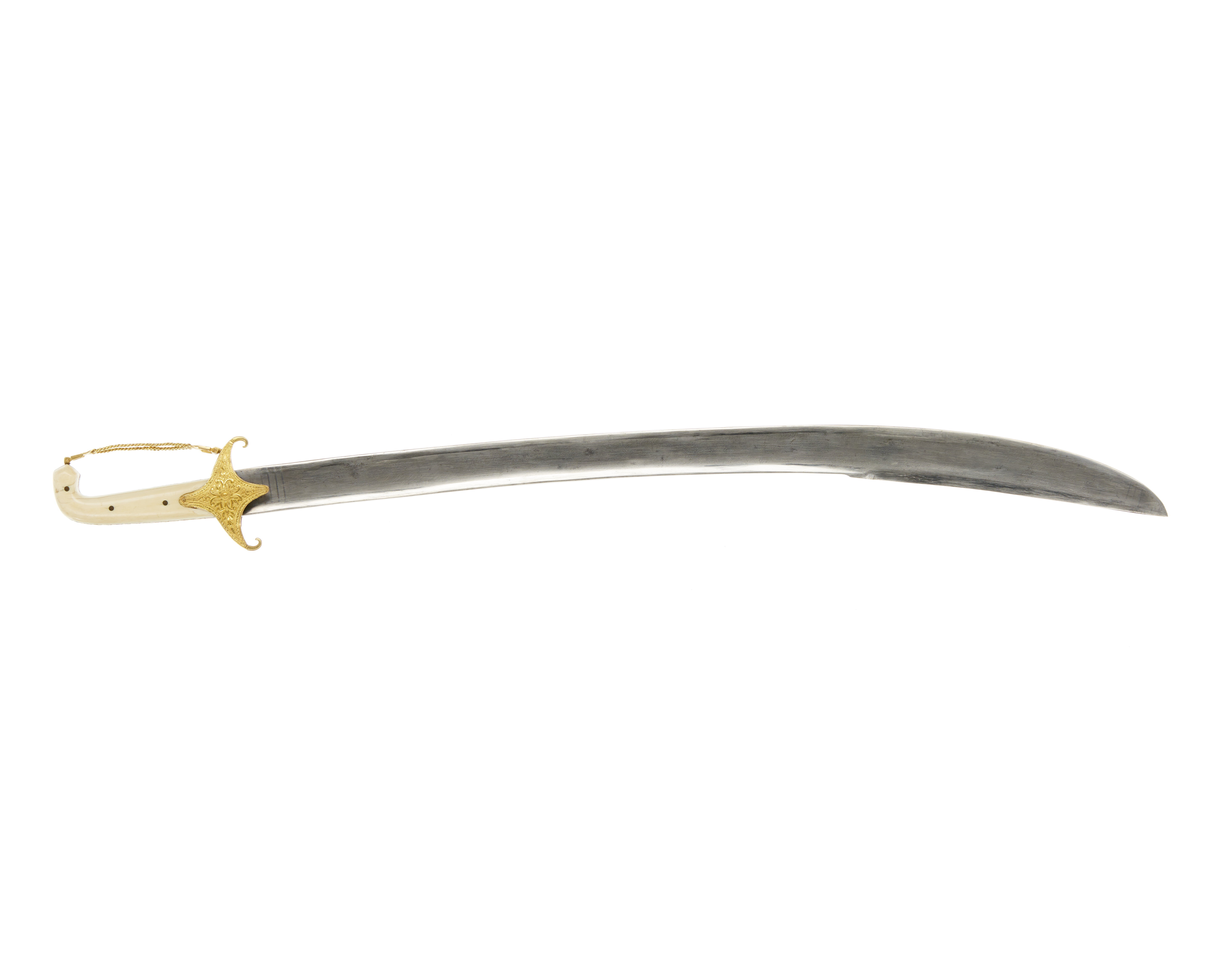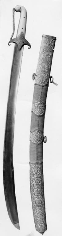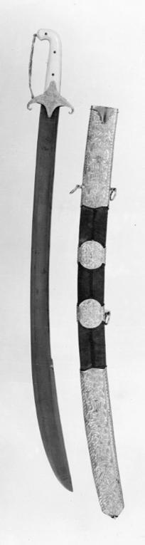 Fäste med beslag av ciselerat, drivet guld och förgyllt silver, kavelbeläggning av elfenben. Kaveln på båda sidor belagd med tjocka slätpolerade elfenbensstycken, fastsatta med tre genomgående nitar av mässing, överdelen rät-vinkligt framåtböjd. Utmed mellanrummet mellan elfenbensstyckena en list av förgyllt silver, ornerad med bladranka. Pareranordning bestående av korta nedåtböjda parerstänger och runda, insvängda styrskenor av guldbleck med driven och ciselerad ornering i form av en bladrosett i mitten och kantbård med sicksackformigt linjeornament. Mellan främre parerstångens ytterände och kavelns överdel, i förgyllt silver två flata kedjor, upptill och nedtill ut-gående från palmettornerad platta, fäst med scharner vid parerstångsänden respektive kavelns överdel. Klinga damaskerad, böjd och med ca 240 mm lång jelman.