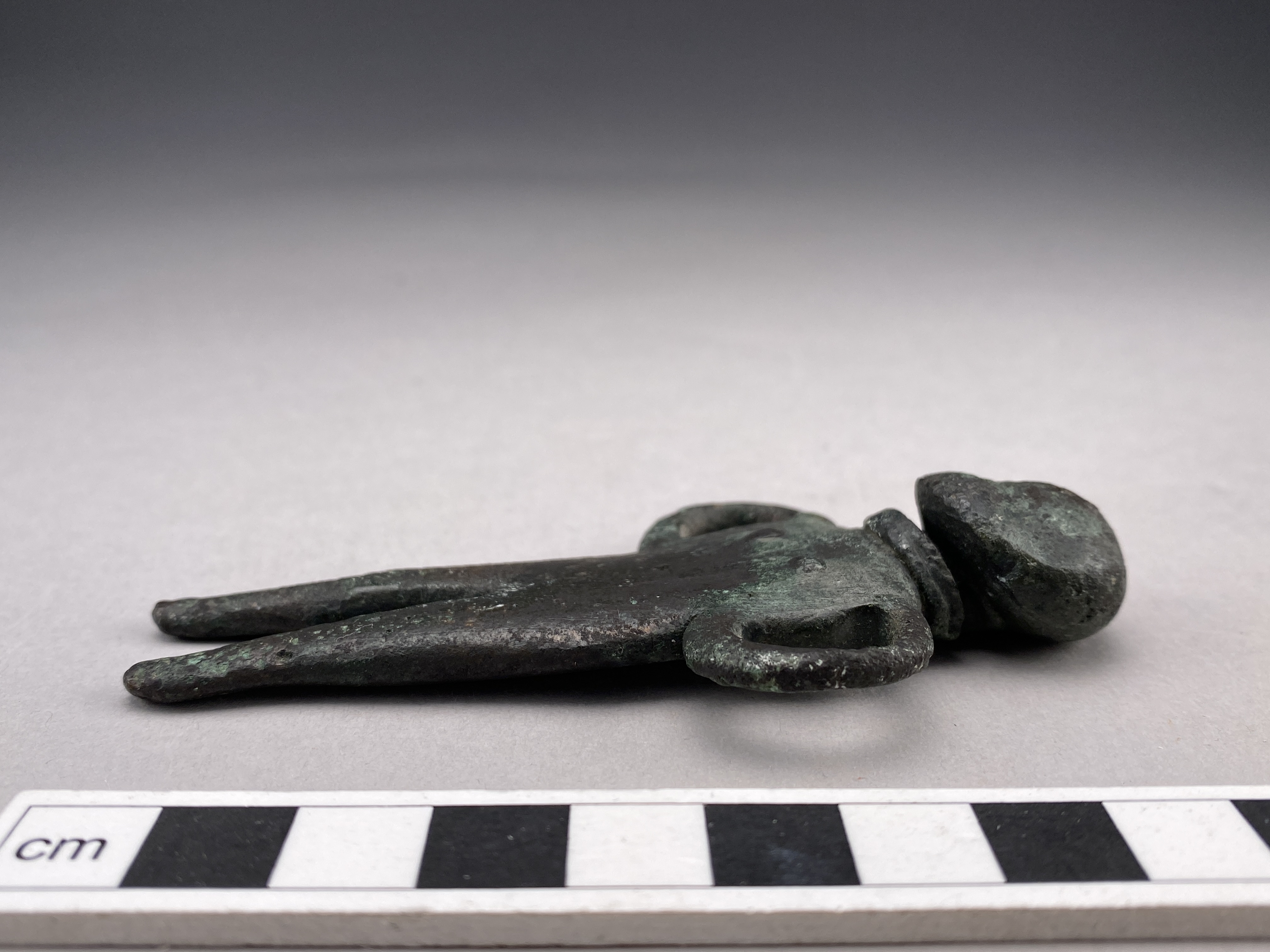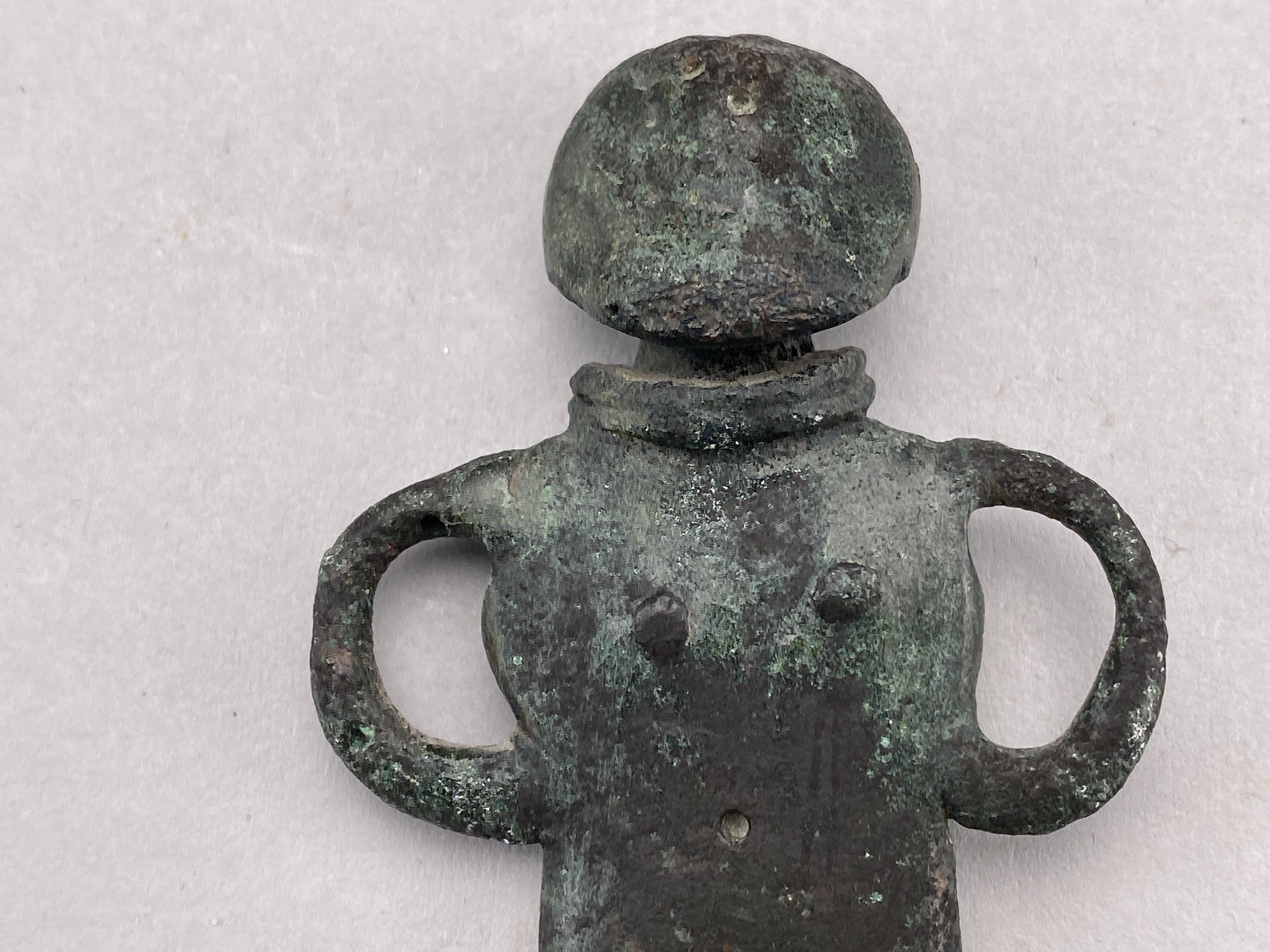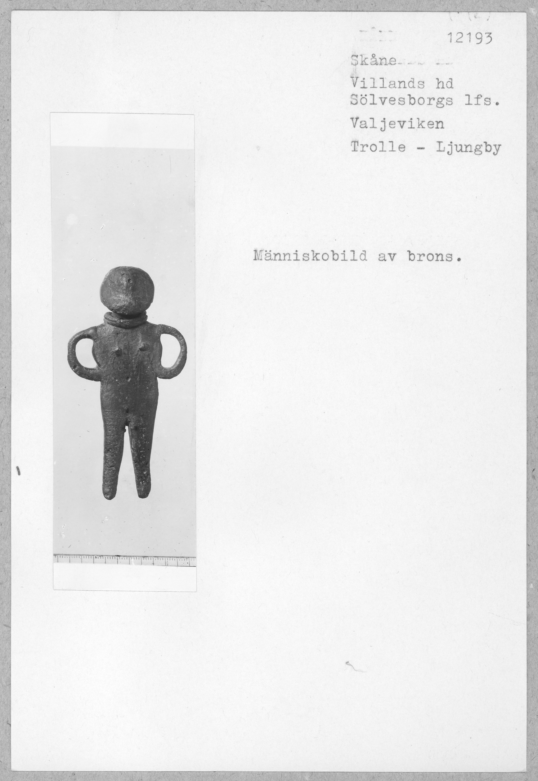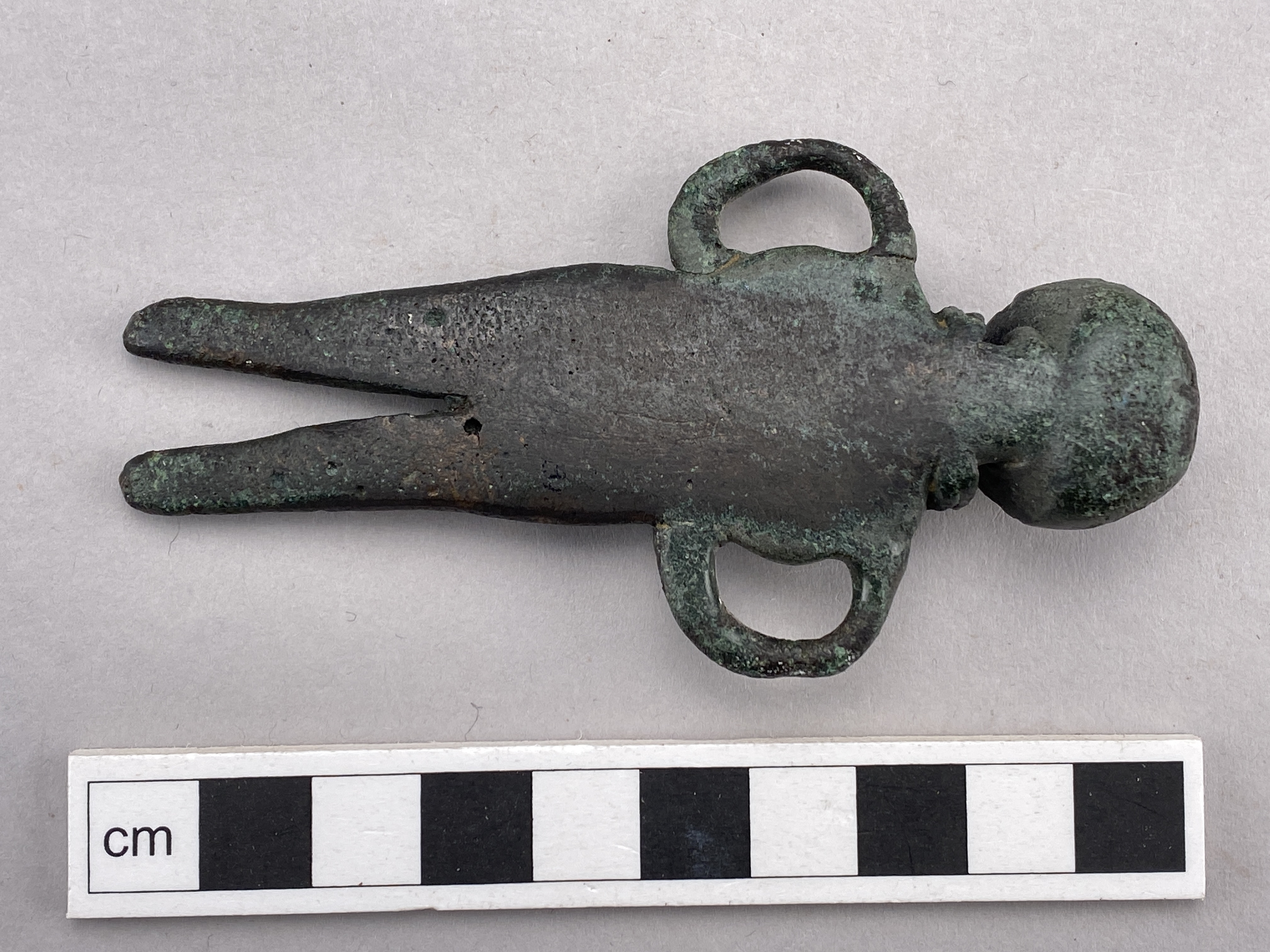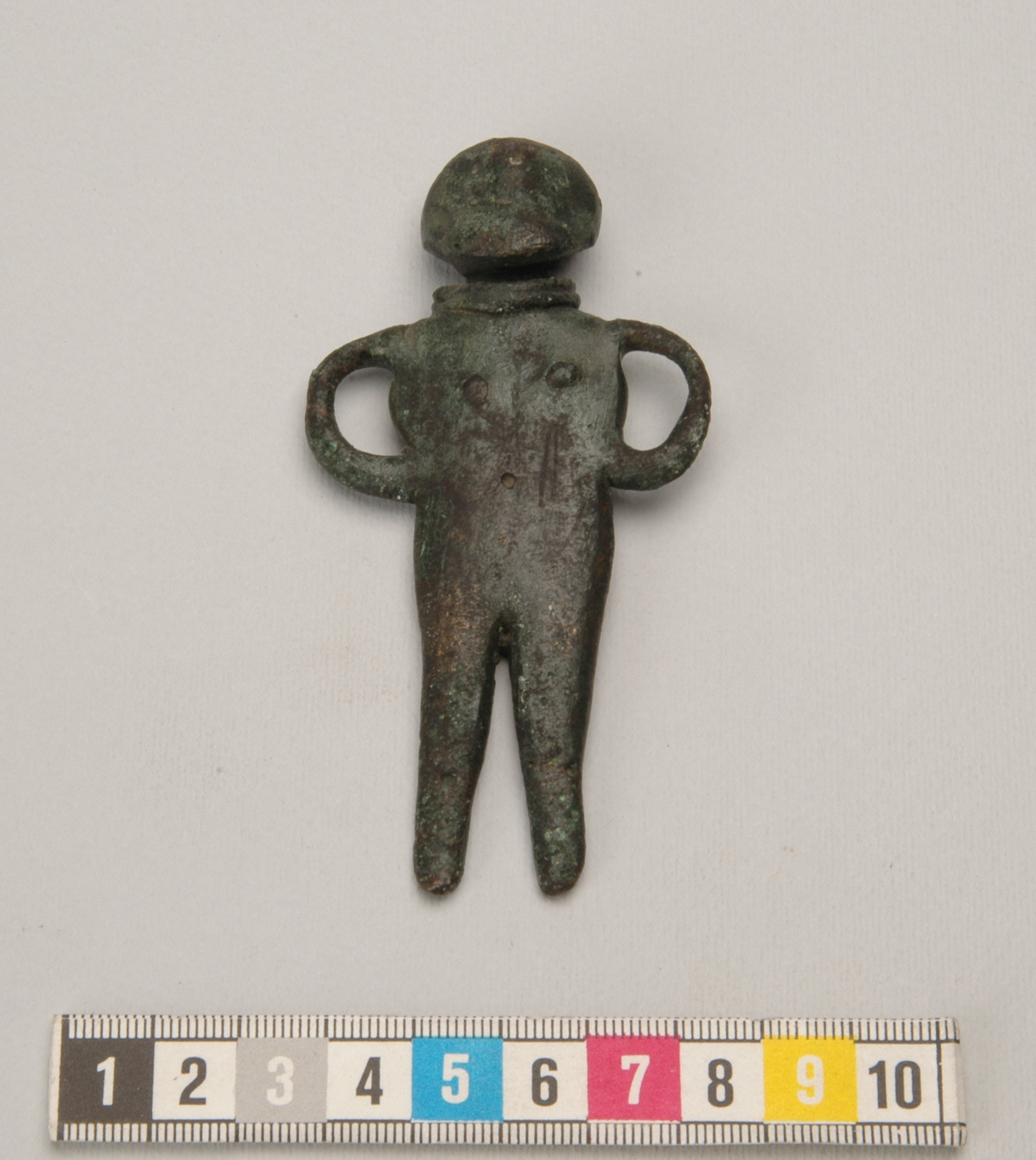 Statyett av brons föreställande en naken kvinna med dubbel halsring som enda prydnad. Små markerade bröst, armarna hålls i ett slags "höfterfäst" och bildar öglor mot kroppen, de avslutas utan händer. Navel markerad på magen. Benen är åtskilda och avslutas utan fötter. Statyetten är platt med rak profil. Halsringen har delvis bevarad ornering av snedställda streck. Saknar tydliga markeringeringar för ögon, näsa och mun