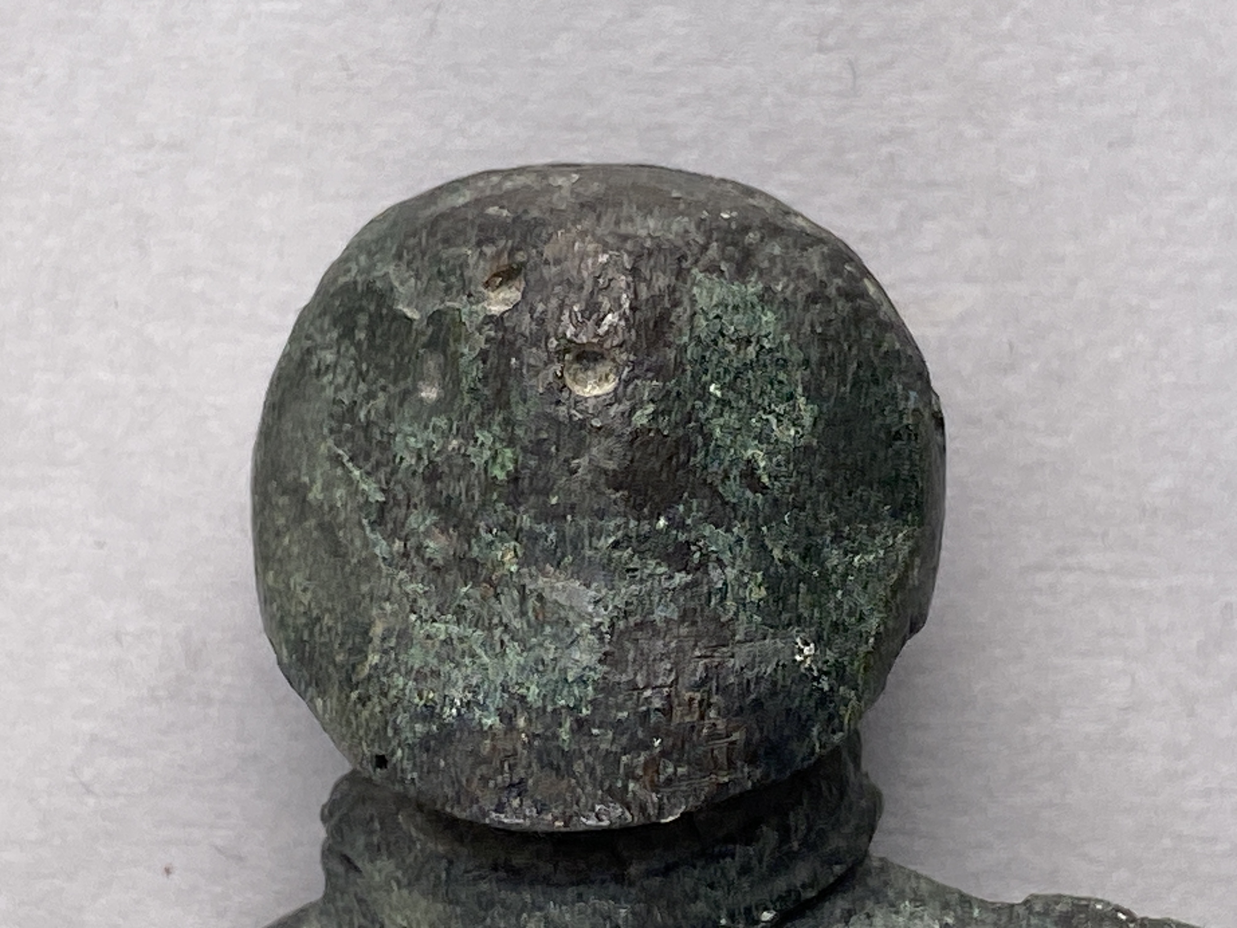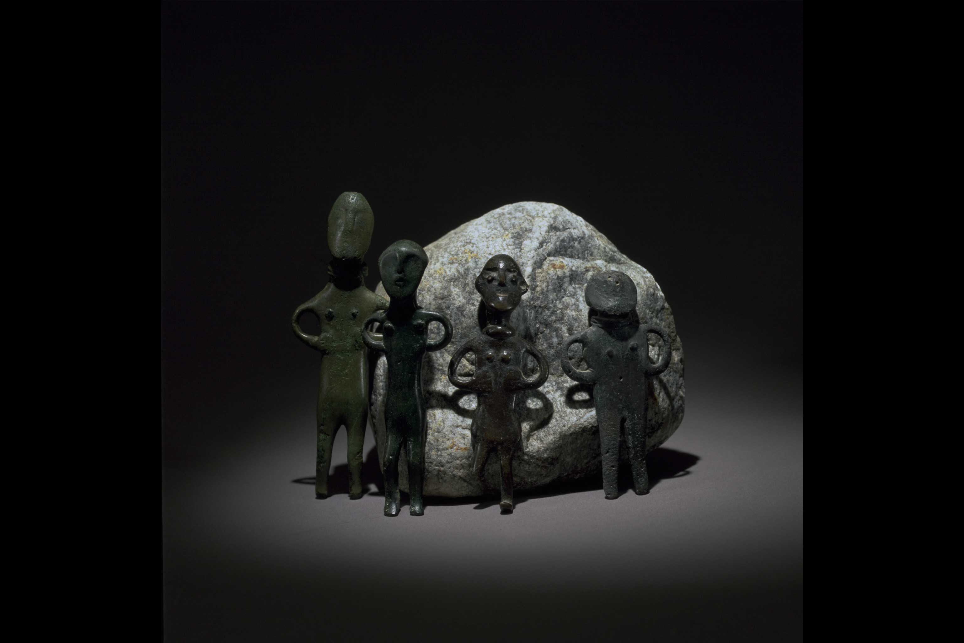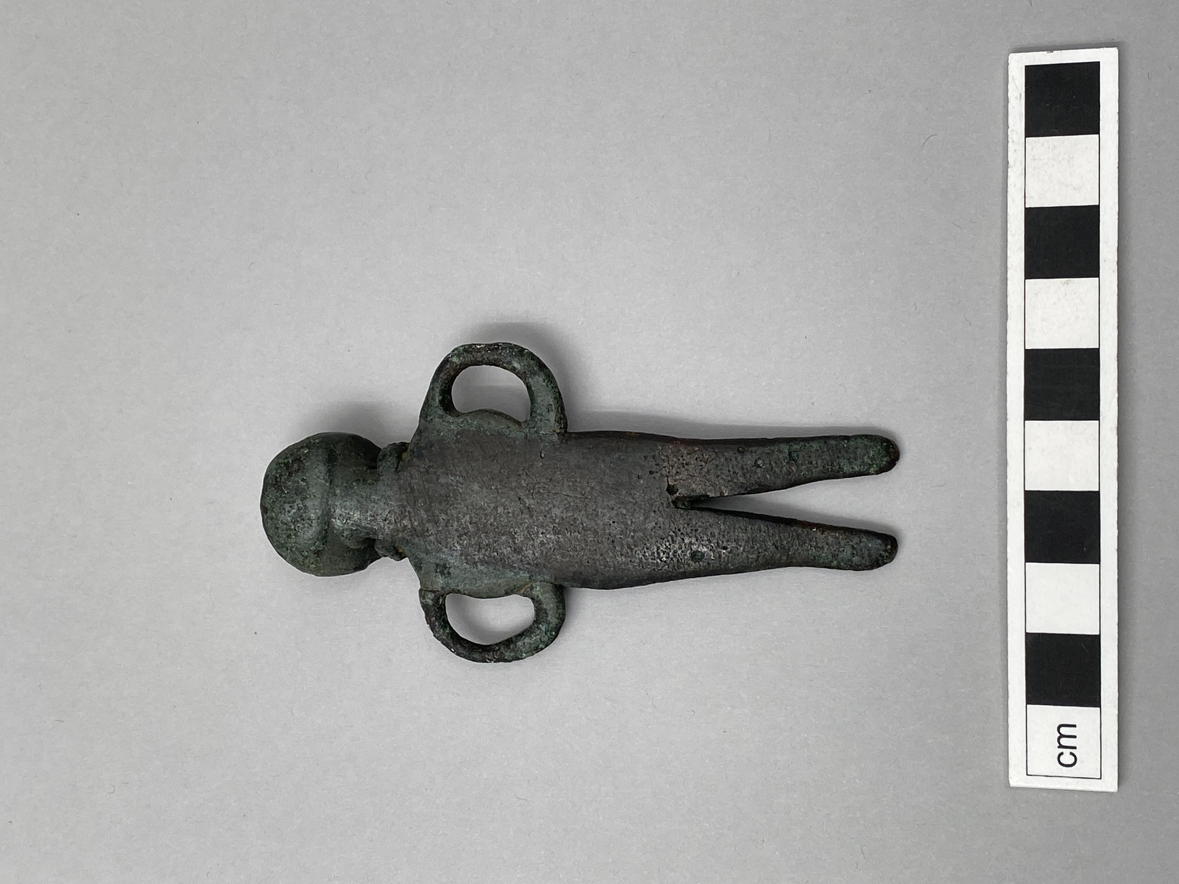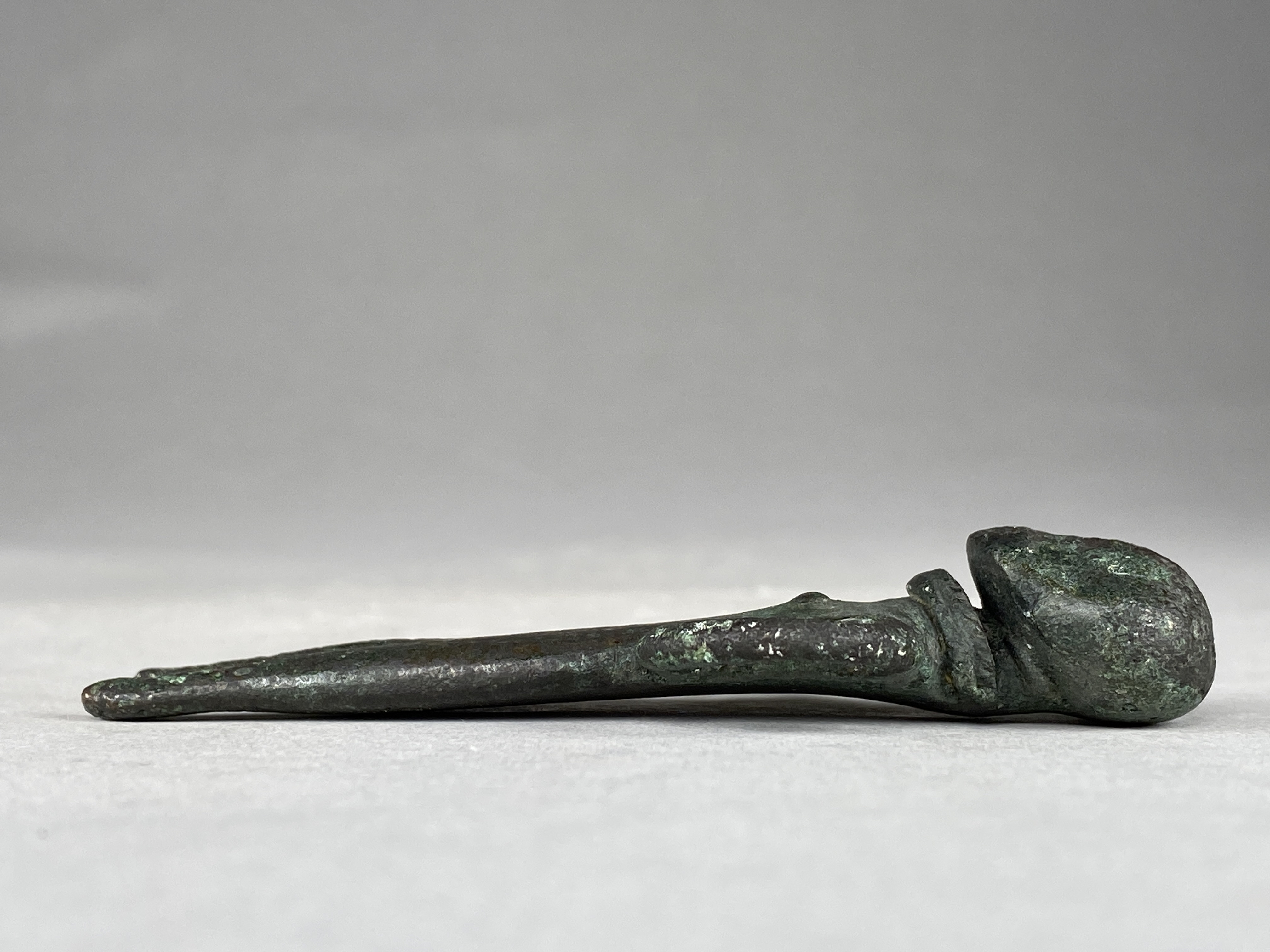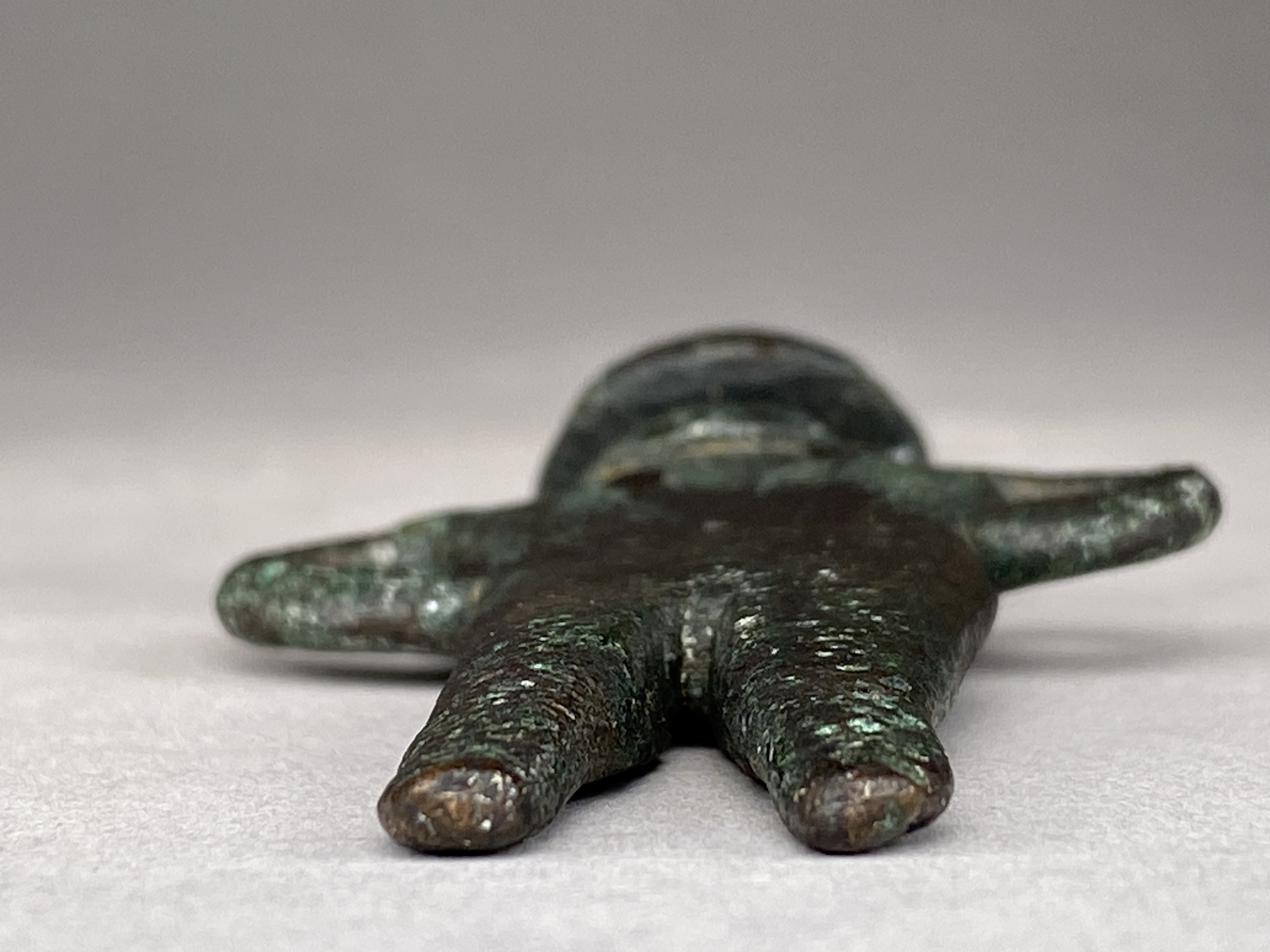 Statyett av brons föreställande en naken kvinna med dubbel halsring som enda prydnad. Små markerade bröst, armarna hålls i ett slags "höfterfäst" och bildar öglor mot kroppen, de avslutas utan händer. Navel markerad på magen. Benen är åtskilda och avslutas utan fötter. Statyetten är platt med rak profil. Halsringen har delvis bevarad ornering av snedställda streck. Saknar tydliga markeringeringar för ögon, näsa och mun