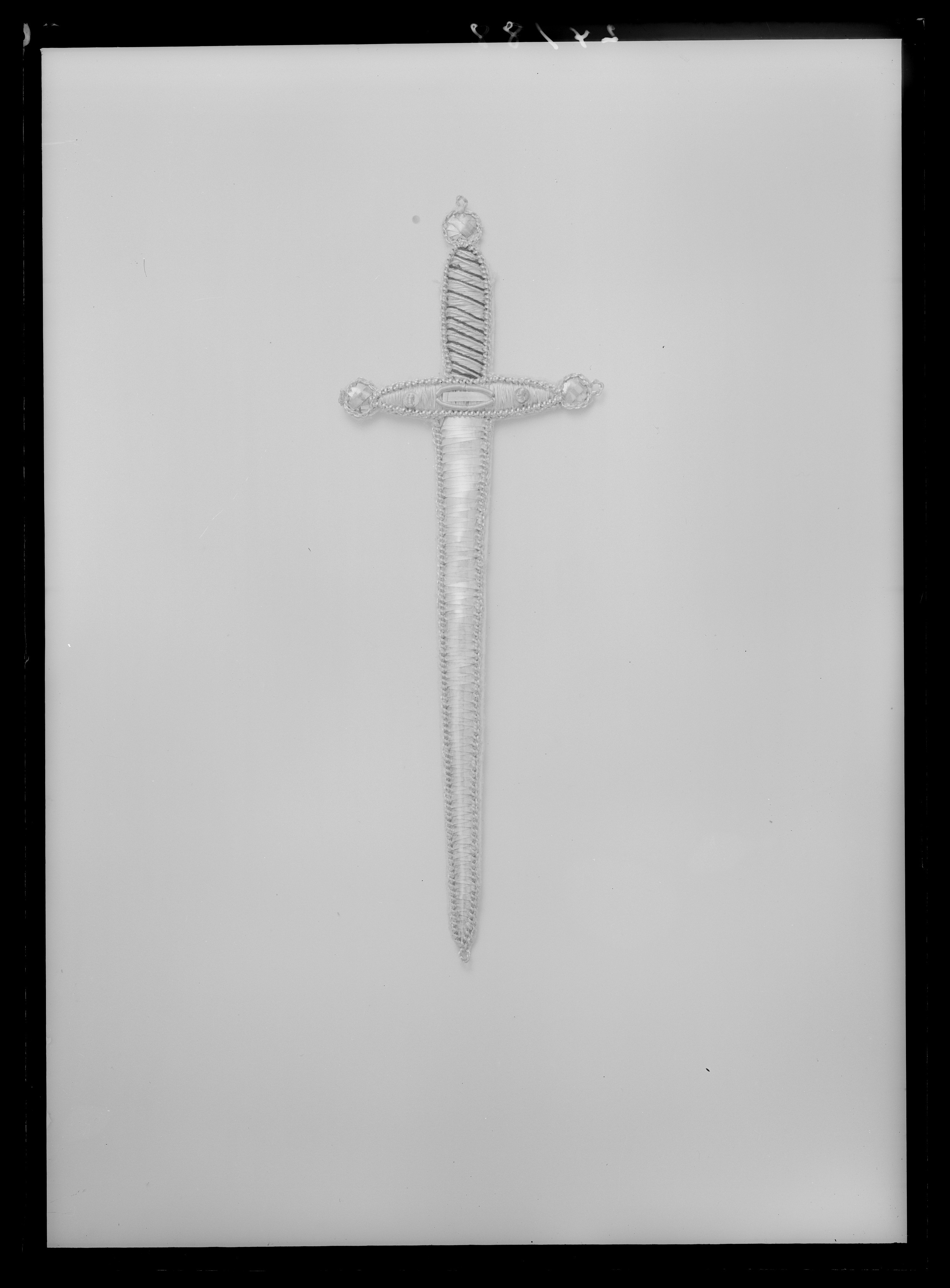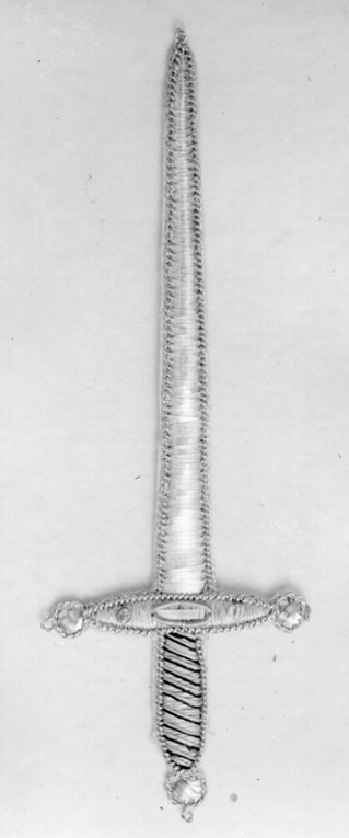 Svärd broderat med silvertråd, -lan och -paljetter, på baksidan vitt papper.