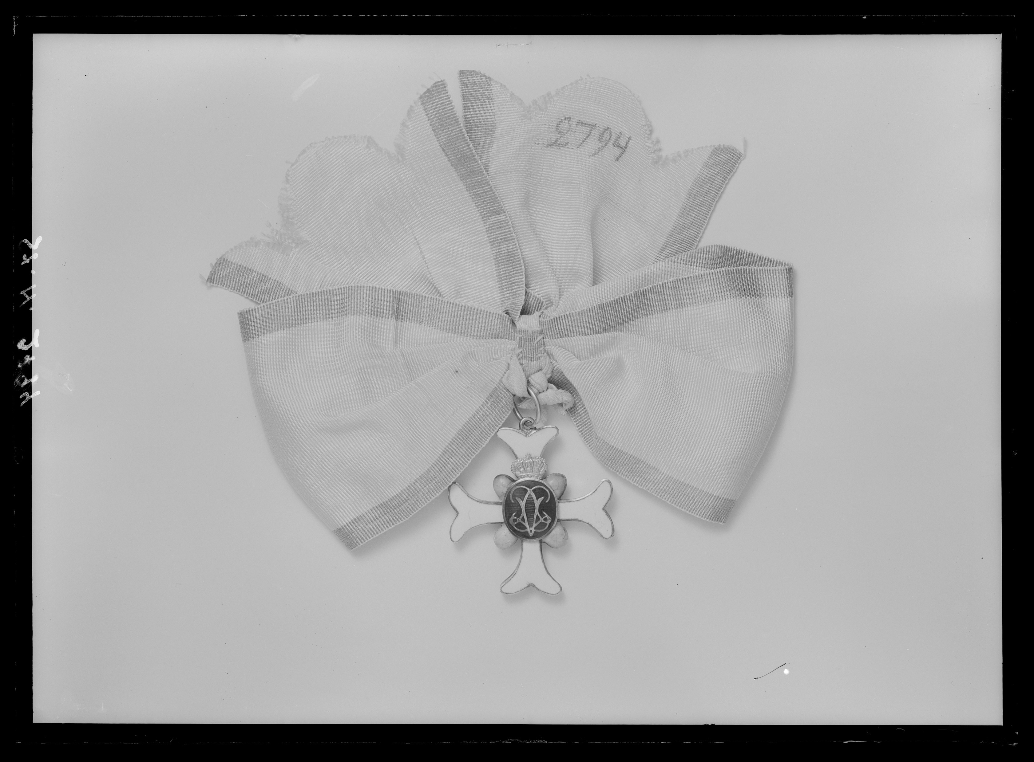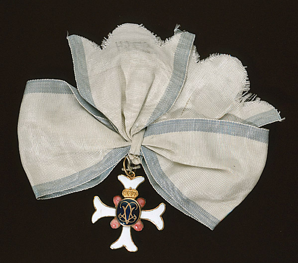 Dubbelsidigt tecken, ankarkors av vitemaljerat guld. Krönt, oval medaljong, täckt med mörkblå emalj, däri namnchiffer av guld: LV (drottning Lovisa Ulrika av Sverige, 1720-1782). Mellan korsarmarna knoppar täckta med rosafärgad emalj. På övre korsarmen ring, däri fäst bandring av guld.