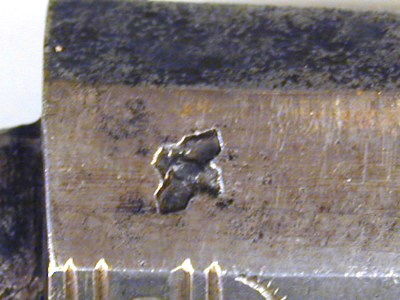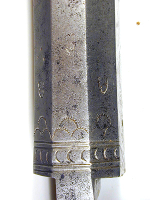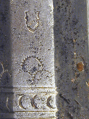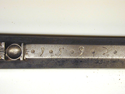 Rund, slätborrad pipa med åttsidig kammare, filad ring vid övergången. Vid pipbasen filad och punsad dekor i form av en bård av två dubbla linjer, flankerande C-punsar, därframför "treberg" av bågar med små korta streck på framkanten. På de tre övre faserna därframför vardera en stämpel i form av sköld med S K över strålande sol (Se Livrustkammarens vägledning 1921:257:1), den till v tydligare än de övriga, mittstämpeln något längre fram än de två övriga. Framför siktet etsad datering " 1592", mellan och på båda sidor om årtalet stämplade solar med mittpunkt. Svagt böjt, baktill tvärt avskuret svansskruvblad. På pipans undersida 395 mm från mynningen en hake, h 110 mm, b: 50 mm, bakkanten med filade hak, nederänden snedfasad. Riktmedel: Från sidan inlaxat ståndsikte med kraftig, rektangulär platta med punsad dekor, på armen därframför en rund skålning. Högt stolpkorn i form av rektangulär platta med åsad överkant. Fästning: Tre häften. Pipan fäst med krysskruv underifrån samt två pipstift av stål, Luntlås med stort, plant låsbleck, vid nederkanten mittpå en otydlig stämpel, möjligen i form av Suhls höna nedanför bokstäver (se Livrustkammarens vägledning 1921:185:1). Rektangulär fängpanna med rakt, rektangulär eldskärm. Fjäderdrivet fängpannelock med tryckknapp med välvt huvud. Hane med nästan ringformig, tunn kropp, kubisk axel med liten knopp. Drakformig klämma, klämskruv med hjärtformigt grepp. Anmärkning: Två låsskruvar. Hävstångsavtryckare med kvadratiskt tvärsnitt framtill, bakåt breddat och övergående i bandformig del med rundad bakäne. Kantig mörkbestad helstock med rak, uppåt avsmalnande kolv med plan ryggås, försänkt, rektangulär platta baktill på kolvens undersida, kolvänden snedfasad mot undersidan. Framstocken femfasad med plan undersida, 350 mm från framänden en ansvällning till kvadratiskt tvärsnitt för haken. Avtryckaren styrs av en 40 mm hög rundad stålbygel.