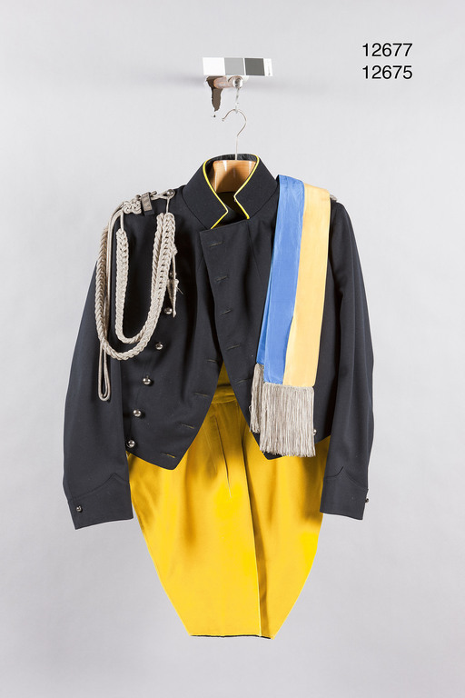 Frack av mörkblått kläde dubbelknäppt med två knapprader om sju halvklotformiga, släta silverknappar, d: 19 mm, sydda på sömmen. Ståndkrage med gula passpoaler, knäppes med två hakar och hyskor. På h. axel en välvd, slät silverknapp, d: 16 mm och därnedanför en hälla med påbroderade silverkantlinjer och silverpaljetter. Därunder tränsar, för fäste av ägiljett nr 12678. På v. axel axelträns nr 12679. På ärmarna uppslag med halvklotformiga silverknappar, släta, d: 11 mm. Skört med sprund upptill två halvklotformiga silverknappar, d: 19 mm. Gula passpoaler insydda i sömmen nedanför knapparna. På skörten fasta slag, gula, möts nedtill. Skörten nedtill rakt skurna. Foder av gul bomullskypert och gult kläde i skjörten. Matelassering maskingjord rutstickning på bröst och sidstycken. Kragen fodrad med blått kläde, kantad med svart siden, framtill slejf och hälla. Ärmarna fodrade med vitt linne med ljusbruna ränder nedtill, i övrigt med vitt linne med smala röda ränder. I skjörten tvärställda fickor med vitt linnefoder. Innerficka på höger sida med etikett: " A. F. Palm // Stockholm // Herr Lurell ". ( Laurell), jfr nr 12676). Upptill i ryggen skrivet i i fodret: " RUDE // 09 // Rudebalk // Rosenblad // Wikner ". I ärmarna hällor. Sydd hos A F Palm för herr Lurell (Laurell ?).