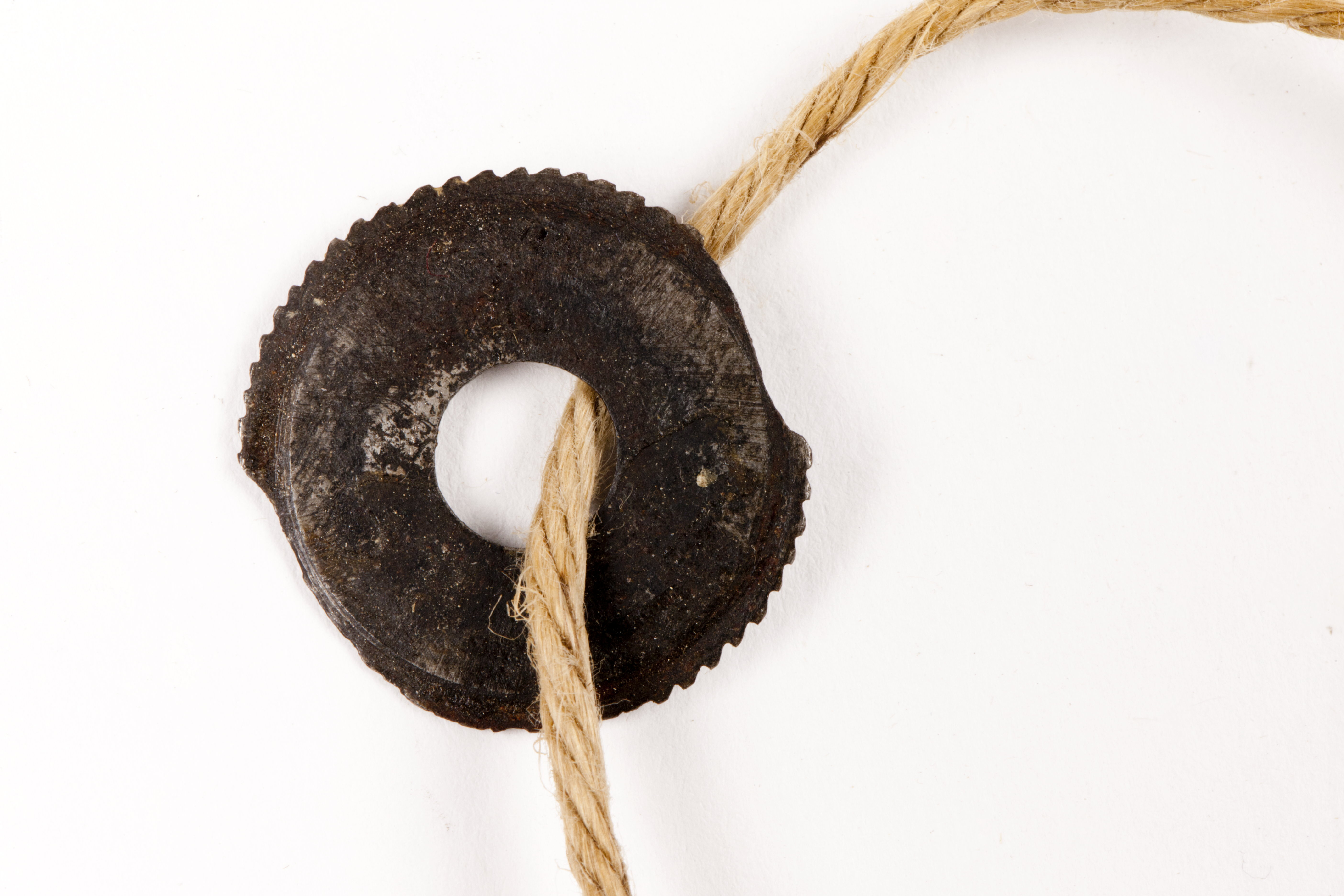 Rund, tjockare mot mitten. Tvärgående tänder. Hålets diam 7,5 mm. Stämplad med en punkt.