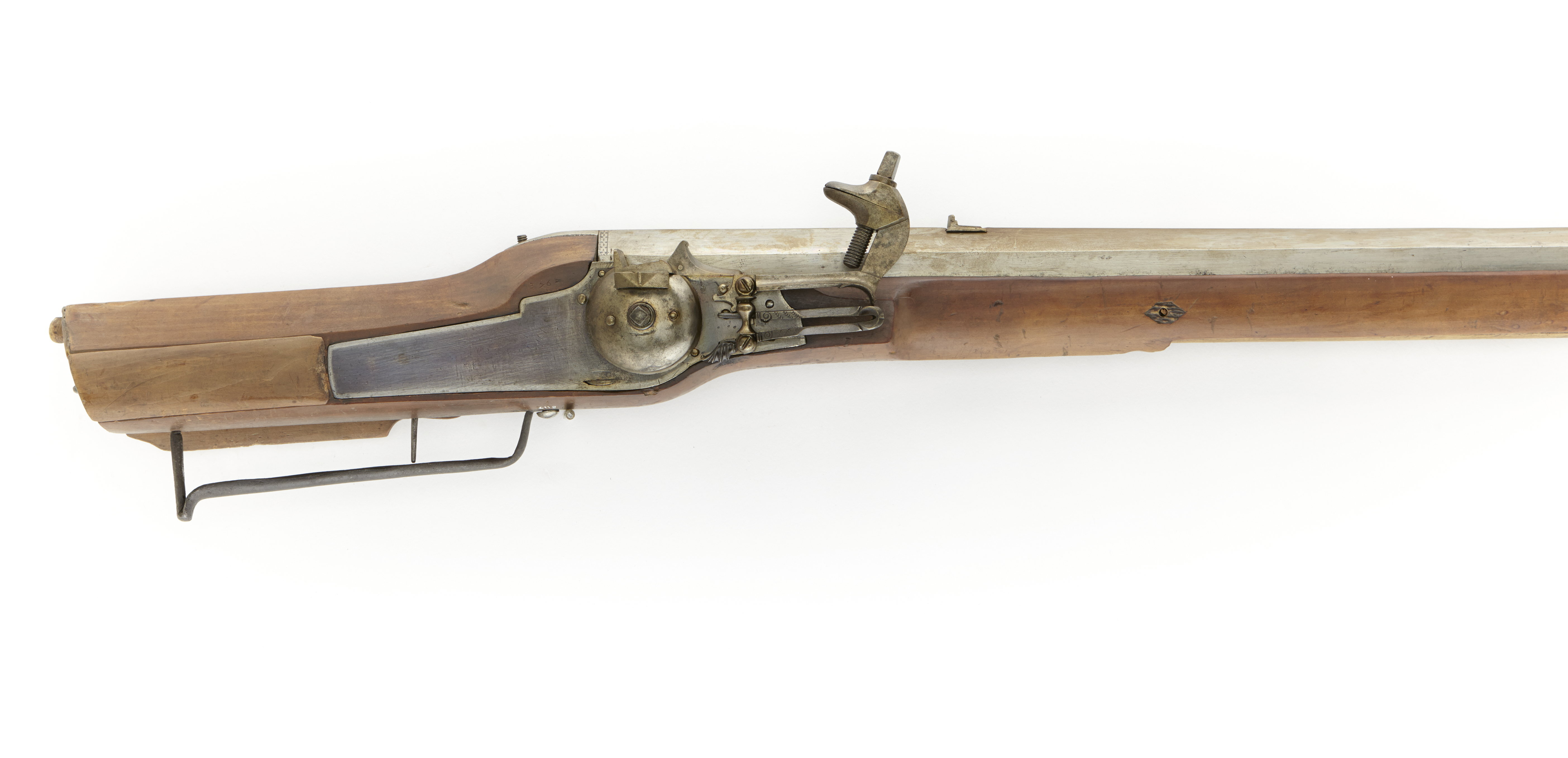 Sexkantig svinryggspipa av stål. Slätborrad. En siktskåra går längs med hela svinryggen. Ståndsikte av stål på vars framförliggande platta är graverat: "CM(L?)". Knoppkorn av koppar. Tre piphäften. Hjullås. Blånerat låsbleck av tysk typ - bakåt avsmalnande genom två fall. Blankpolerade kanter. Hög, kullrig hjulkapsel. Låg, vertikal krutkärm. Hane med lös underkäke och tresidiga käkar. Utan fingergrepp. Hel stock av ljust trä, tysk kolvtyp. Bakplåt och stödkula av horn. Stocken är slät och har endast dekor i form av hjorthornsbrickor vid låsskruvar och pipstift. Främre pipstiftet är i form av en skruv med bygel. Näsband av hjorthorn. Trågformig s.k. holsteinsk varbygel. Tillbehör : Laddstock med doppsko av ben. Märkt: 376 ovanför låsblecket, stanstyp 5376. 120 med blyerts på anslaget. Enligt 1710 års inventarium p. 11, rum II: "11-376-1 D:o (Swinrygg) med Blanck pijpa"