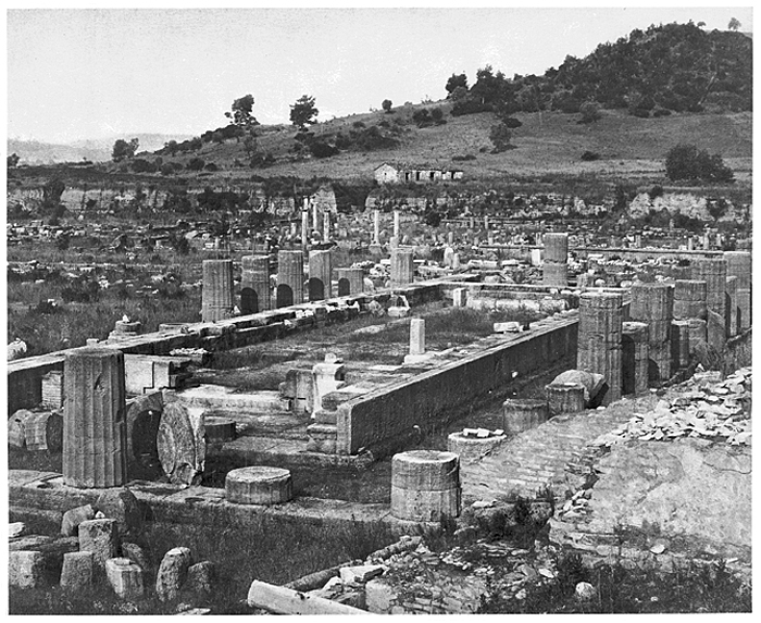 Jupitertemplet i Olympia, Grekland. Foto från resa genom Grekland, Makedonien och Serbien, 15 mars-6 juni 1896. Fotografierna LXVI:K.18.-147. är köpta av Wilhelmina von Hallwyl, f. Kempe på Korfu samt i Patras, Nafplion, Aten, Thessaloniki och Belgrad. Med på resan var maken Walther von Hallwyl och fröken Ida Uhse. Uppgifterna kommer från Ida Uhses reseanteckningar.