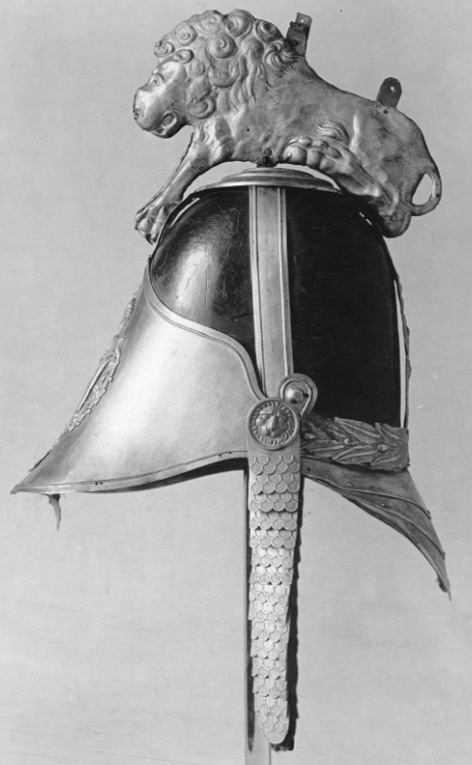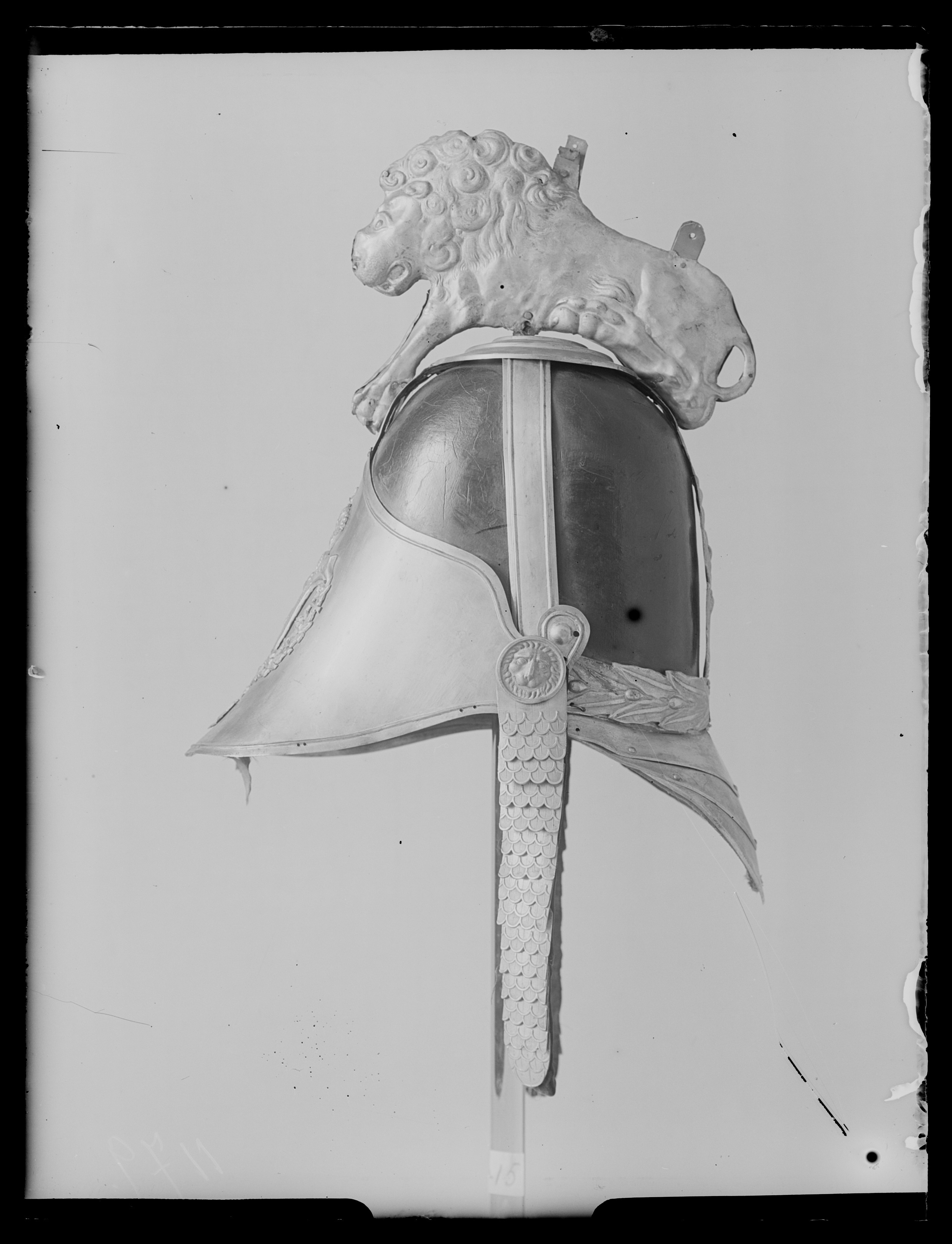 Kask för Livdrabantkåren. Kask av svartlackerat läder med beslag av förgylld mässing. På framplåten finns fäst Riksvapnet med en krönt sköld med tre kronor inom serafimerordens kedja med ordenskors. Kasken har en kam i form av ett lejon med lockig man. Lejonet är sammansatt av två delar av plåt med mönstret pressat i relief. Lejonet ligger med framsträckta framben och bakbenen uppdragna mot kroppen. Baktill på kasken finns en tredelad nackplåt. Fyra byglar går från kaskens nederkant till dess topp där de hålls samman av en rundel i tre avdelningar (ca. 11,5 cm i diameter), varpå lejonet vilar. Bygeln baktill (ca. 3,4 cm bred), liksom ett band längs kaskens nederkant baktill, har inpressad dekor i form av parvis ställda lagerblad och bär. Övriga tre byglar är släta med en upphöjd rand i var sida. Hakrem med fjällformade beslag, bredast upptill (ca. 3,6 cm) och avsmalnande nedåt (ca. 2,7 cm). Remmen har foder av brun sammet och med en hake och hyska påsytt i änden. Ett runt beslag dekorerat med ett lejonhuvud (ca. 3,2 cm i diameter), finns där hakremmen är fastsatt. Foder/innerhuva av brunt tunt läder. Huvan är öppen på hjässan, avslutad med flikar, i var flik finns ett hål där ett band kan dras igenom, med bandet regleras vidden/storleken. Skärm och bakstycke har foder av blått siden. Längs kaskens nederkant är sytt ett svart band. Jämför med Armemuseum inv.nr 13154 och 70521; beslag av förgylld mässing, likadana som Lrk inv.nr 22205-08, 22351-68 och 28493.