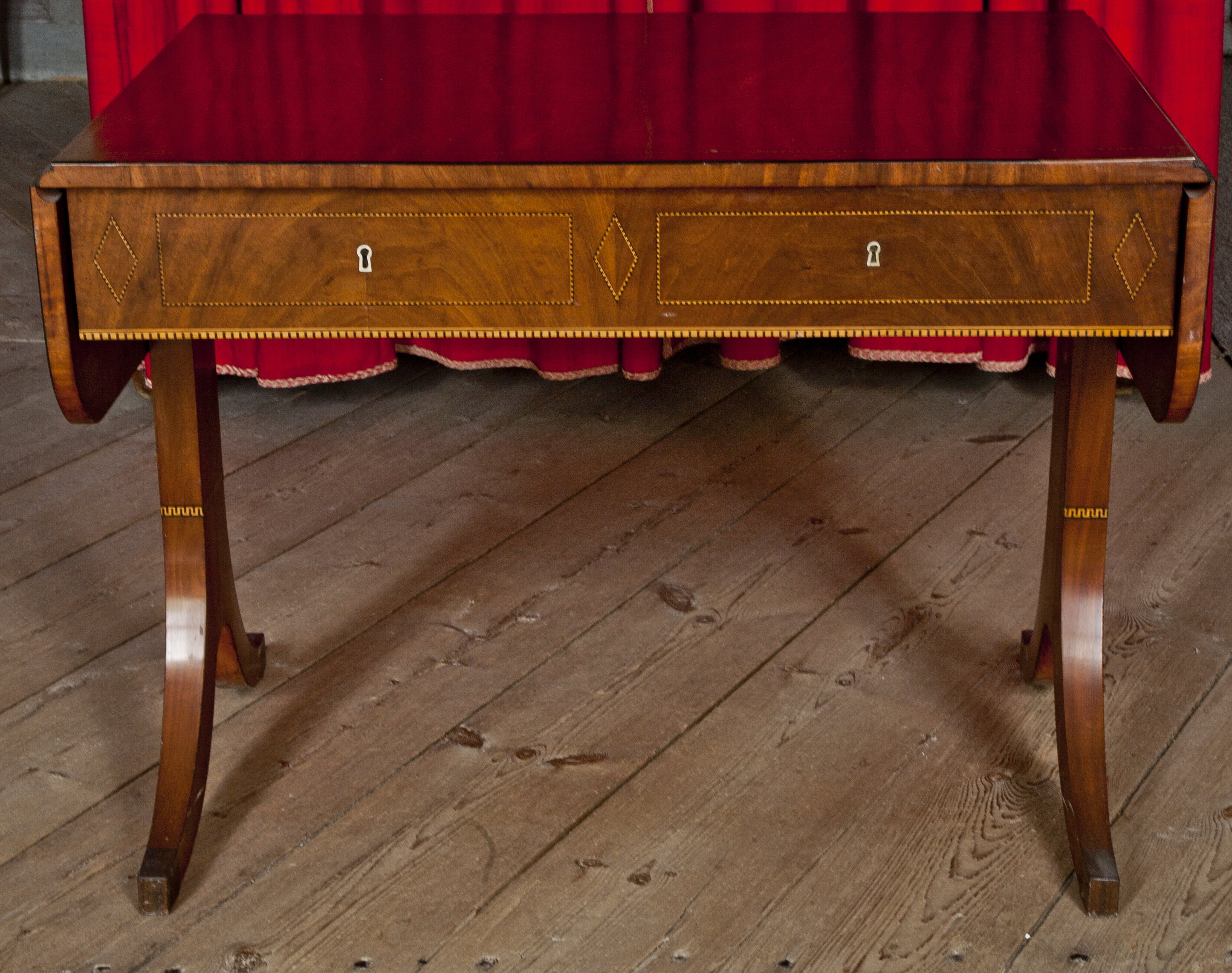 Rektangulär skiva, vid gavlarna fällbara skivor med rundade hörn. I kanten smal rundstav av ebenholts. Inlagda, smala lister av ebenholts och buxbom. Två rektangulära ben med utsvängda fötter. På ena sidan två draglådor, på den andra blindlådor. Nyckelhålsskoningar av ben.
