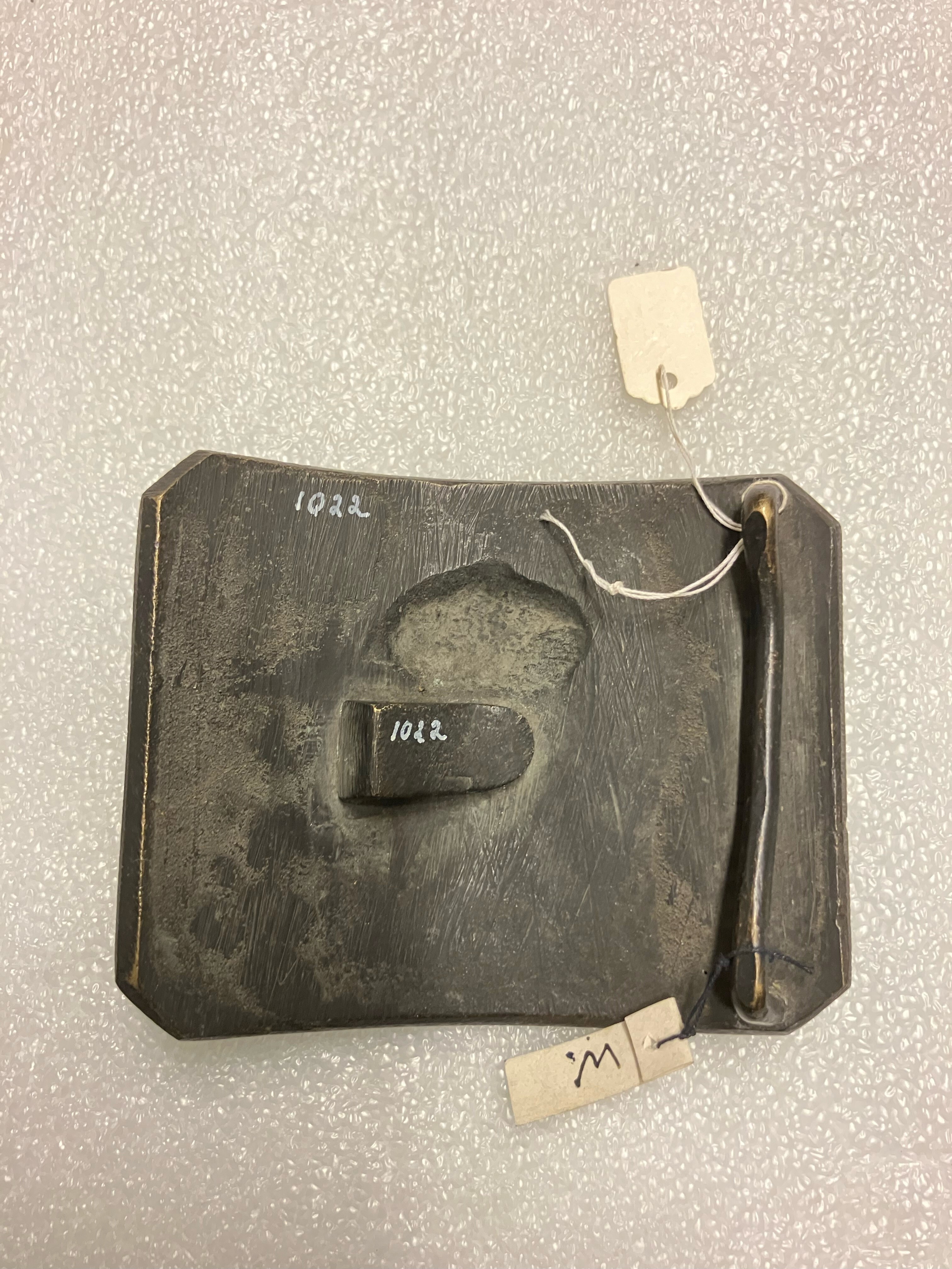 Rektangulär, böjd plåt av mörkanlöpt (oxiderad) mässing med snidad reliefdekor i form av bladbård utmed kanterna. I mitten ett N under sluten krona. På insidan oval hake samt utmed ena kanten smal bygel.