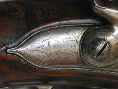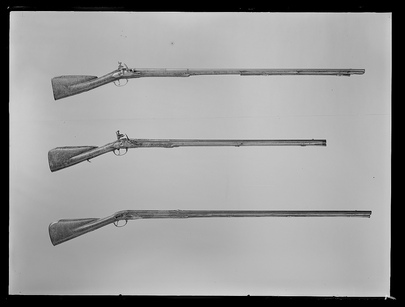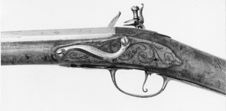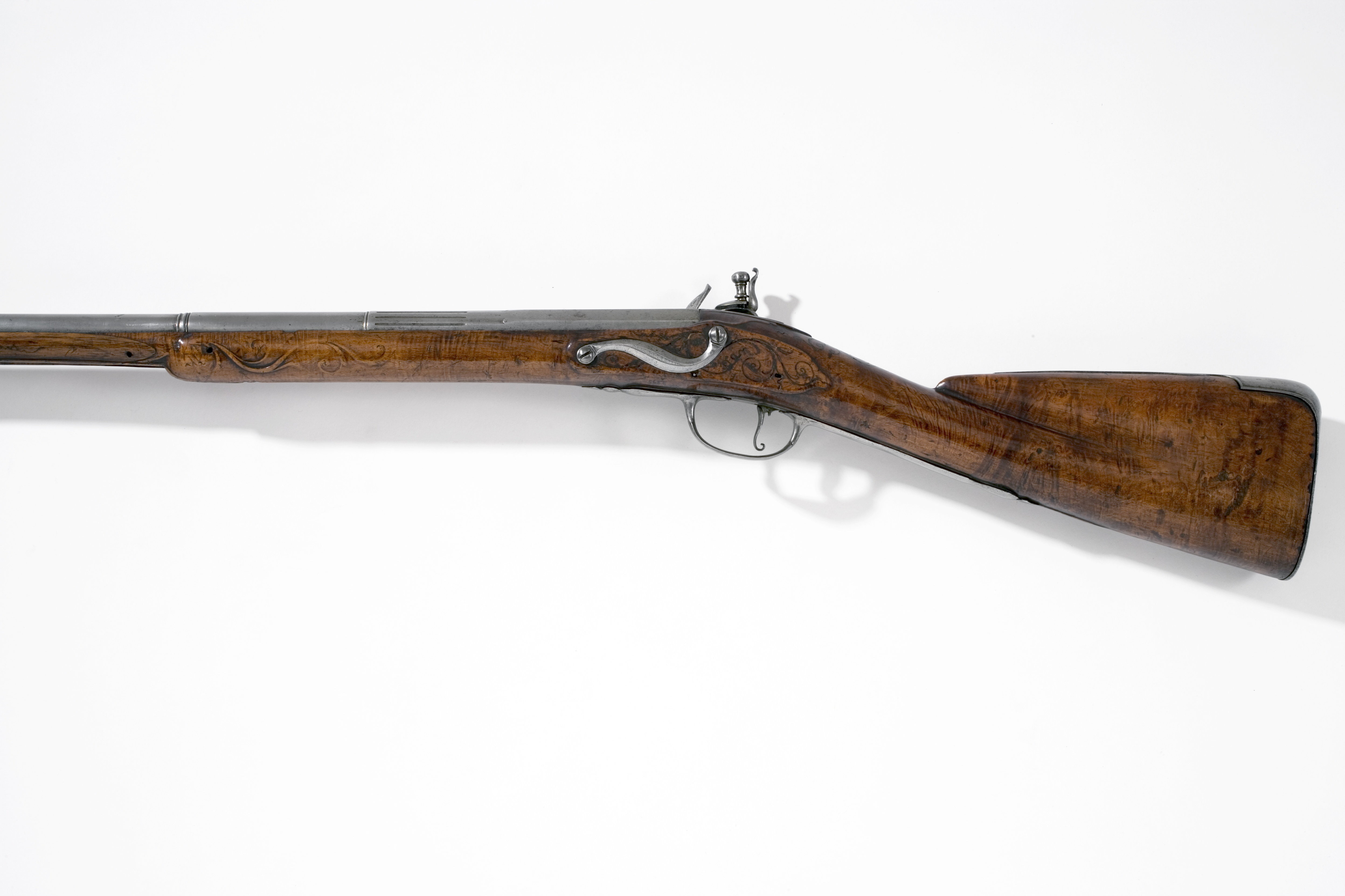 Rund, vid kammaren åttsidig pipa av stål, sextonsidigt övergångsparti, på kanterna räfflor. Pipan rund i piprännan. Riktmedel: Lågt, spolformigt sikte av silver. Fästning: Pipan fäst med krysskruv samt tre (utspr. fyra) pipstift av trä. Flintlås med välvt låsbleck, l: 146 mm, graverad, grotesk dekor, bakom hanen en sittande stockmakare (?), framför hanen en grotesk herm som bär fängpannan. Graverad signatur: "BOVLAR A ANGERS". Rundad hane, motstöd på hanhalsen, lös överkäke. Fästning: Två låsskruvar. Helstock av valnöt, enkel, snidad dekor vid rörkor och varbygel. Runt svansskruvbladet och sidblecket rankdekor inlagt med till största delen bortfallen silvertråd. Beslag av stål, bakplåt med lång tunga på kolvryggen, varbygel med lång, bakre arm och kortare främre arm. Ovalt avtryckarbleck, s-formigt sidbleck med fasade kanter, graverad dekor av olika cirklar. Två rörkor, spetsrörkan saknas. Tillbehör: Hornskodd laddstock, 1: 546 mm (avbruten).
