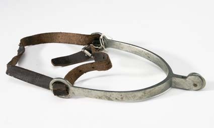 Sporre av försilvrad nickel (?) med U-formade skänklar med rektangulärt tvärsnitt, ändarna vidgade och genombrutna i två halvcirkelformade hål, på insidan mitt för halsen stämplat: "NICKEL SILVER". Hals kort, vidgad med klinga i form av trissa.