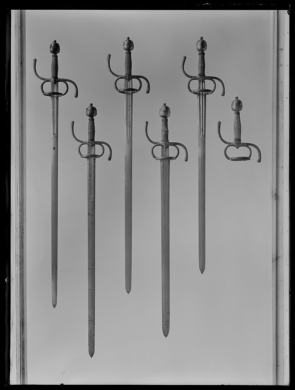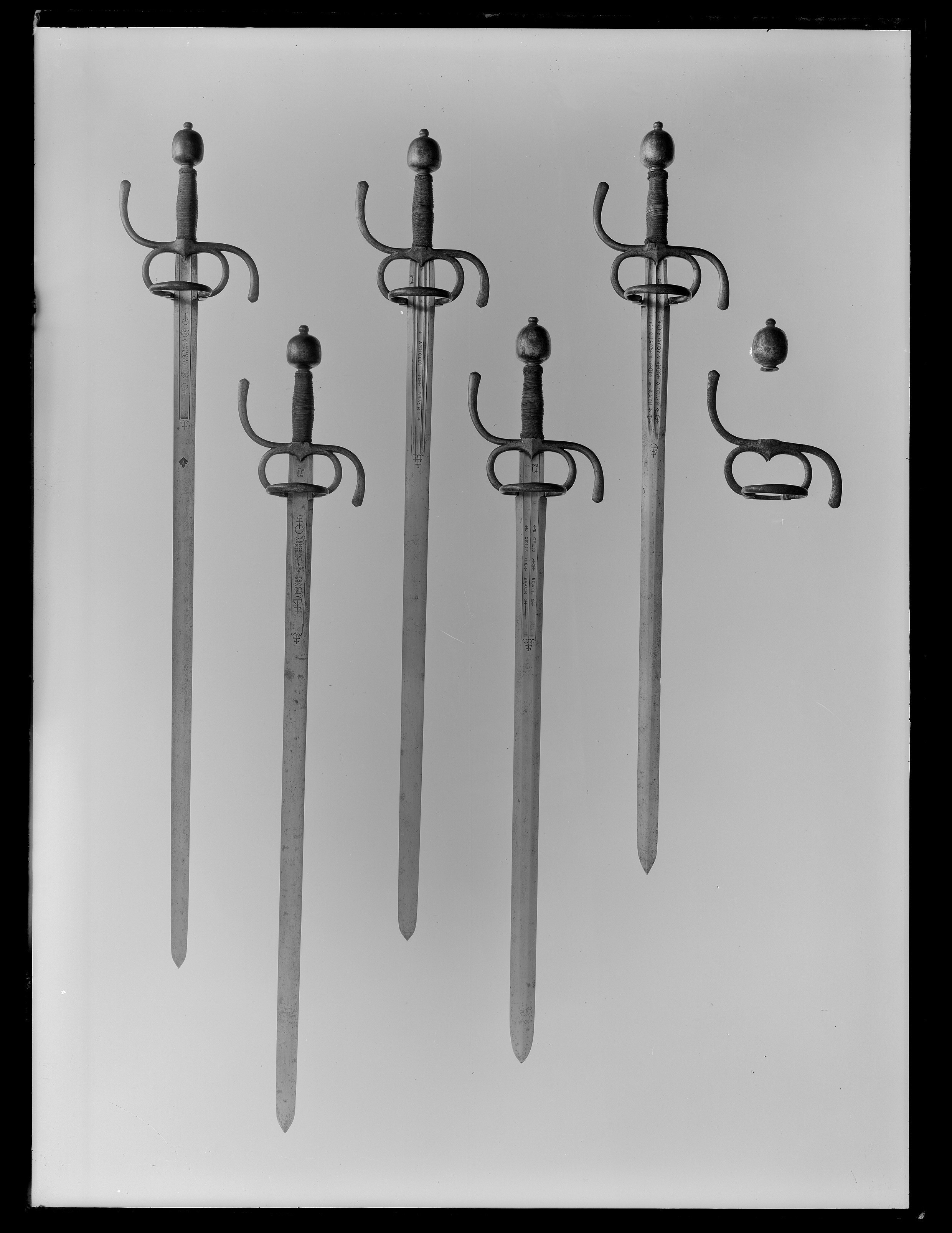 Fäste av slätt, förgyllt stål med hög, oval knapp, rund, upptill plan nitknapp. S-formiga parerstänger, stora fingerbyglar och på utsidan en oval och på insidan en liten, rektangulär bygel.