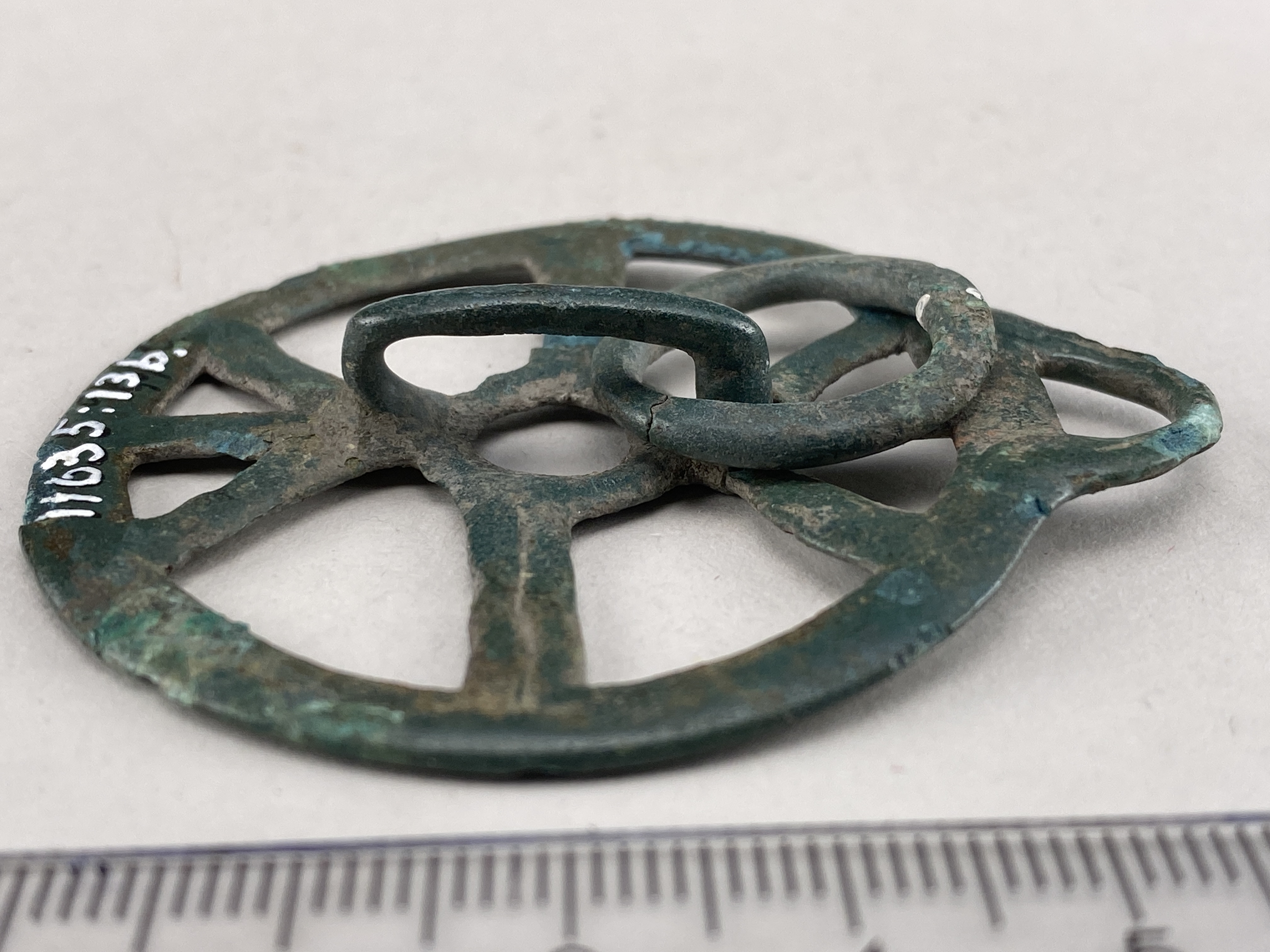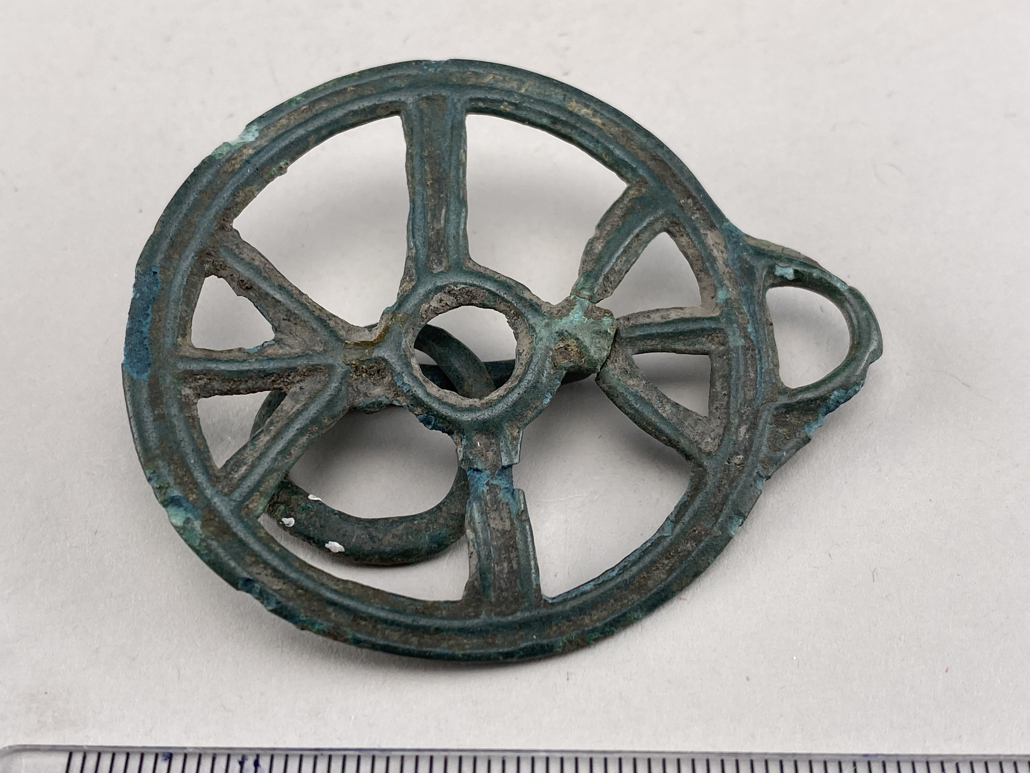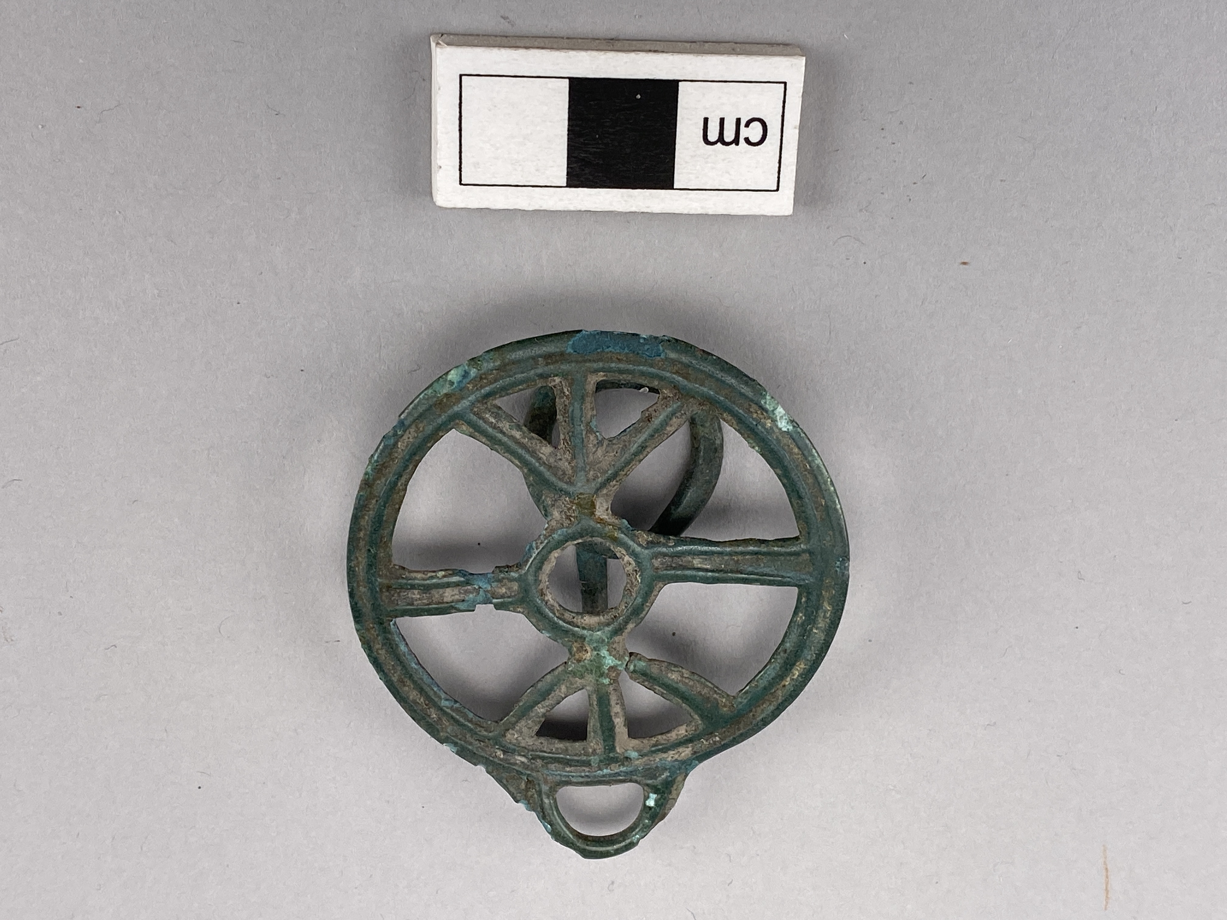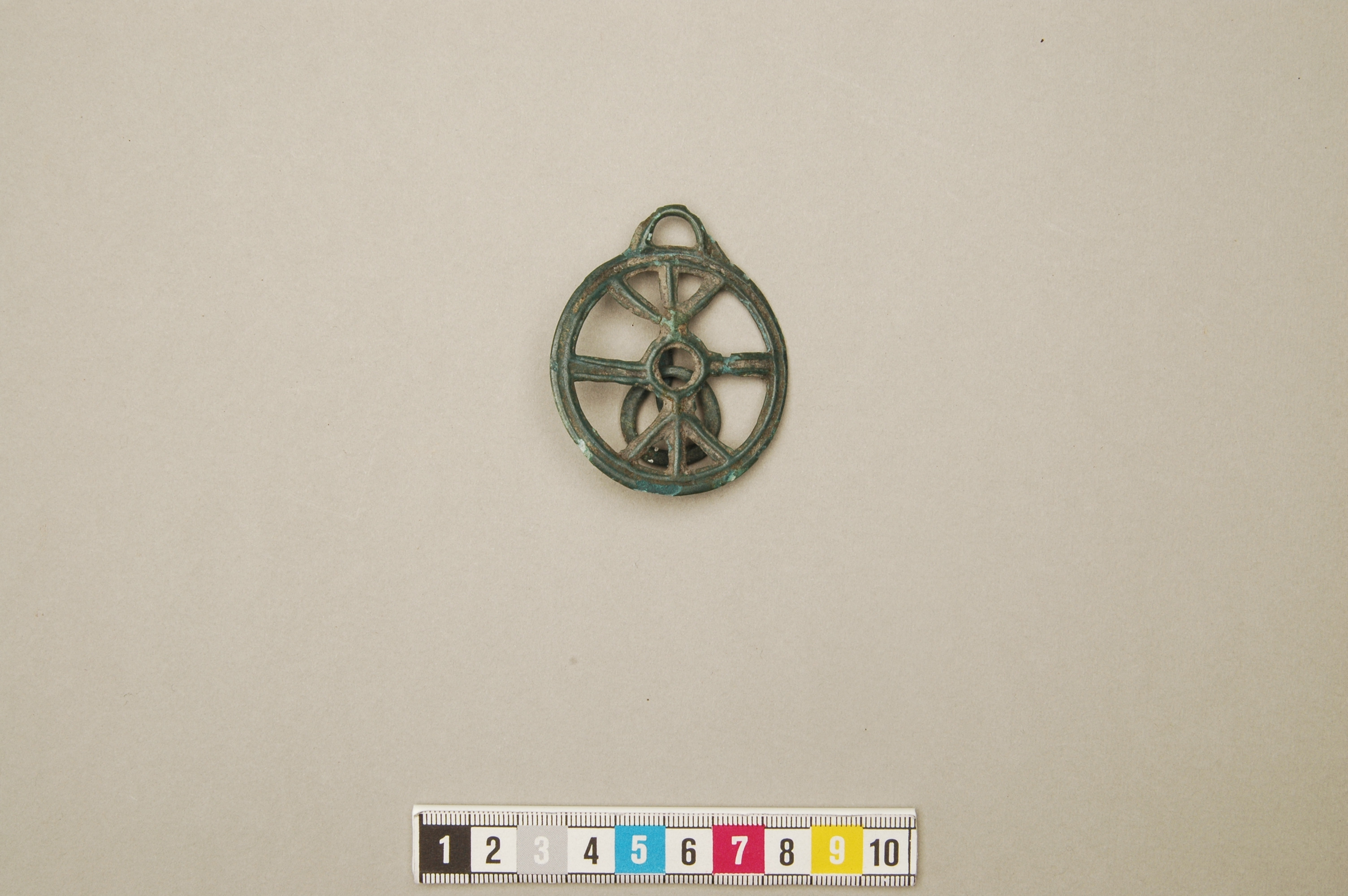 Hängprydnad av brons, genombruten, hjulformig, med ögla och ring på baksidan. "Hjulet" har fyra ekrar, därav två med sidogrenar.