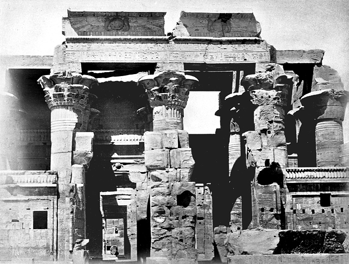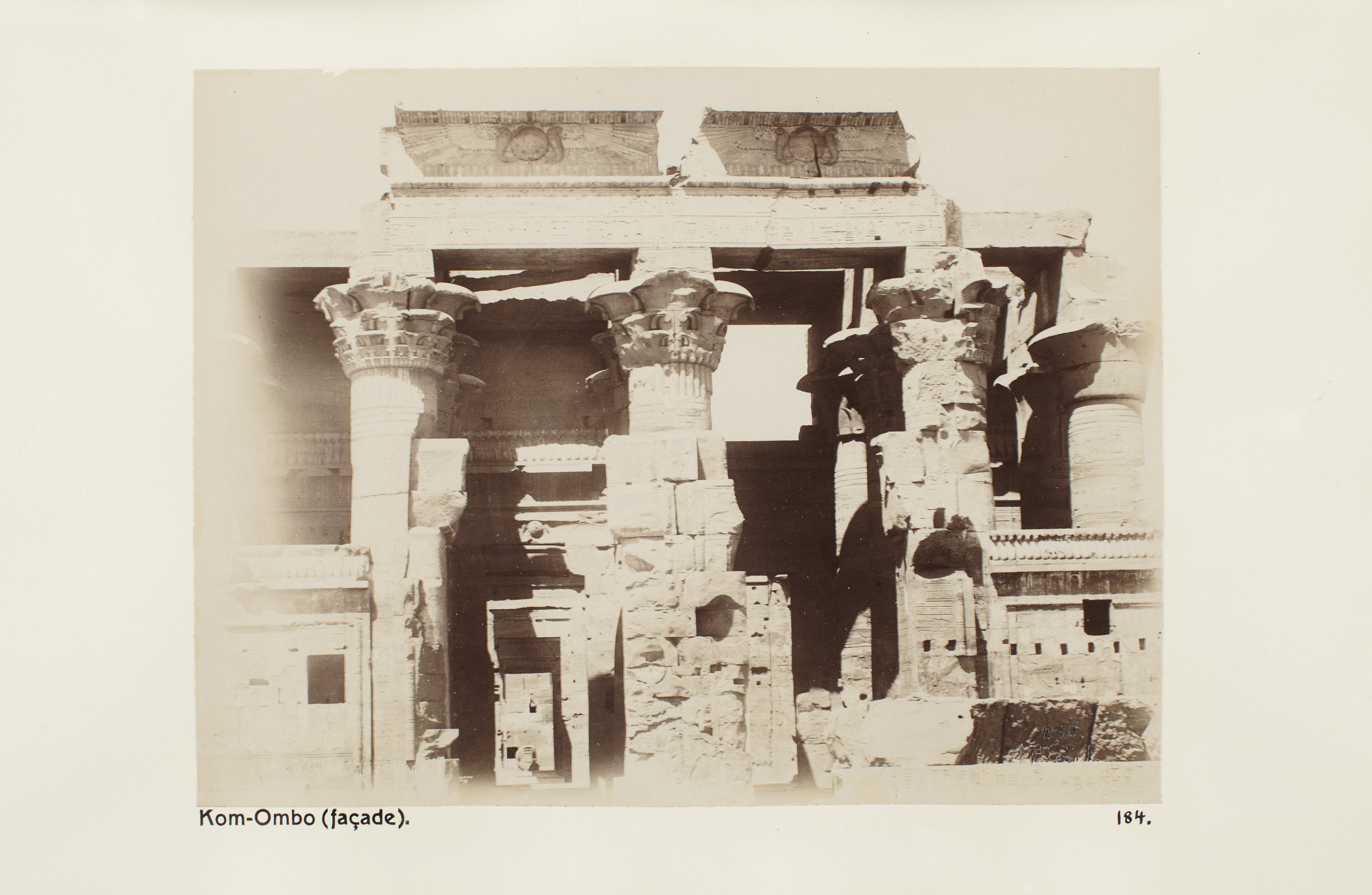 Kom Ombo, Egypten. Fasad. Text på fotografiet: Kom-Ombo (façade) Fotografierna LXVI:M.01.- 201. kommer från resan till Egypten och Sudan som Wilhelmina och Walther von Hallwyl gjorde vintern 1900-1901. De lämnade Sverige den 5 november 1900 och fortsatte från Egypten till Palestina den 28 mars 1901. Med på resan var döttrarna Ellen med maken Henric de Maré och Irma med maken Wilhelm von Geijer. Wilhelminas sällskapsdam, fröken Ida Uhse reste också med. Under en del av resan anslöt sig ledamoten av Internationella domstolen i Kairo, assessorn Otto Conrad Waldemar Cedercrantz med makan Anna Elisabeth. Vid resan uppför Nilen hade Walther von Hallwyl hyrt ångfartyget Columbia med besättning. Båtresan startade i Kairo 27 december 1900, gick ända till Wadi Halfa varifrån man reste vidare med tåg till Khartum och tillbaka till Wadi Halfa. Båten vände åter i riktning mot Kairo, men det verkar som att sällskapet tog tåg sista biten, från Luxor. Henric och Ellen de Maré samt fru Cedercrantz lämnade båten redan då de passerade Luxor första gången. Resten av sällskapet återvände till Kairo den 1 mars. Fotografierna LXVI:M.01.-120. togs av resenärerna själva, de största av Ellen de Maré, de mellersta av Wilhelmina von Hallwyl och de minsta av Wilhelm von Geijer. Resten köptes av professionella fotografer i Kairo, de flesta från Studio Photogr. Artistique G. Lekegian & Cie. Alla uppgifter kommer från Ida Uhses reseanteckningar.