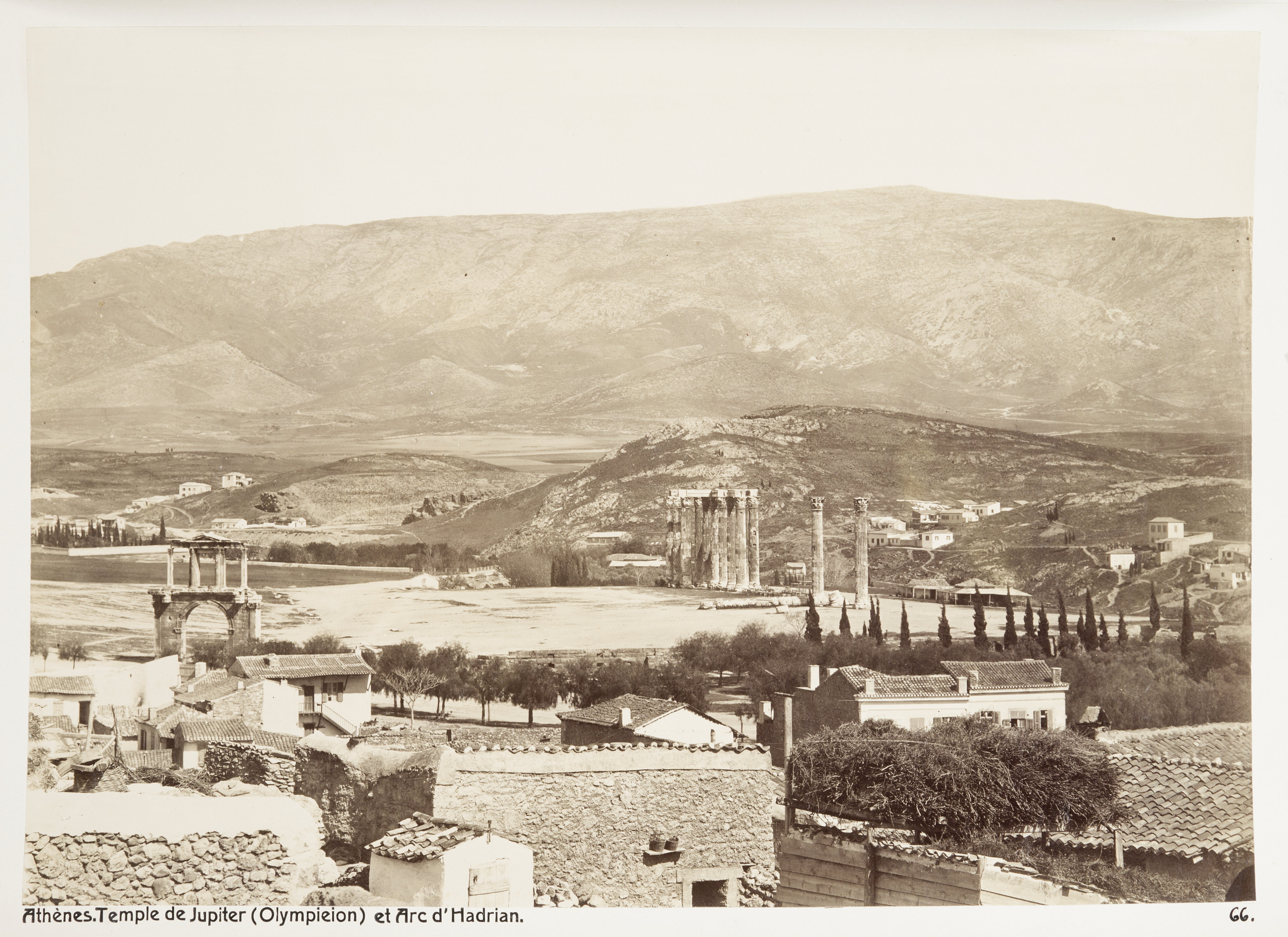 Zeustemplet och Hadrianus triumfbåge i Aten. Text på originalet: "Athènes. Temple de Jupiter (Olympieion) et Arc d'Hadrian." Foto från resa genom Grekland, Makedonien och Serbien, 15 mars-6 juni 1896. Fotografierna LXVI:K.18.-147. är köpta av Wilhelmina von Hallwyl, f. Kempe på Korfu samt i Patras, Nafplion, Aten, Thessaloniki och Belgrad. Med på resan var maken Walther von Hallwyl och fröken Ida Uhse. Uppgifterna kommer från Ida Uhses reseanteckningar.