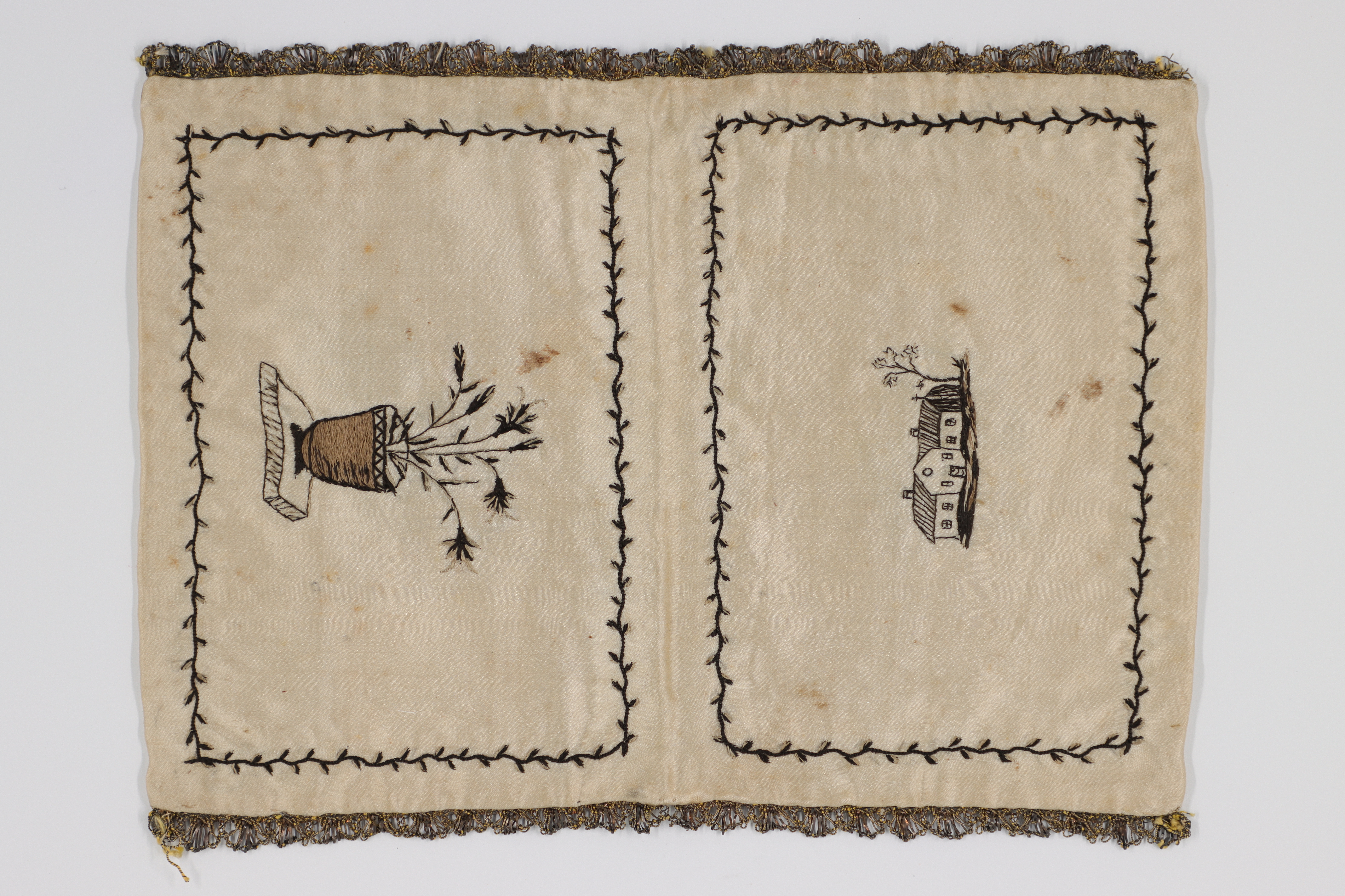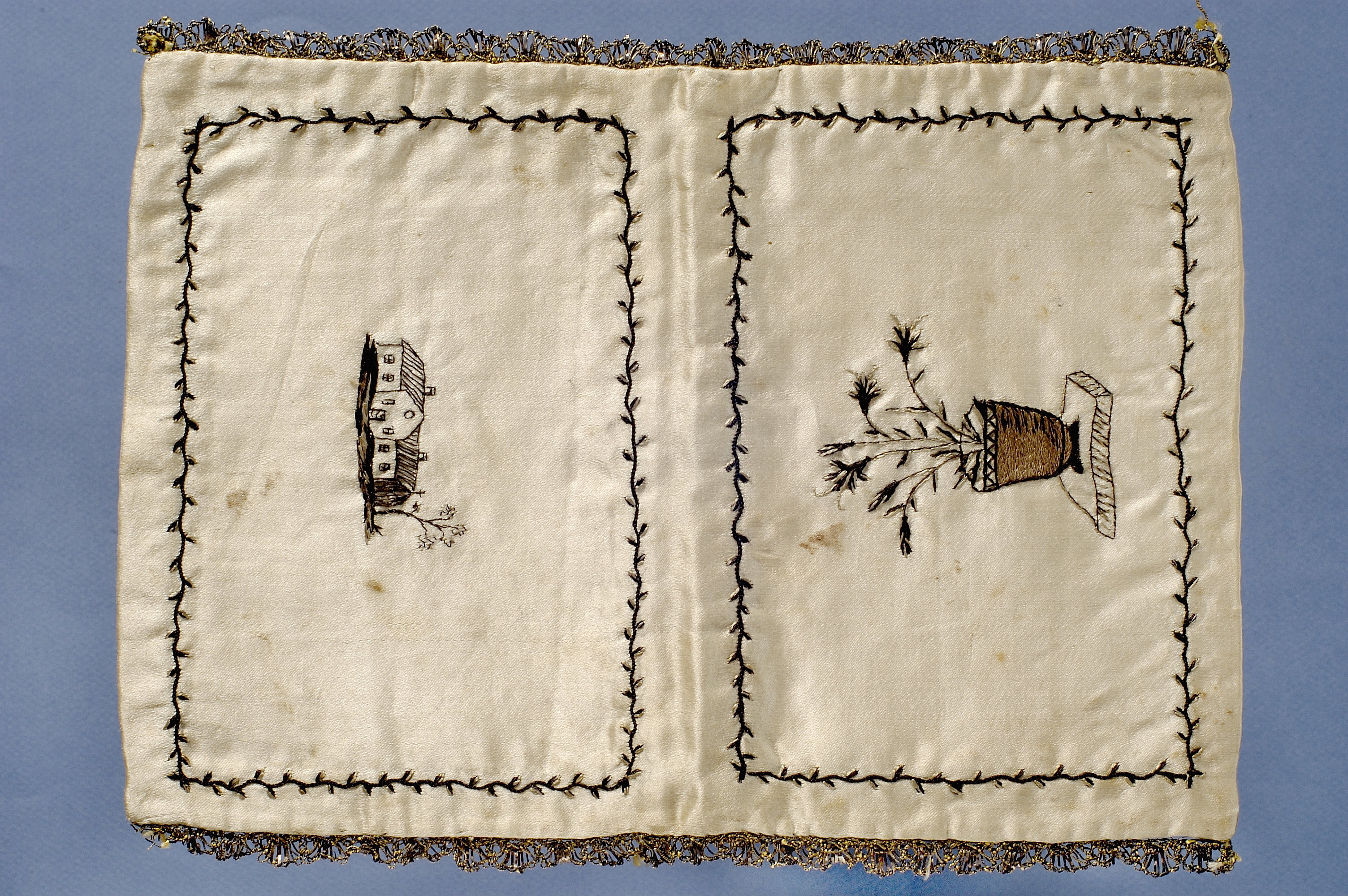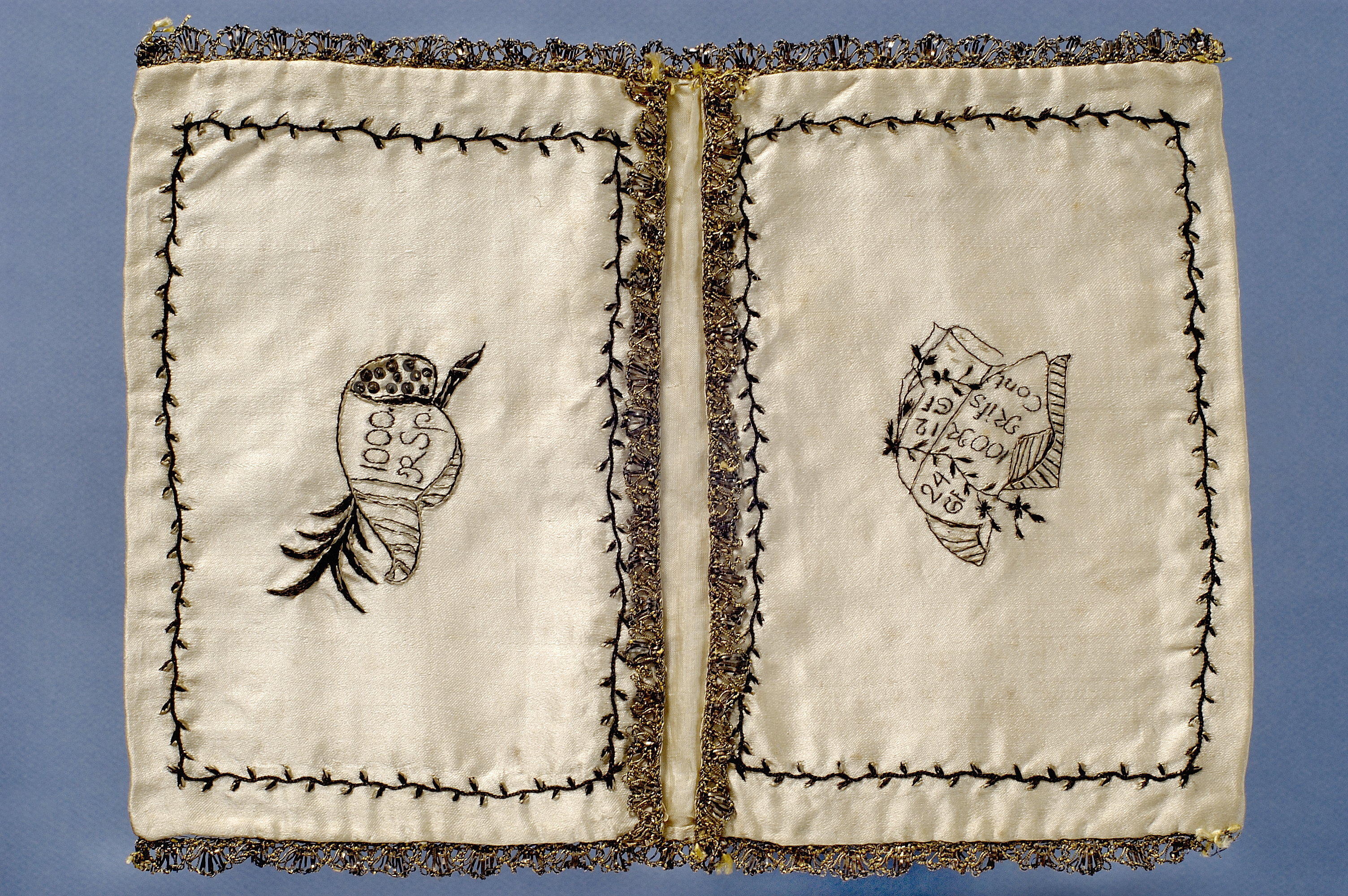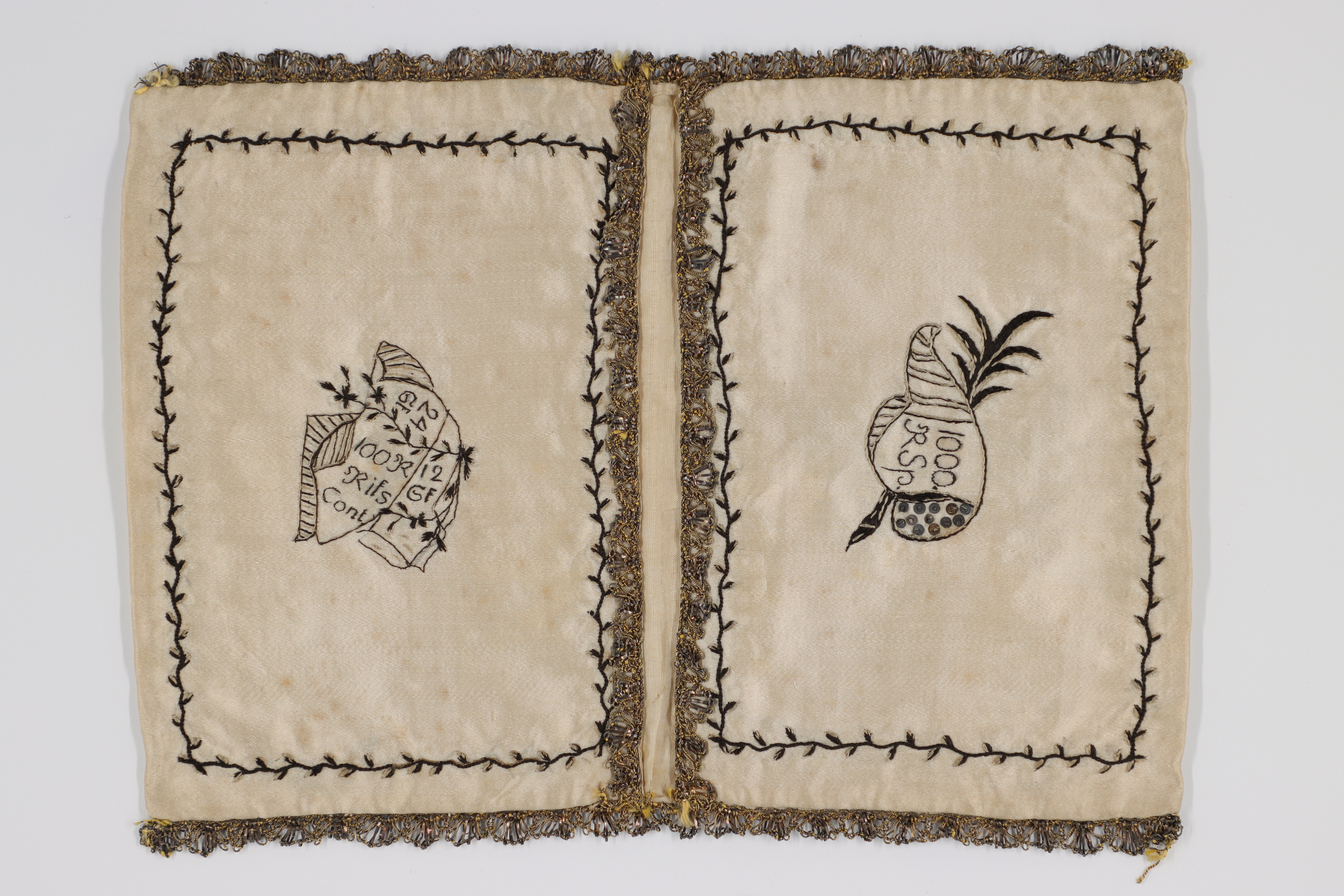 Plånbok av gulvitt atlassiden med broderier i svart och vitt. Kantad med spets av metalltråd. På utsidan motiv av en blomvas på ena sidan och två hus på den andra. På insidans ena ficka en figur med texten 100 R Riks Cont, 24 GF, 12 GF. På andra fickan en annan figur, möjligen en snäcka, med texten 1000 R Sp. Fickorna fodrade med gulvitt siden.