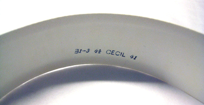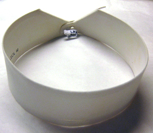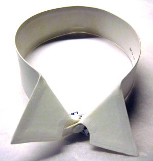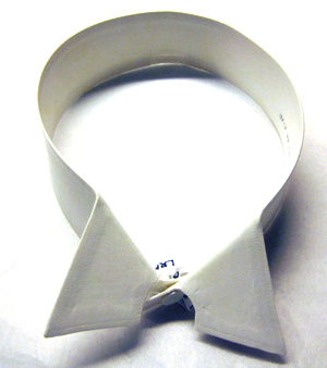 Löskrage av vit stärkt bomull, b. 40 mm, tillskuren med två spetsflikade snibbar mitt fram. Kragen knäpps mitt fram med en liten vit plastknapp. Baktill i nederkanten sitter ett horisontellt knapphål för att knäppas i skjortan. På insidan står stämplat med svart: "B1-5 4 1/2 CECIL 41".