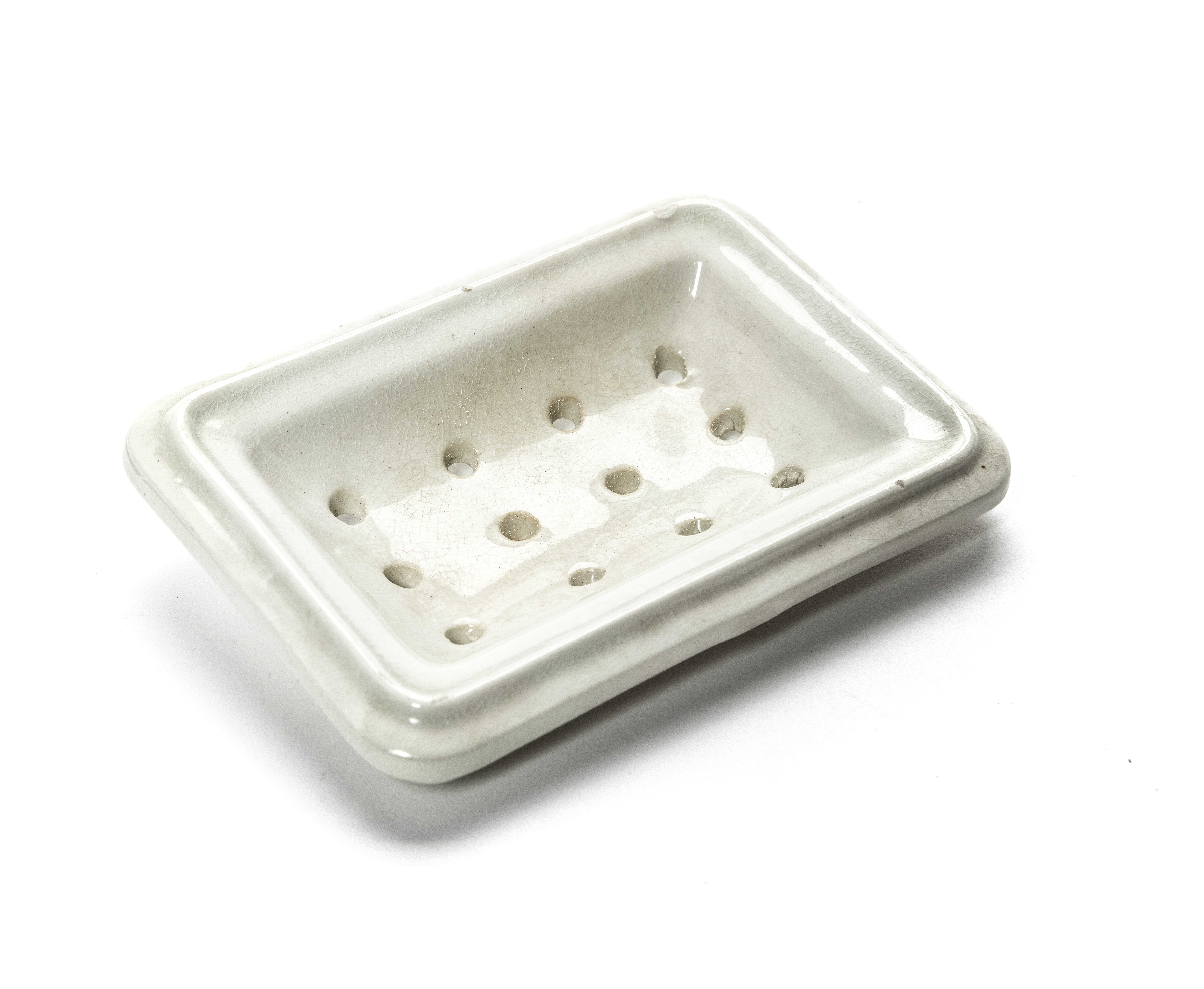 Rektangulär tvålkoppsil av vitglaserat flintporslin.