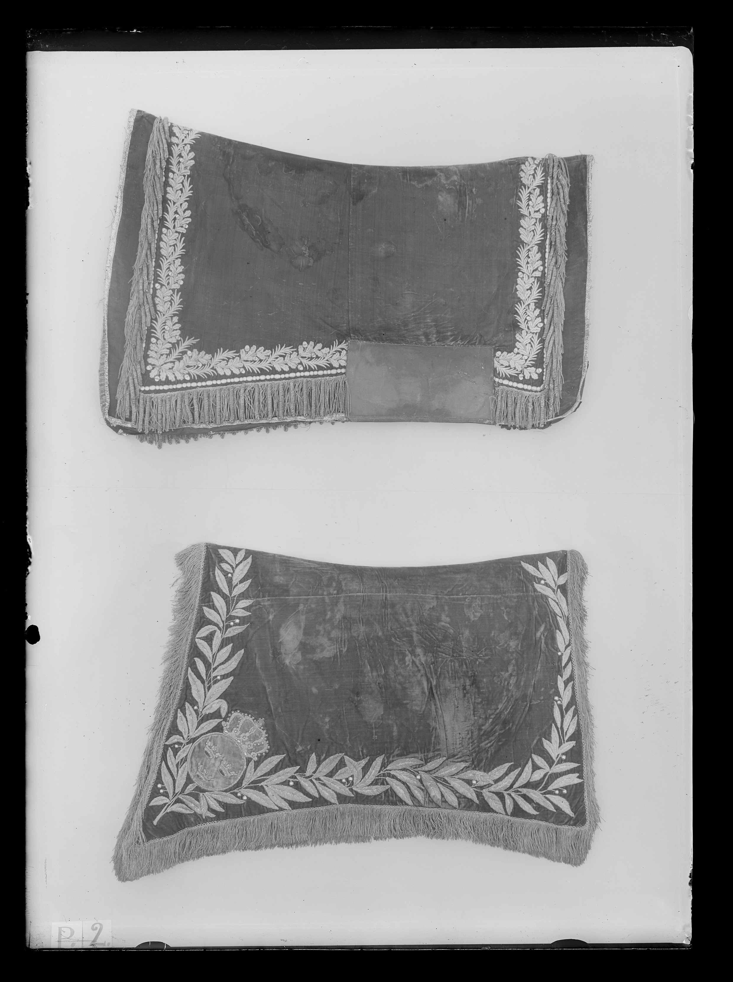 Schabrak av röd sammet, kantad med guldgalon samt frans av guldtråd och buljoner. Guldbroderi i form av bård med bland annat eklöv, naturalistiskt formade ekollon och inslag av paljetter. Mellan bården och fransen smal ögleformad rad av guldtråd och lan. Nedtill, vid ryttarens ben, rektangulär förstärkning av brunt skinn, 300 x 150 mm. Foder av blå-vitrandigt linne, delvis täckt med svart vaxduk.
