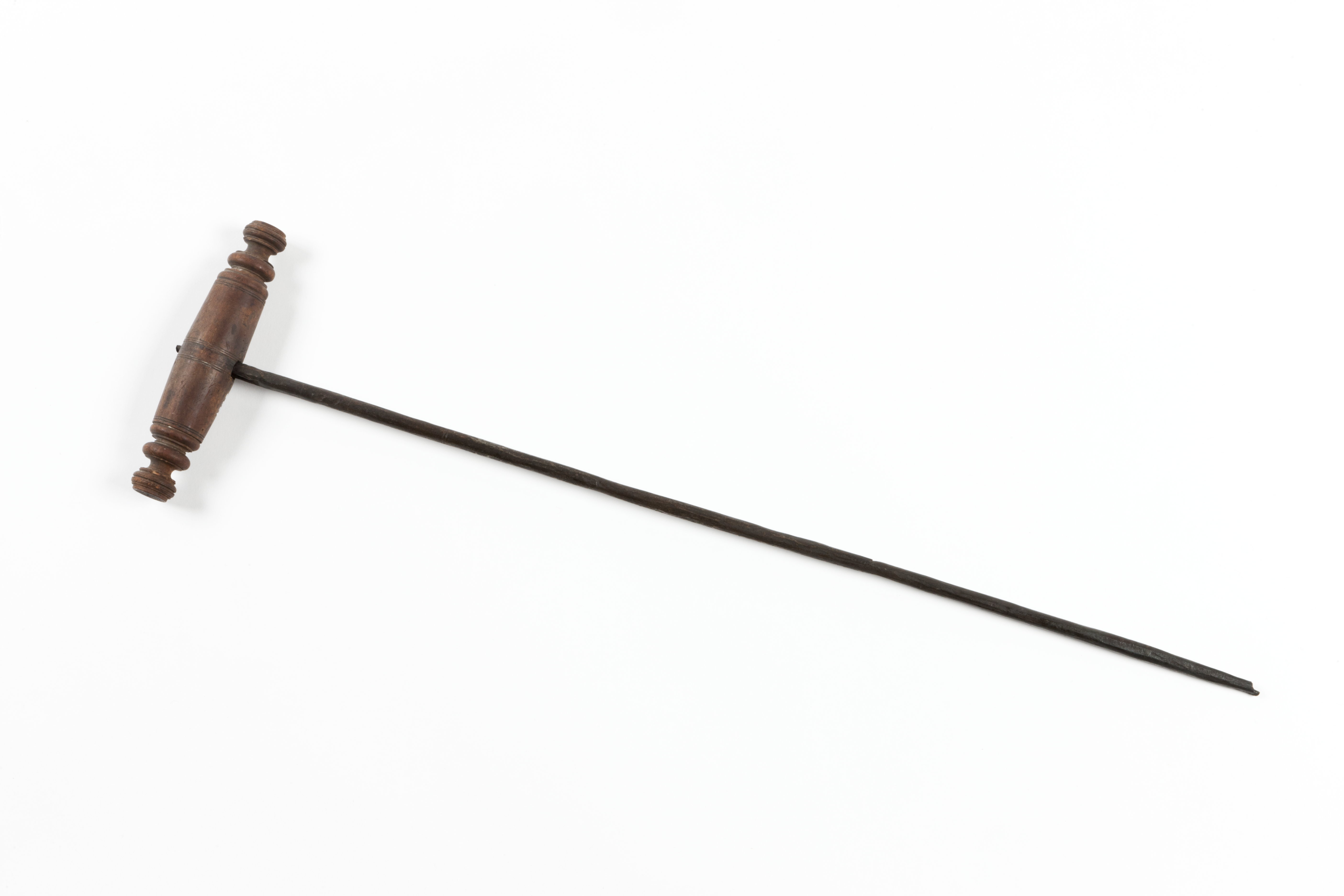 Stålet svartsmitt med rund genomskärning. Svarvat och profilerat handtag av päronträ.