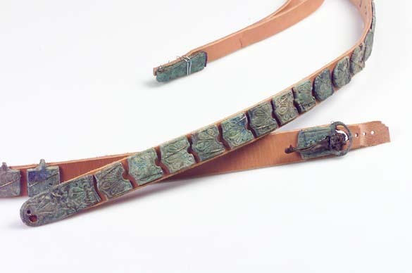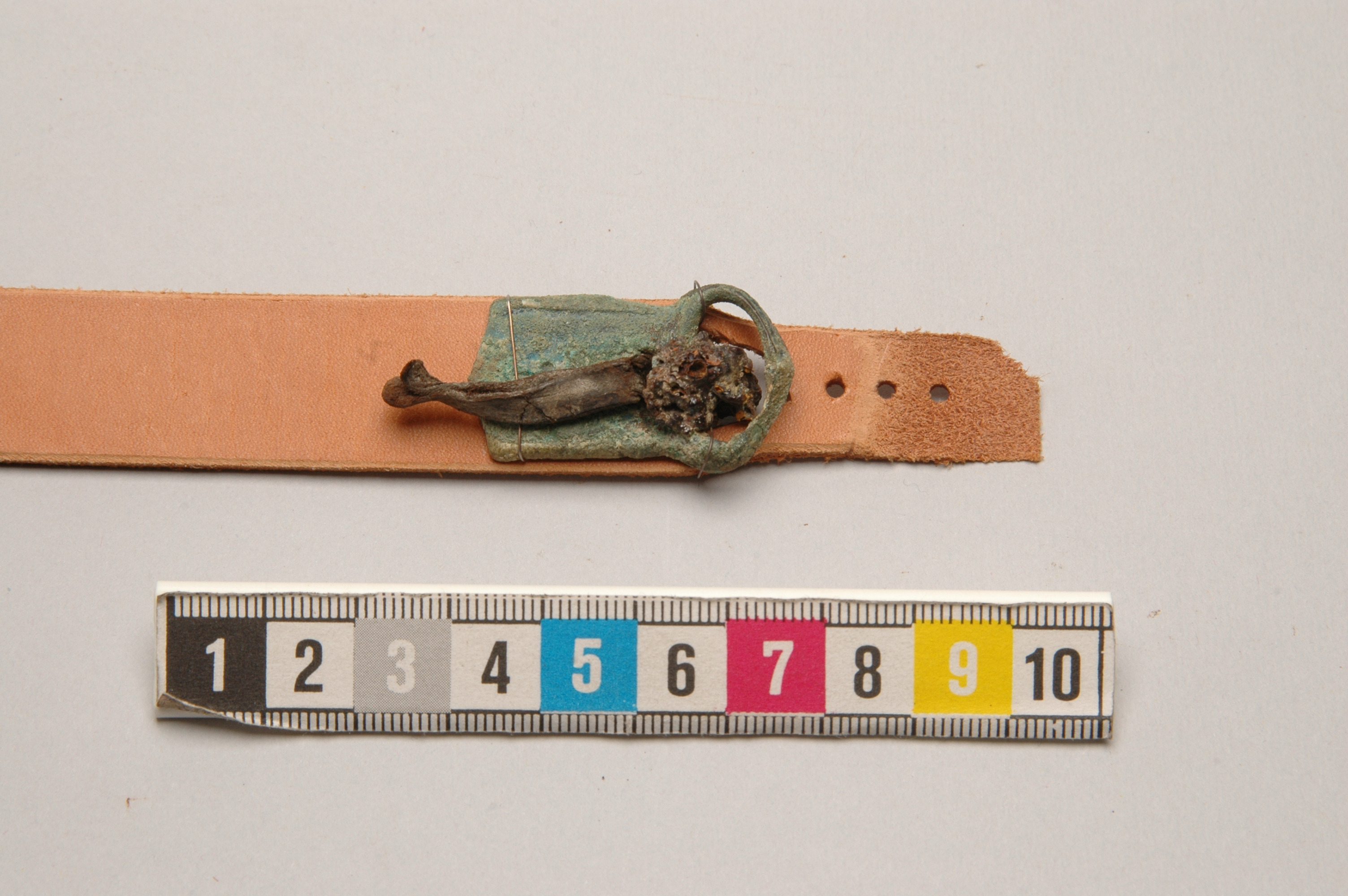 Bältesölja av brons med vidsittande tunnläderrem. Monterad på modernt bälte.