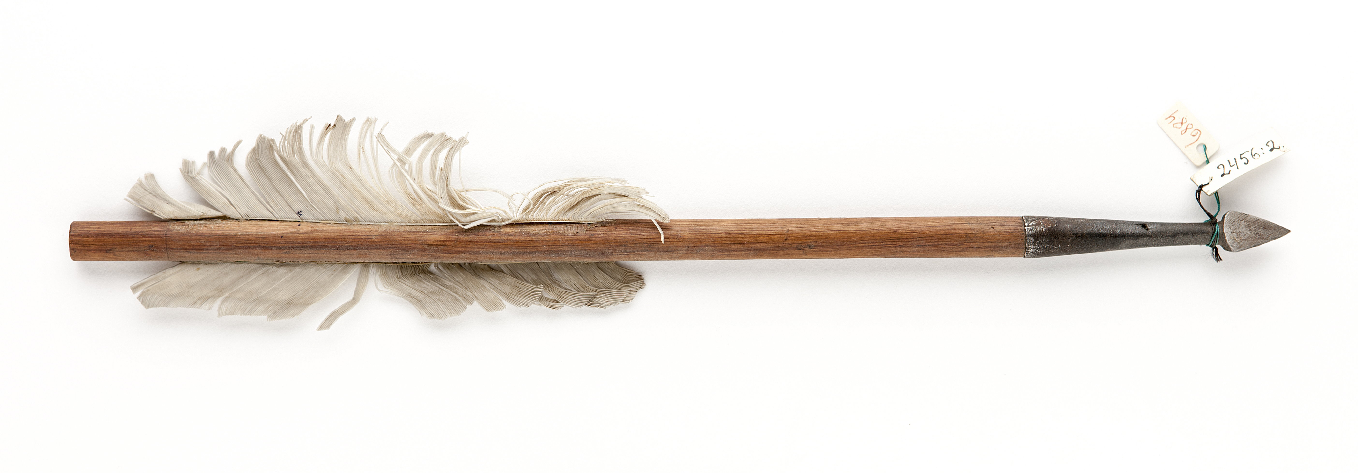 Holkförsedd spets av stål, triangulär med trekantig genomskärning. Runt skaft av ljust trä med två fastklistrade styrfjädrar av vita vingpennor, snett ställda.