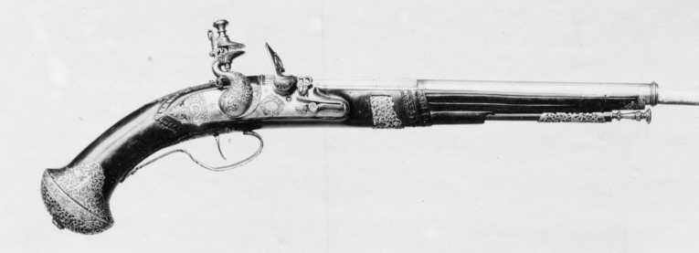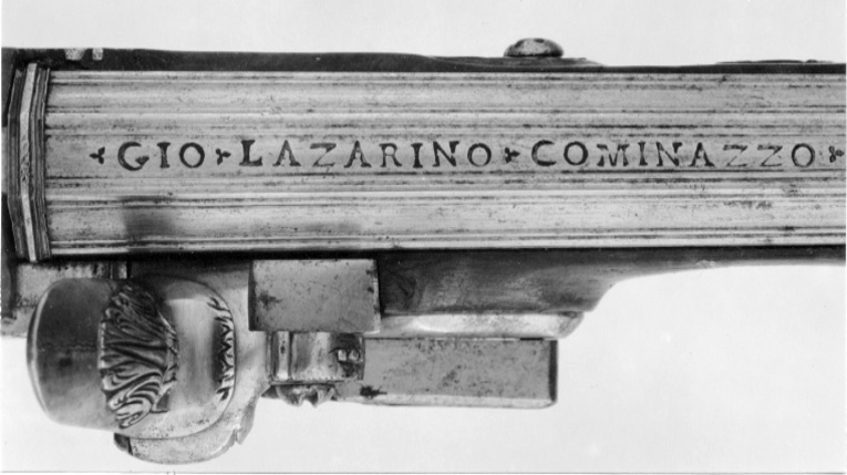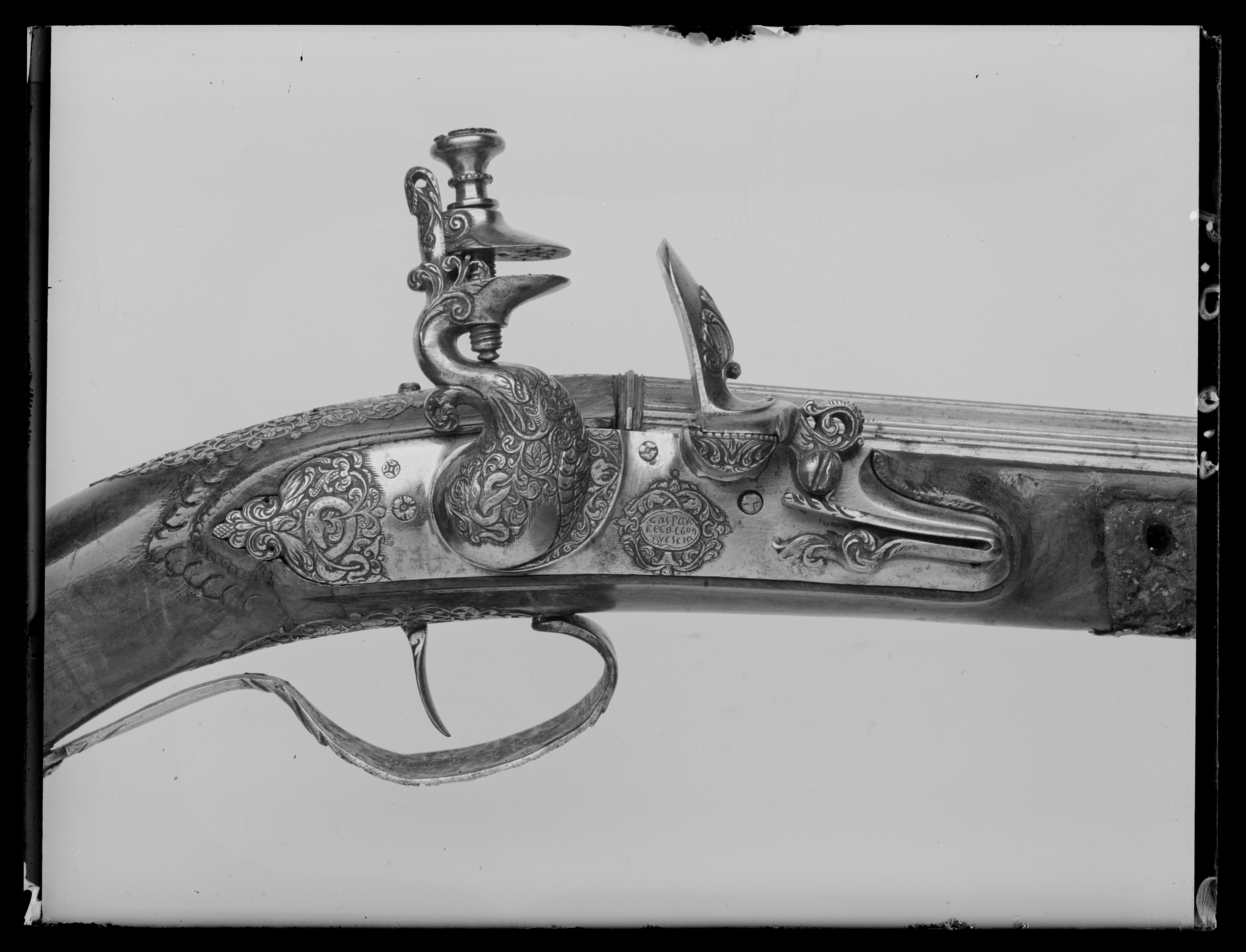 Slätborrad pipa med åttsidig kammare, profilerade kantlister, sextonsidig främre del, svarvade ringar vid övergången samt vid mynningen, profilerad vulst vid pibpasen. Rektangulärt, svagt böjt svansskruvblad. På kammarens ovansida inslagen signatur: "GIO LAZARINO COMINAZZO", mellan och på båda sidor om orden stämplar i form av trepass. På kammarens undersida stämplat: L flankerat av trepassformiga stämplar. Fästning: Två häften. Pipan fäst med krysskruv samt ett pipstift av stål. Flintlås av stål med välvt låsbleck, bakre änden i form av bladknippe. Graverad dekor i låg relief, bladrankor samt ormhuvud på bakre änden samt på hanens platta framför hanen. Nedanför fängpannan graverad kartusch med liggande oval, utsparat parti, däri graverad signatur: "Gasparo // Recalbon // Brescia". S-formig, rundad hane, nötskruv i flykt med hankroppen, dold av dekoren, bladrankor i låg relief, i rankorna inflätat två ormar. På hanhalsens undersida, mellan käkarna samt på hangrenens ände genombrutna bladrankor. Käkskruv med pokalformigt huvud, plan ovansida med graverat blad. Rundad fängpanna med liten fals, avbruten nertill, på utsidan graverade bladrankor samt pärlstav. Batteri med välvt fängpannelock, eldstål med rundad ände, rundad urslipning mellan stål och lock, därovanför ett bladknippe i låg relief, fot med häl i form av en genombruten bladranka. Batterifjäder med fasade kanter, bladvolut över fästpunkten, fjäderlöv i form av bladknippe. Nöt utan studel, hanen fäst med en mutter på nötens insida. Slagfjäder med fasade kanter, graverad krok, profilerad avtryckarstång, stångfjäder med åsat fjäderlöv. Fästning: Två låsskruvar. Svagt böjd avtryckare. Avtryckarbleck i form av genombrutet rankverk. Helstock av valnöt, snidade bladbårder vid lås- och sidbleck samt vid framstockens bakre del, kraftigt profilerad framstock. Beslag och inläggningar av stål i form av ett genombrutet rankverk, "trafori" med infogade änglafigurer. Oval kolvkappa med blomformig centrumplatta i stålsnitt, ej genombruten kantbård i form av bladranka, flankerad av pärlstavar. Stålinläggningar på kolven därframför med två runda flikar på kolvsidorna, vid svansskruvbladets bakre ände, som låsskruvbrickor (den bakre med ej genombruten platta), i band runt framstocken samt som rörka och näsband. Varbygel med ej genombrutna kantlister med rankverk i relief, genombrutet mittparti i form av rankverk med orm, rund, smal, slät bakre arm med avslutning i form av blad, framstolpen inskruvad i kolven, bakre änden fäst med skruv. Tillbehör: Ladstock av valnöt, l: 275 mm, framtill stålskoning, l: 28 mm, fäst med tunga och två stålstift i fals i stocken, beslaget framtill breddat med två profilerade kulor samt ändplatta med blomma i stålsnitt, d: 11,6 mm.