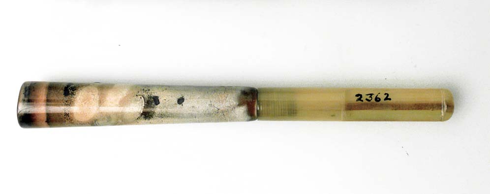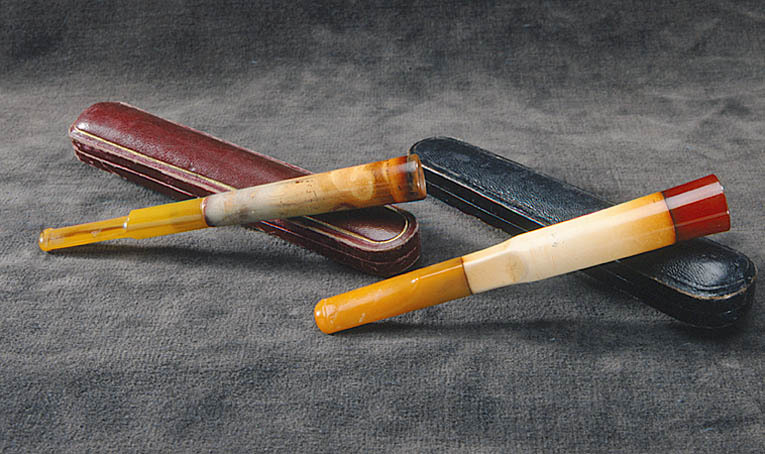 Munstycke till cigarett, isärskruvbart i två delar. Cigaretthållaren är gjord av sjöskum som är fläckat i olika bruna och gula nyanser. Munstycke är av gul, opak, delvis genomsynlig bärnsten.