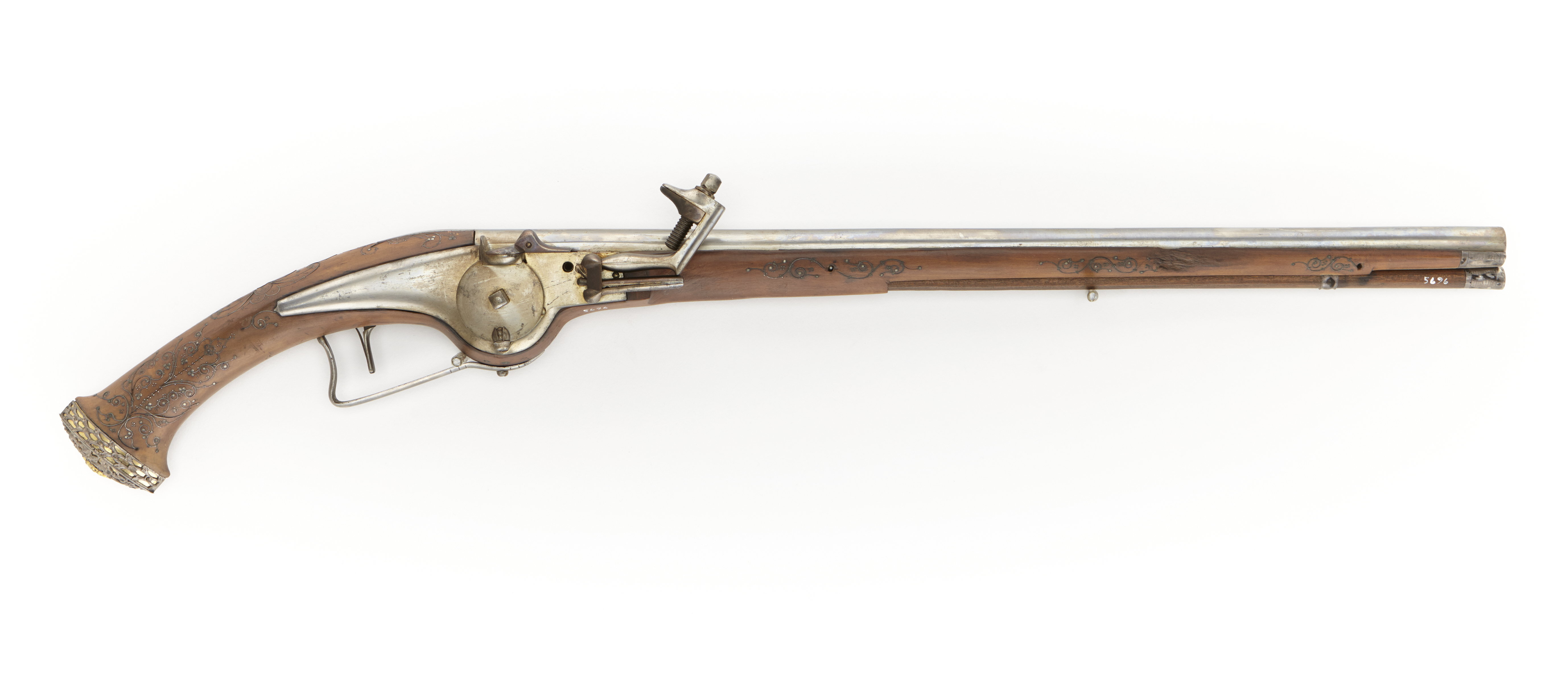 Rund, slätborrad pipa av stål. På undersidan stämpel med "E W". Två piphäften. Hjullås. Kullrigt låsbleck, utsvängt för hjulet. Hjulet fäst med krampa kl. 6. Låg krutskärm. Blånerade delar: fängpannelock, underkäke samt hanfjäder med studel. Vertikalstudel (blånerad). Hel stock av valnöt (?) kolv med spetsovalt tvärsnitt, utsvängd för hjulet. Kolvkappa av genombrutet silver, motiv med blommor. Under silvret förgyllt mässingsbleck. Mitt på kolvkappan förgylld mässingsblomma. Stocken inlagd med tunna trådar, punkter och små blommor av silver: på kolvhals och rygg, mitt emot hjulet och på framstocken. Mitt emot hjulet även tom vapenplåt krönt av adlig krona, allt utfört i förgyllt silver. Tre låsskruvar. Pipstiften ej ursprungliga. Näsband och rörka av silver. Enkel varbygel av stål, fjäderbelastad avtryckare. Tillbehör: Laddstock med doppsko av silver. Märkt: 77 bakom låsblecket, stanstyp 5376.