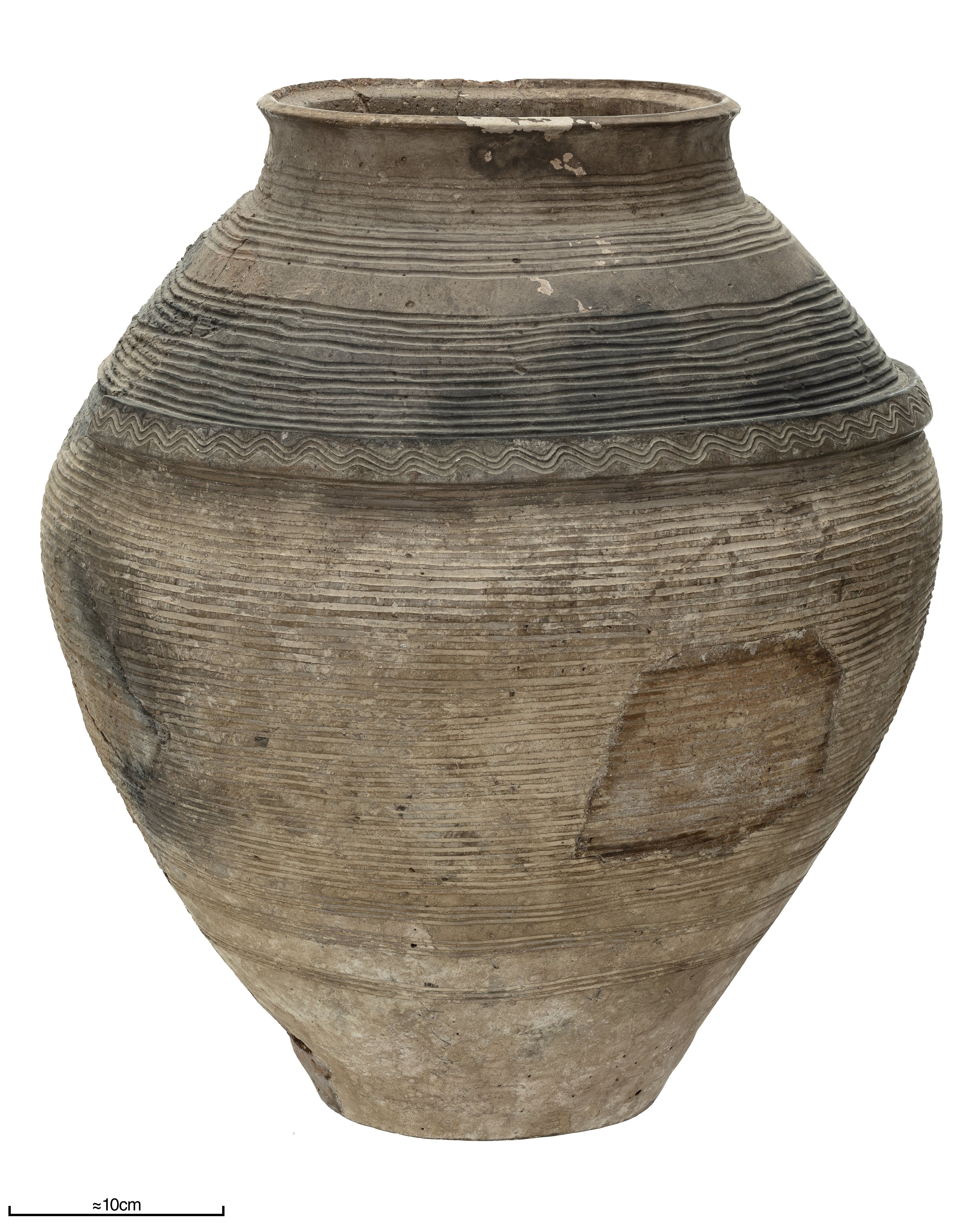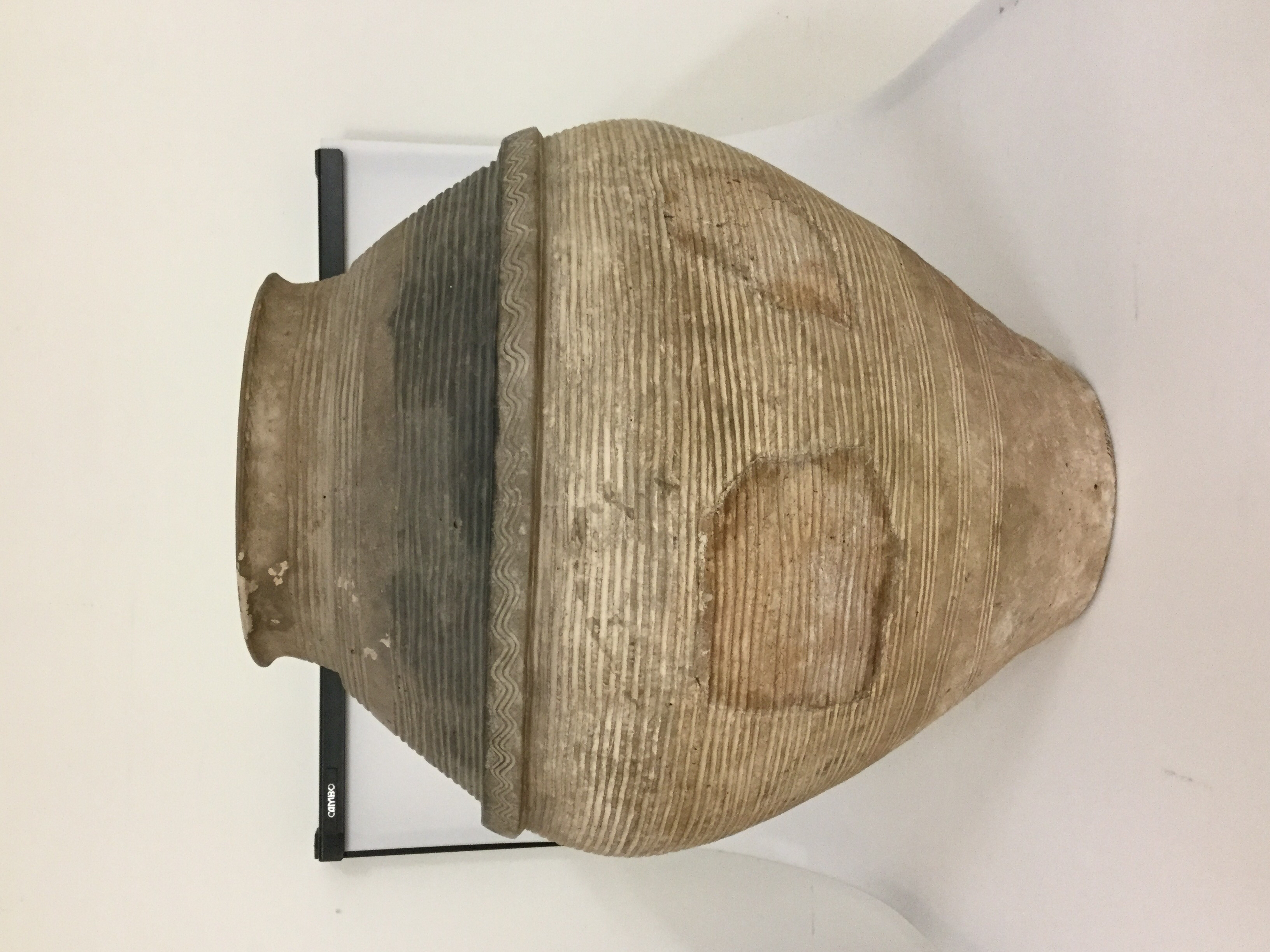 Stort lerkärl av grovt gods. Ornerad med ett pålagt band med vågformiga linjer. Troligen importerat. Typ AII:3b