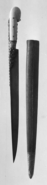 Fäste smalnande på mitten klätt med plattor av mörkt horn fäst med två nitar av brunerat stål med höga nitknappar och profilerade nitplattor med dekor av påslaget guld. Klinga av stål, brunmålad (med nafta?) 40,5 mm bred, rak, tvåeggad med en djup osymmetriskt placerad hålkäl på var sida. Runt denna rankornament av påslaget guld på utsidan.
