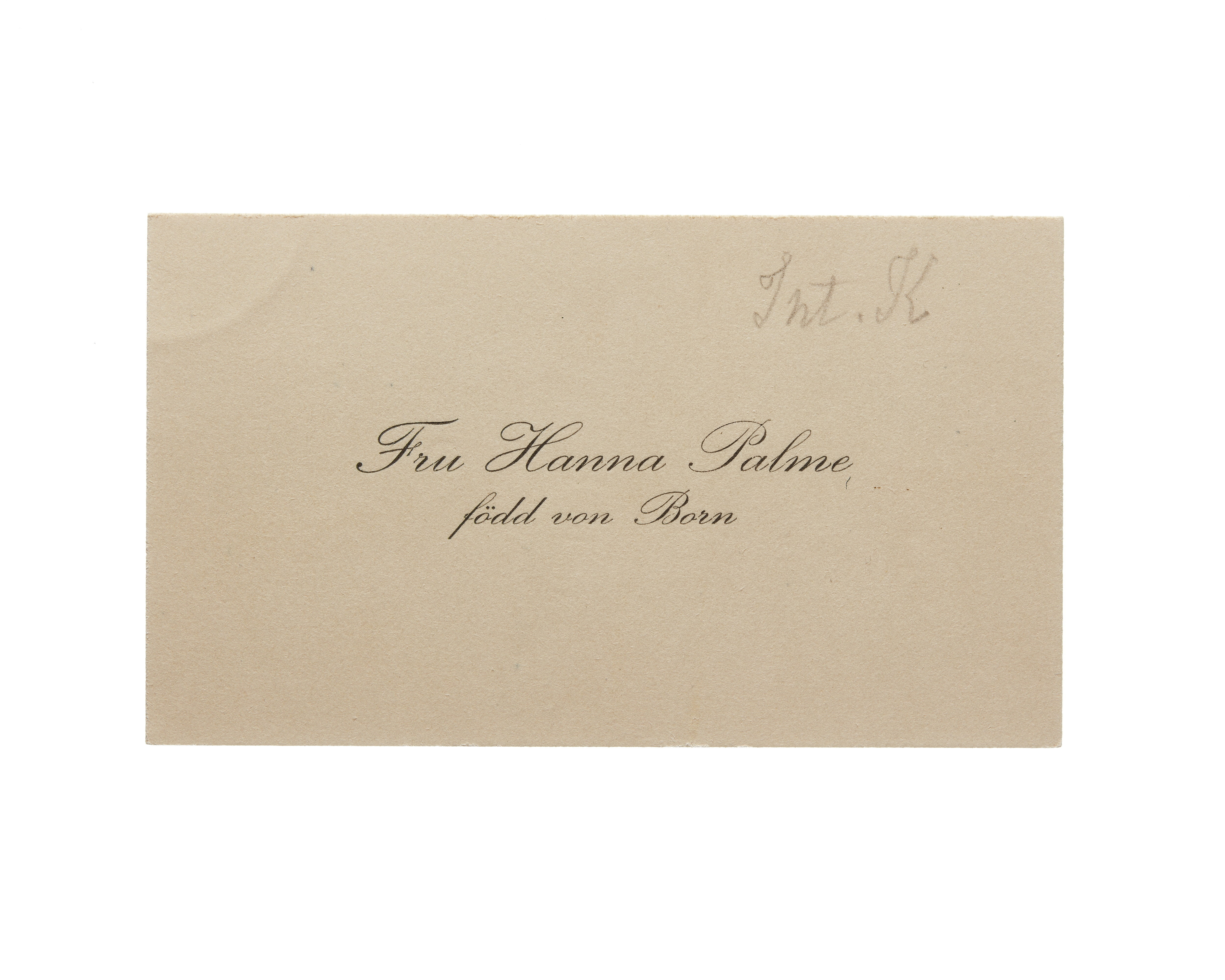 Ett visitkort från Fru Hanna Palme, f. von Born, daterat 1911. Överlämnat i samband med Internationella kvinnoförbundets kongress i Stockholm 1911.