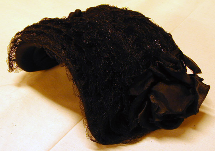 Helt svart hatt av bindmössetyp. Framtill valk av siden, förstärkt med flätad halm. Kanten förstärkt med järntråd, insvängd baktill. Hatten klädd med band av bakelittrådsspetsar. T.v. en ros med blad och liten rosett av sidentyg. Fodrad med sidennät. Ripsband. Vit sidenetikett: "Edman et Andersson // STOCKHOLM". Två hattnålar med huvuden överklädda med svart siden. Buren av prinsessan Sibylla vid det isländska presidentparets Stockholmsbesök 22/4 1954, då det fortfarande rådde hovsorg (kronprinsessan Märtha av Norge hade avlidit den 5 april 1954).