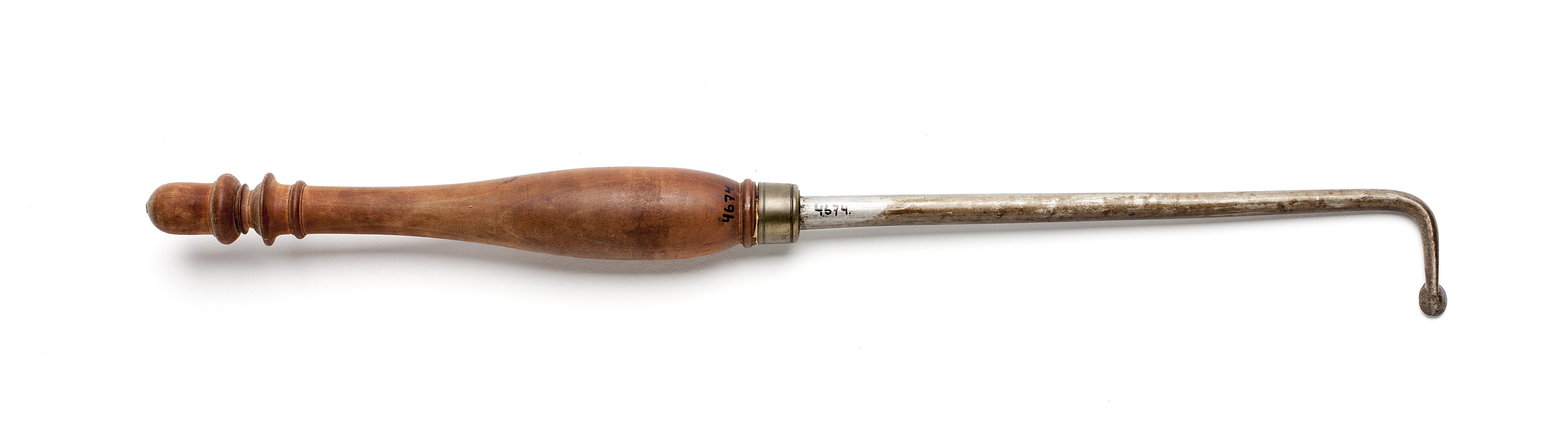 Rund klinga. Änden böjd i rät vinkel. Ovalt stål. Svarvat skaft med ekollonsliknande knopp av päronträ, mässingsring. Stämpel på skaftets ände vid fästet: otydliga siffror.