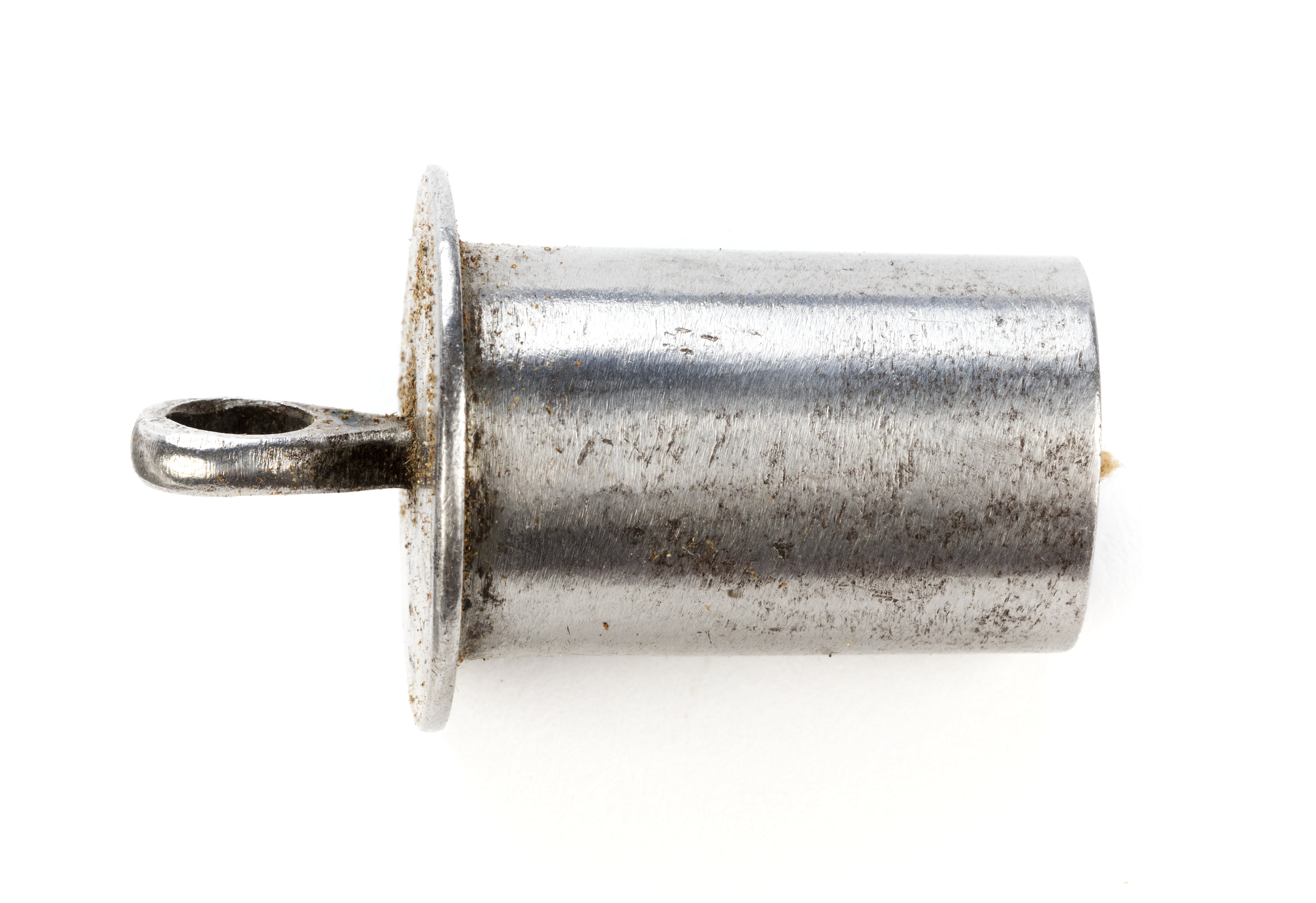 Cylindriskt krutmått av stål med oregelbundet rund bottenplatta, på plattan en droppformig stav med ett runt hål. Måttets inre d: 16 mm,djup: 27,8 mm, bottenplattans d: 25 mm. Förvaras i kolvlådan.