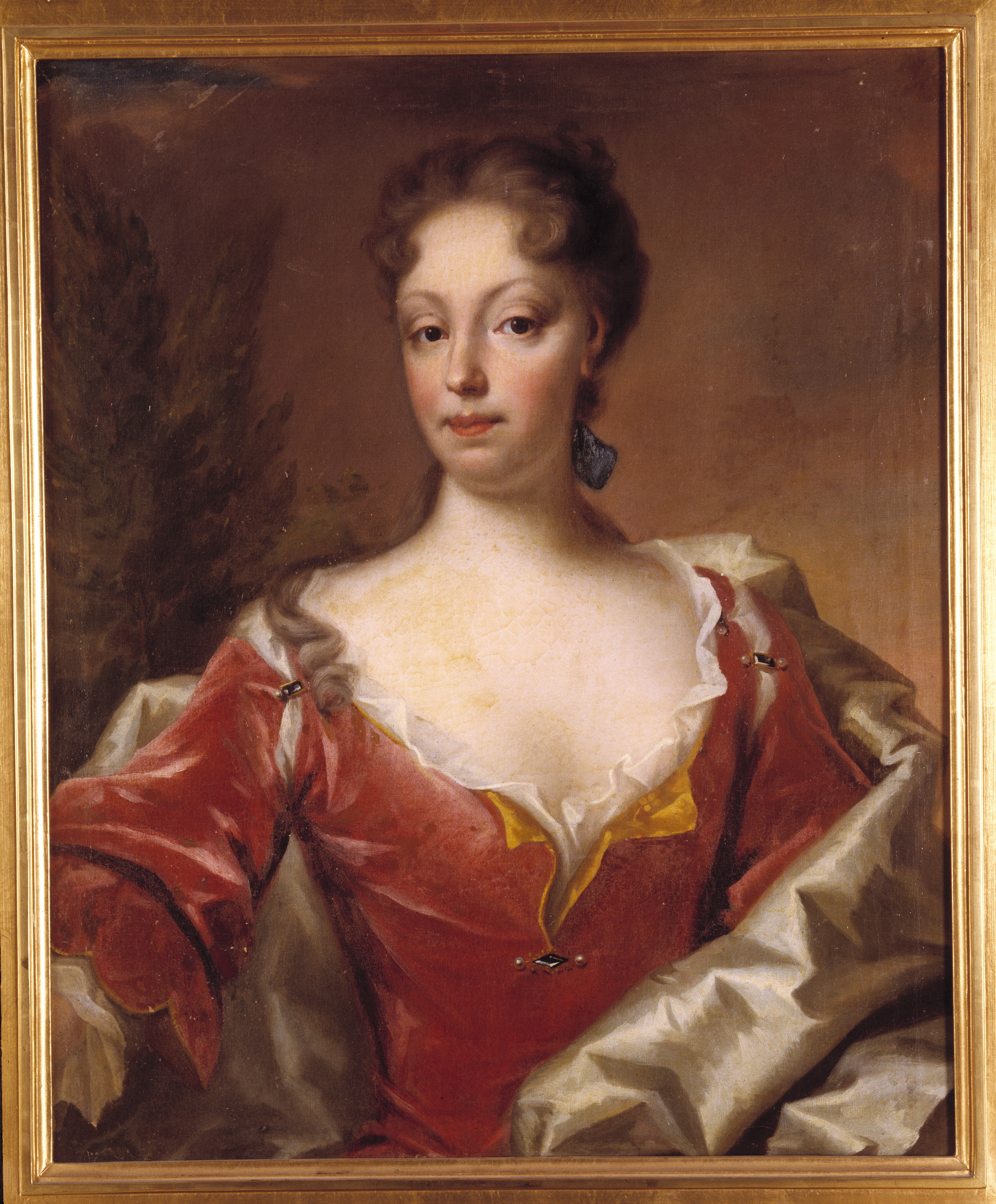 Grevinnan Margareta Fredrika Bonde 1680-1727, gift med greve Abraham Brahe. Midjebild fas huvudet åt vänster, kroppen åt höger. Röd, djupt urringad klänning, vit mantel. På dukens baksida: "Margareta Bonde Comtes de Brahe 42 annee." Oljemålning på duk. Stiftad spännram. Förgylld ram. Ramlistens bredd 83 mm. Signerad på baksidan:"G de Marres pingcit 1721."
