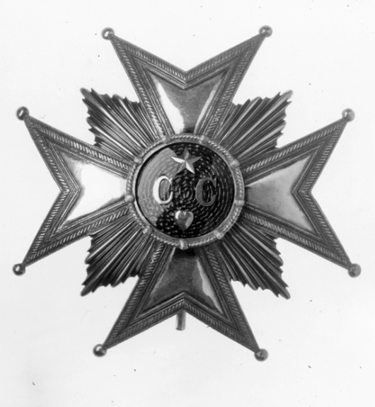 Malteserkors av silver med kulor på spetsarna och tredubbel repstavskant, inre delarna av korsarmarna förgyllda. Svagt välvd medaljong täckt med blå, genomsynlig emalj, därpå fäst C C av silver samt däröver en femuddig, fasetterad silverstjärna, nedanfö rbokstäverna ett silverhjärta. Förgylld kantring i form av rep med därpå trätt nio ovala, räfflade kulor. Mellan korsarmarna sju strålar, varannan välvd, varannan skålad. Baksidan förgylld, vertikalt placerad säkerhetsnål.