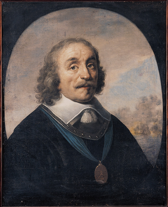 Detta är en 1600-talskopia efter Jan Lievens porträtt av amiral Maerten Harpertsz. Tromp (Schneider 1973, nr 265). Flera kopior, i varierande format, är noterade av Schneider. Några är avbildade efter knästycket föreställande Tromp i rustning av Lievens i Rijksmuseum, Amsterdam (Amsterdam 1976 (I), nr A838), andra - som detta - är efter ett försvunnet porträtt, också det knästycke, visande Tromp iklädd harnesk, vilande vänster hand på en kanon. Versionen finns återgiven i ett tryck av van Dalen (Muller 1853, nr 5445i) -*- This is 17th-century copy after Jan Lievens portrait of Admiral Maarten Harpertsz. Tromp (Schneider 1973, no. 265). Numerous copies, in varying formats, are listed by Schneider. Some after the 3/4 length portrait of Tromp in armour by Lievens in the Rijksmuseum, Amsterdam (Amsterdam 1976 (I), no. A838) and others-including this one-are after a lost portrait, also 3/4 length, showing Tromp wearing a gorget recorded in a print by van Dalen (Muller 1853, no. 5445i) and resting his left hand on a cannon.