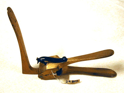 Patronplundrare av mässing, bestående av på ett gemensamt gångjärn sittandes tre handtag med rundade och svagt svällande avslutningar. Ena handtaget övergår mot gångjärnet i en kvadratisk form med ett runt uttag med plats för en patronhylsa. I hörnen mot handtaget sitter två skruvar av metall varav den ena håller fast en avlång platta i metall. En skåra i plattan gör att den kan föras in under den andra skruven (för att hålla fast patronhylsan ?). Handtaget i mitten övergår i samma rektangulära form som det förra och fälls också över detsamma. En urfräst skåra göra att skruvarna som sitter i det undre inte går emot när man pressar samman handtagen. Ovanför den urfrästa skåran finns ett borrat smalt hål i vilken en spetsig stav av metall sitter. På handtagets ovansida är en avlång s-formad metallplatta fastskruvad. I ena änden på plattan finns en skåra i vilken den spetsiga staven är införd. Plattan fungerar som en fjäder. Det tredje handtaget saknar den rektangulära formen och har som enda uppgift att pressa ner staven. Handtaget märkt: "G CAL 12".