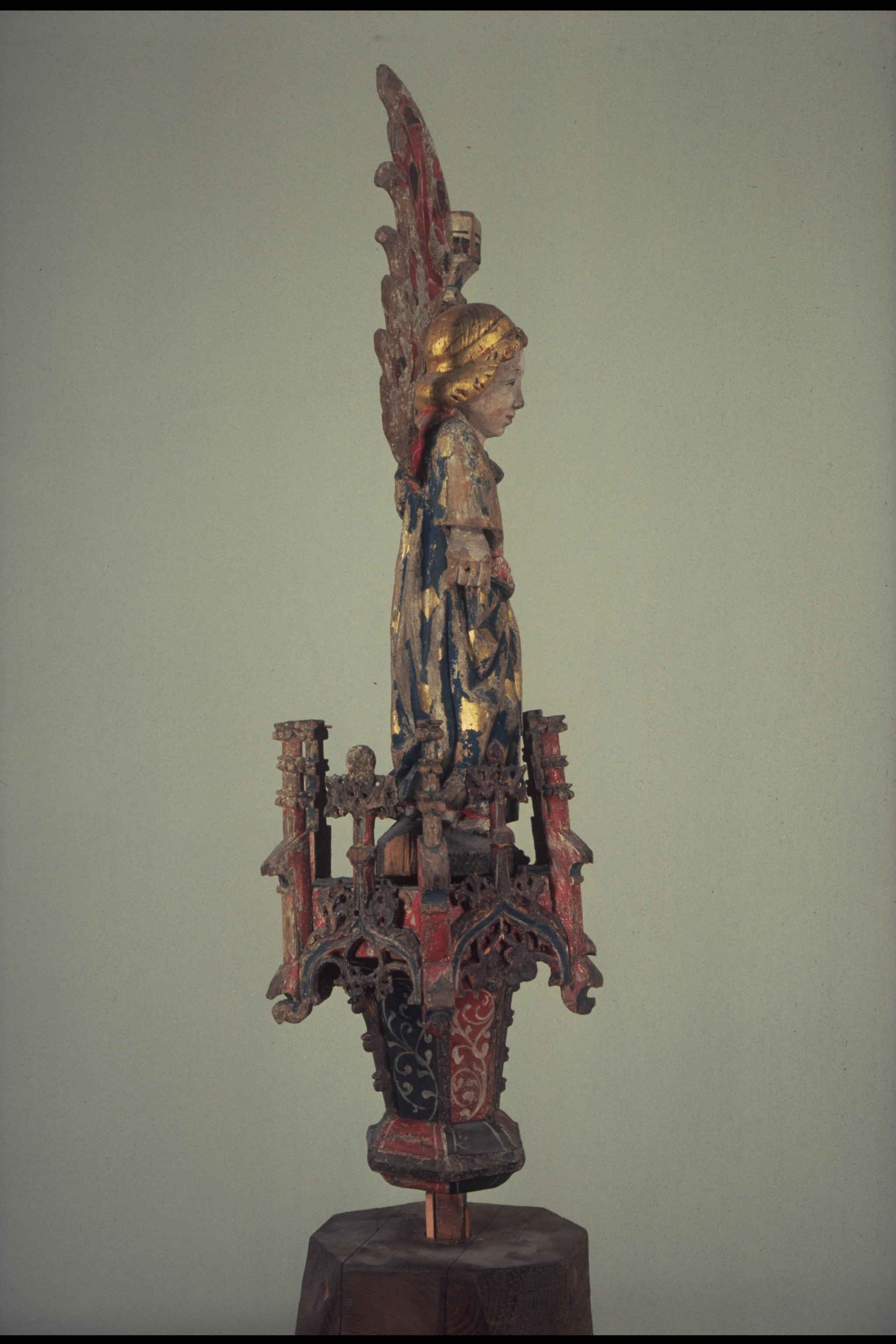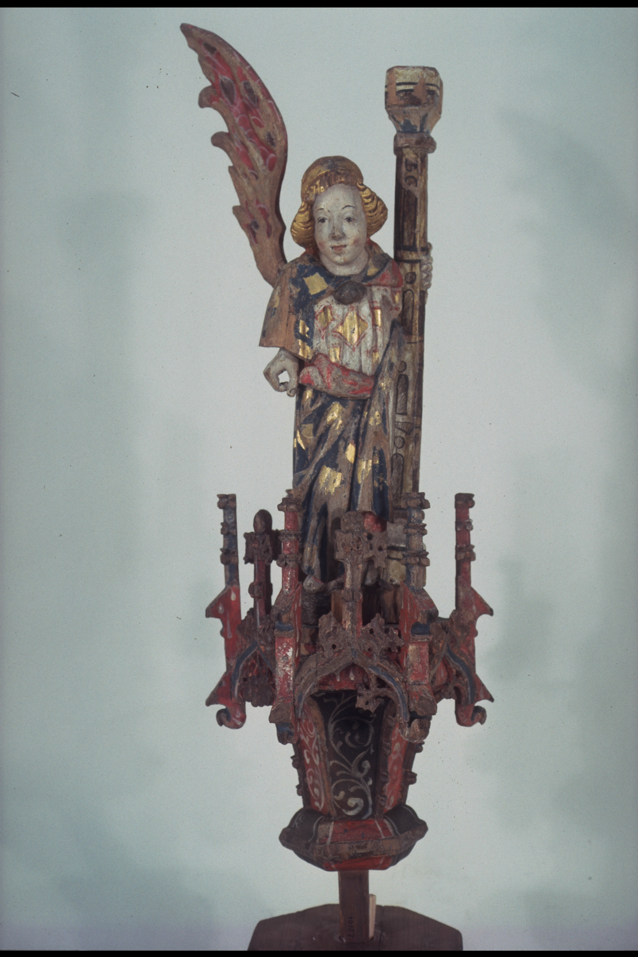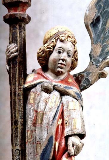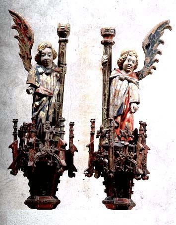 lövträ, ornamentik av ek. Kondition: båda änglarna har förlorat en vinge och den klocka de hållit i ena handen. Färg: i huvudsak välbevarad.