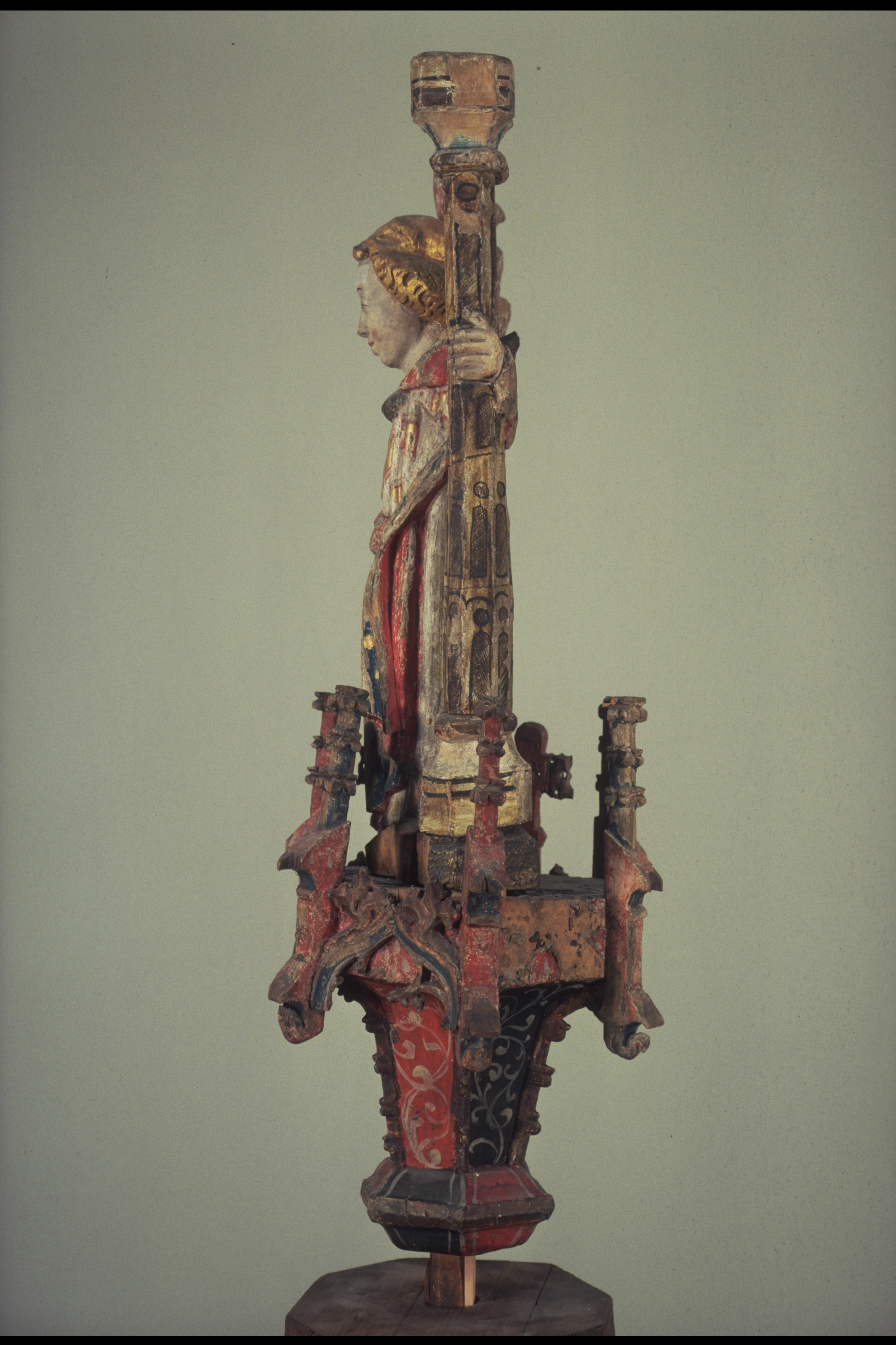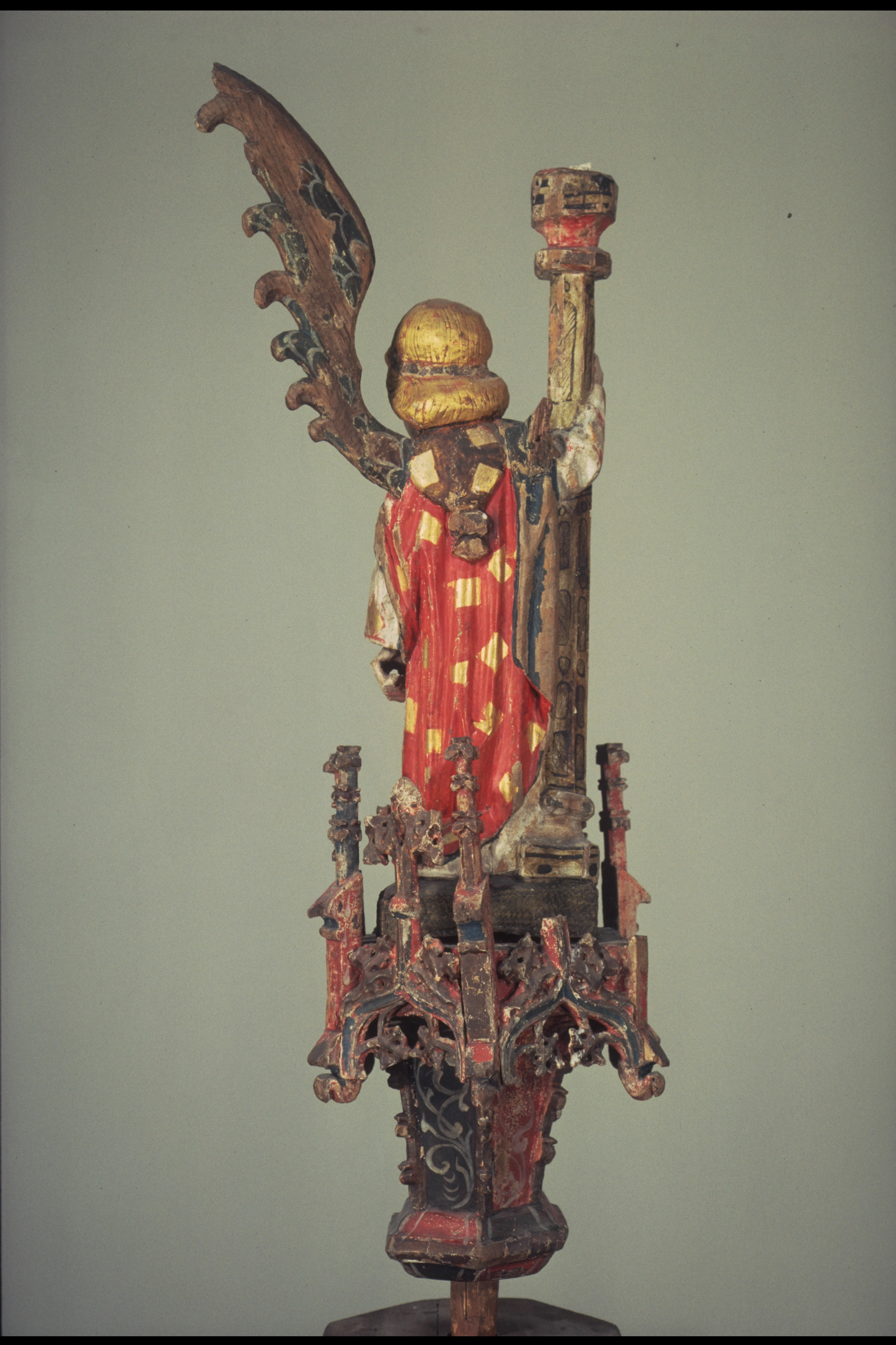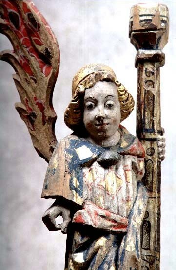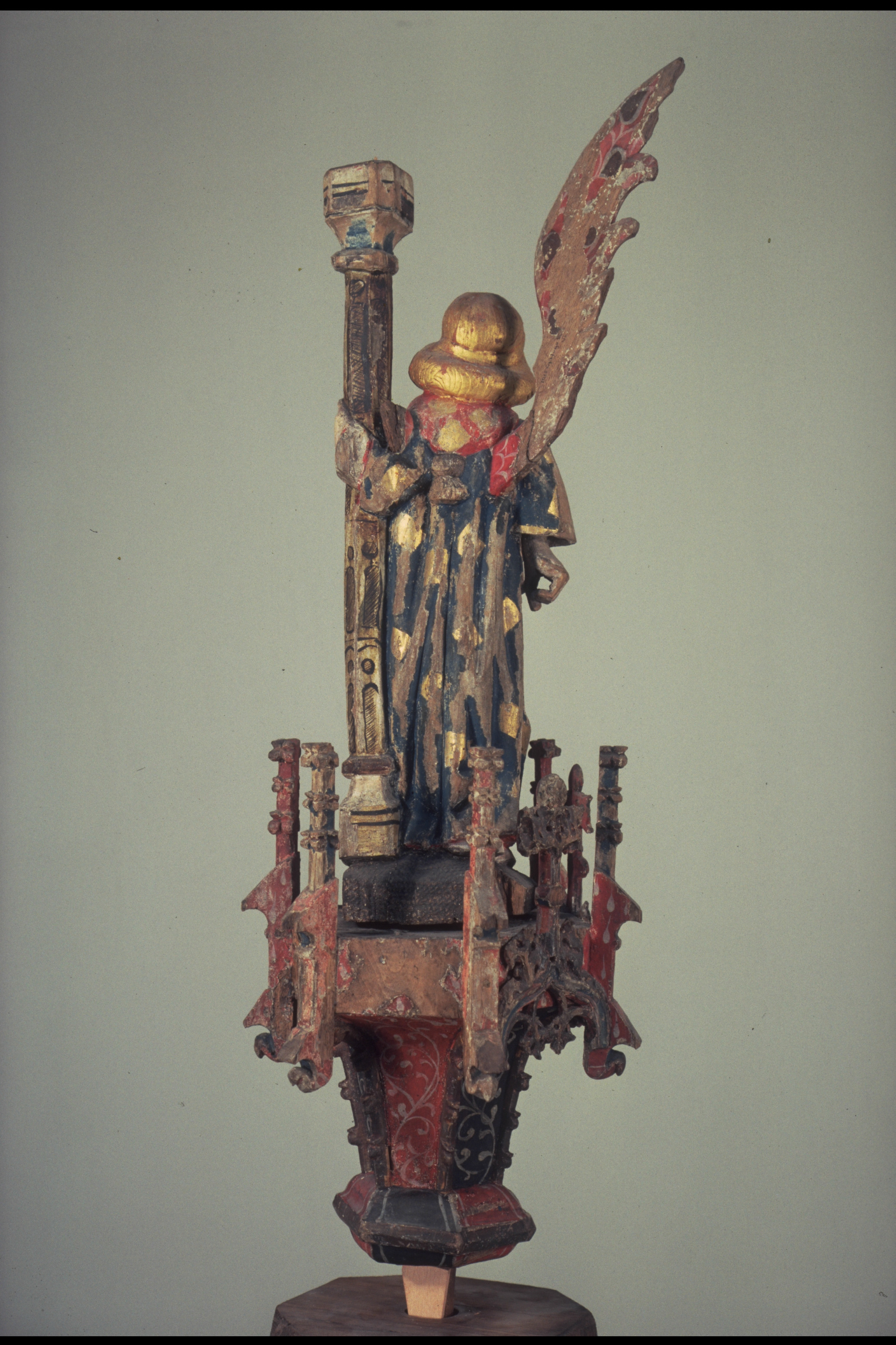 lövträ, ornamentik av ek. Kondition: båda änglarna har förlorat en vinge och den klocka de hållit i ena handen. Färg: i huvudsak välbevarad.