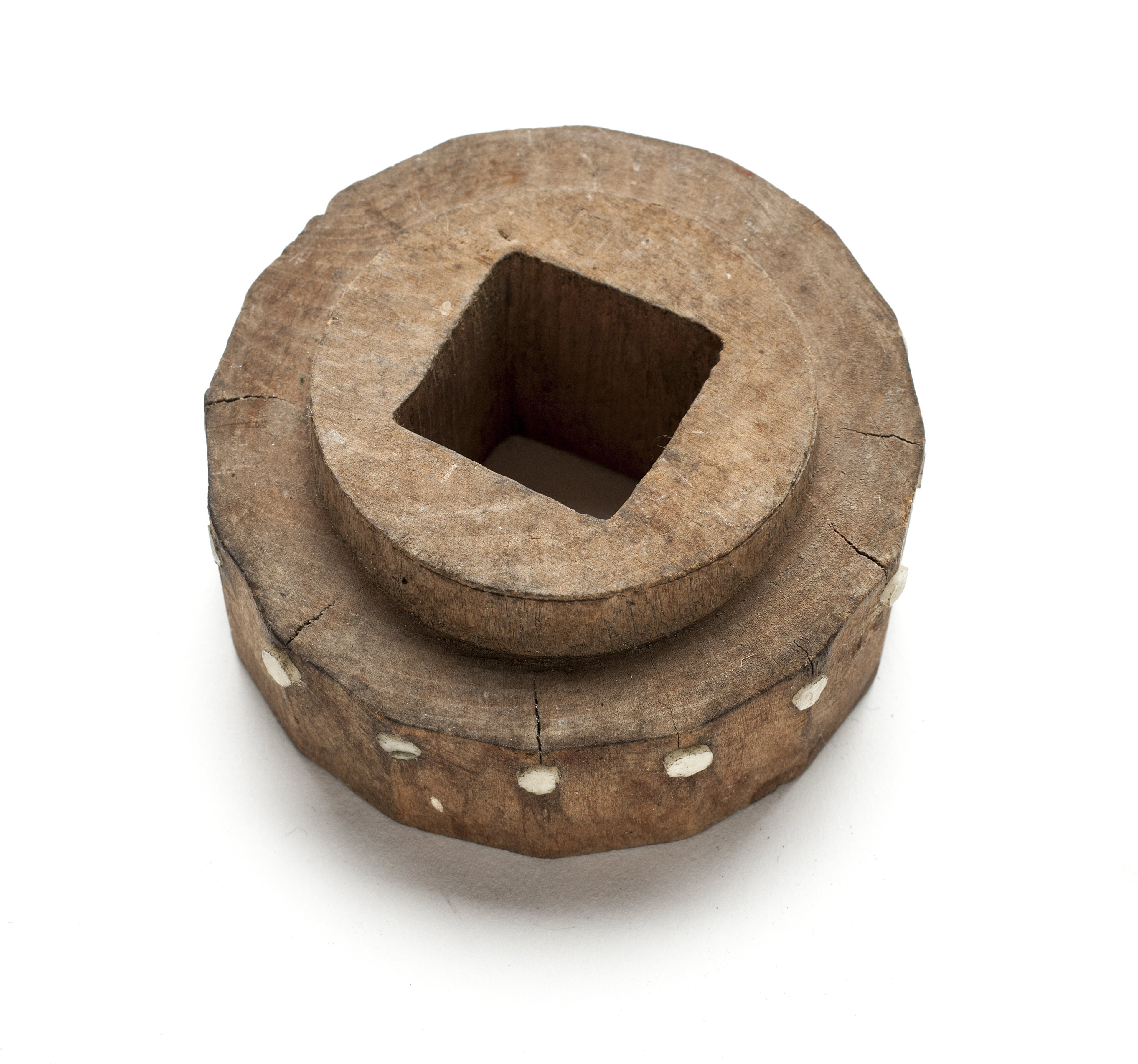 Ena sidan plan, den andra har ett snedställt plan och i mitten ett runt plan för spindelhylsan, diam 56,5 mm. Kanten skuren sextonsidig med ett benstift i varje hörn. Kvadratiskt hål med 22,2 mm sida.