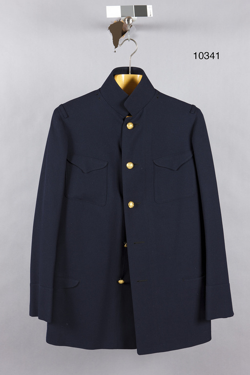 Kavaj av mörkblå yllediagonal med ståndkrage med två hakar, enradig. 5 knappar d:22 mm med skålla av förgylld mässing med ryska dubbelörnen i relief. På baksidan text: KOPEIKIN // MAKSIM // 1 SORT // S.PETERSBURG. Två bröstfickor, påstickade, 130 x 130 mm med vinkelformade ficklock, som knäppes med svart tryckknapp. Fickor nedtill med ficklock att bäras synliga eller dolda. På axlarna närmast kragen två hål kantade med langettstygn av svart silke. Närmast ärmsömmen smal epålettslejf av samma tyg som kavajen. Ärmuppslag i form av påstickad 107 mm bred kant. Foder av svart siden, i ärmarna av vitt siden med bruna och gråsmala ränder.
