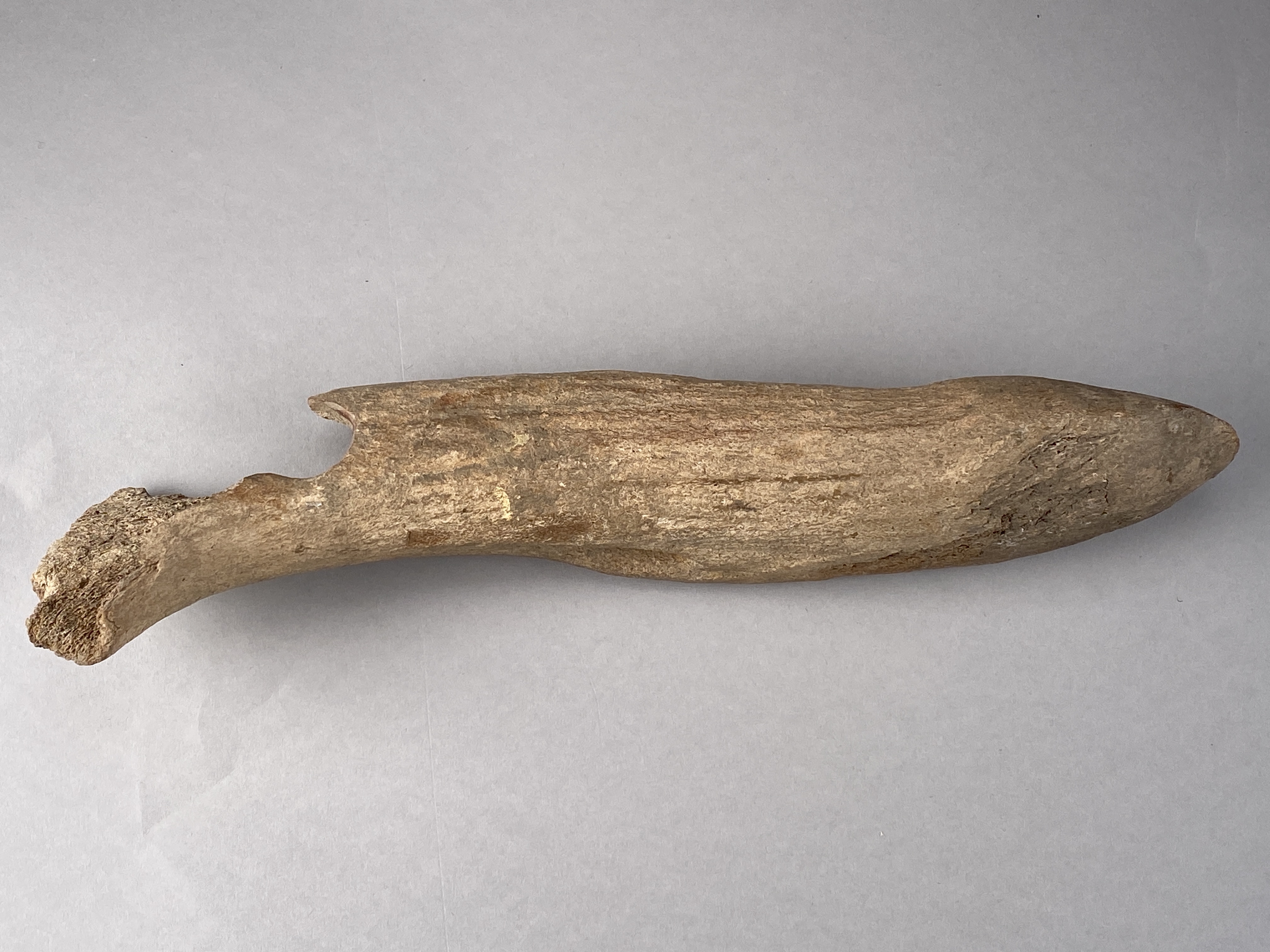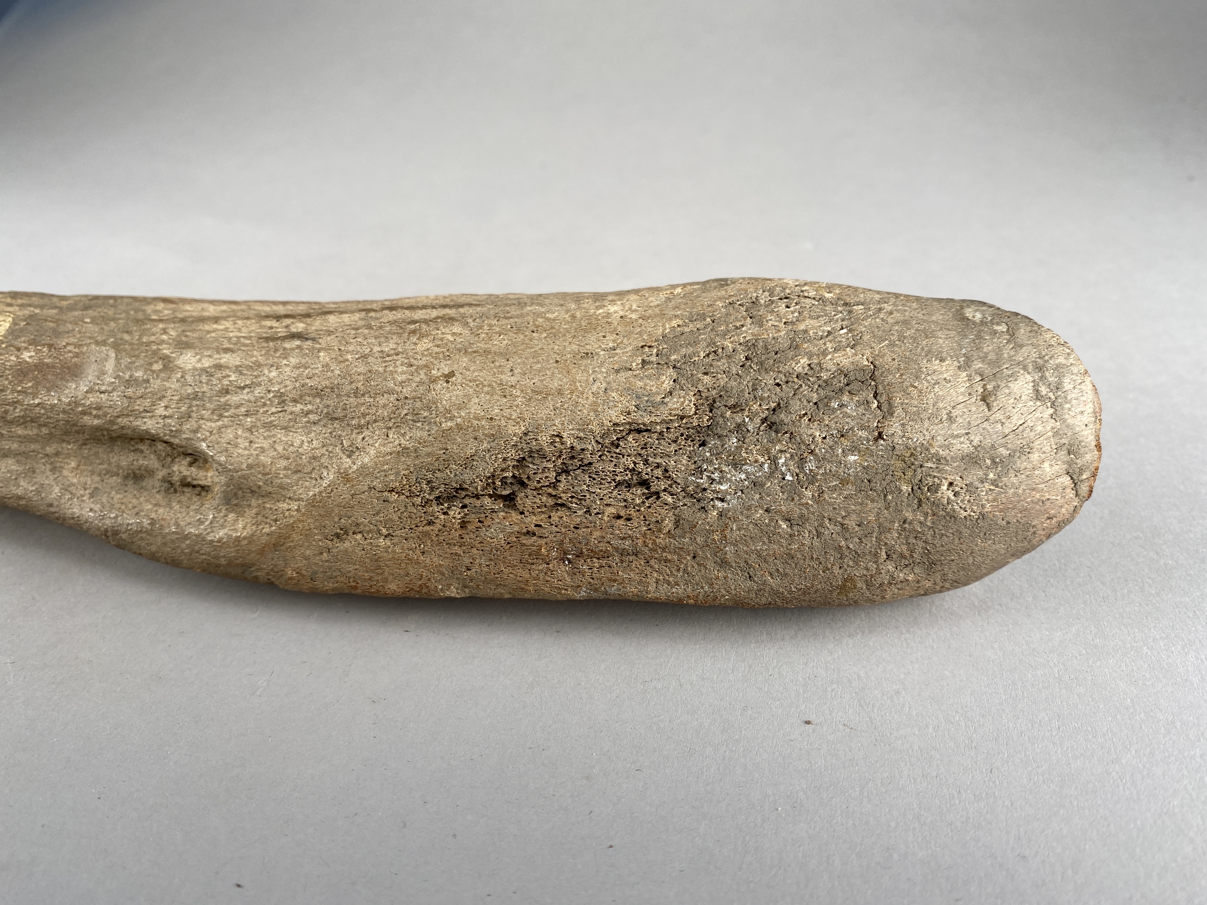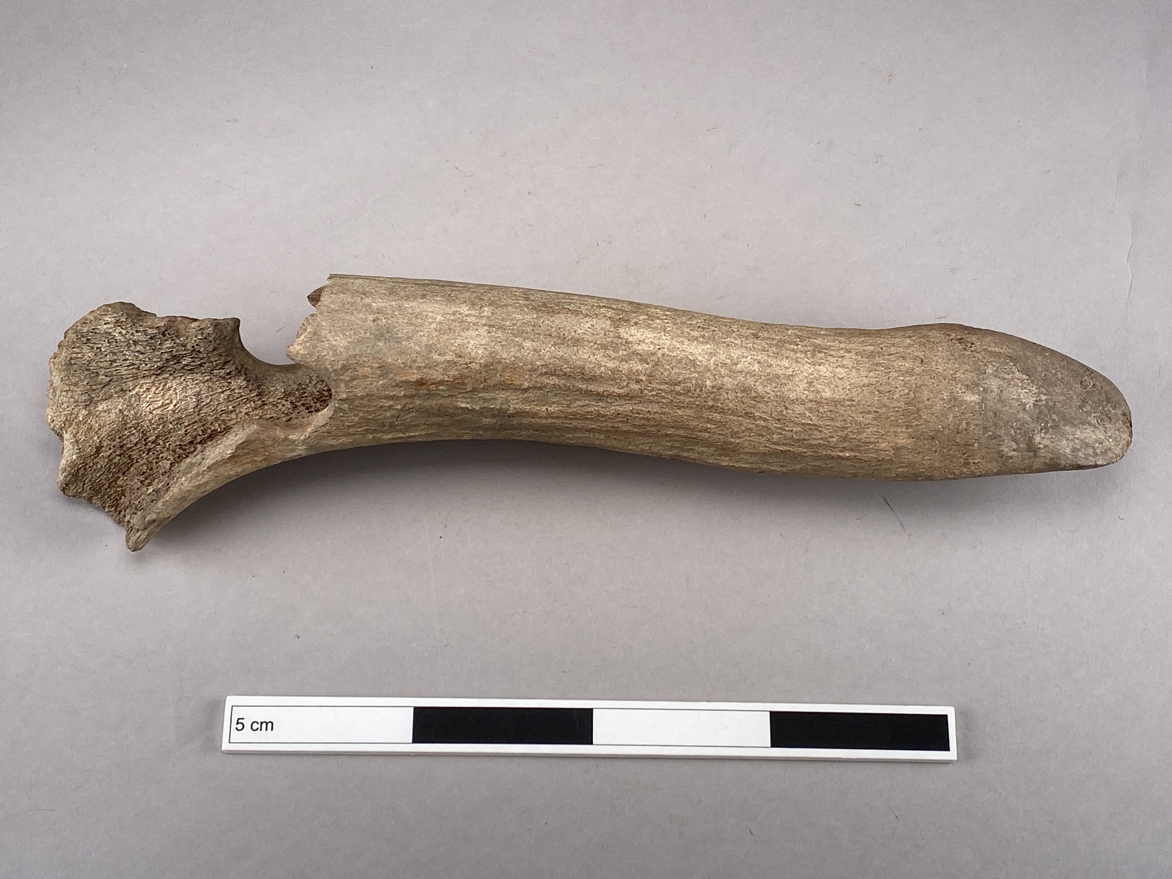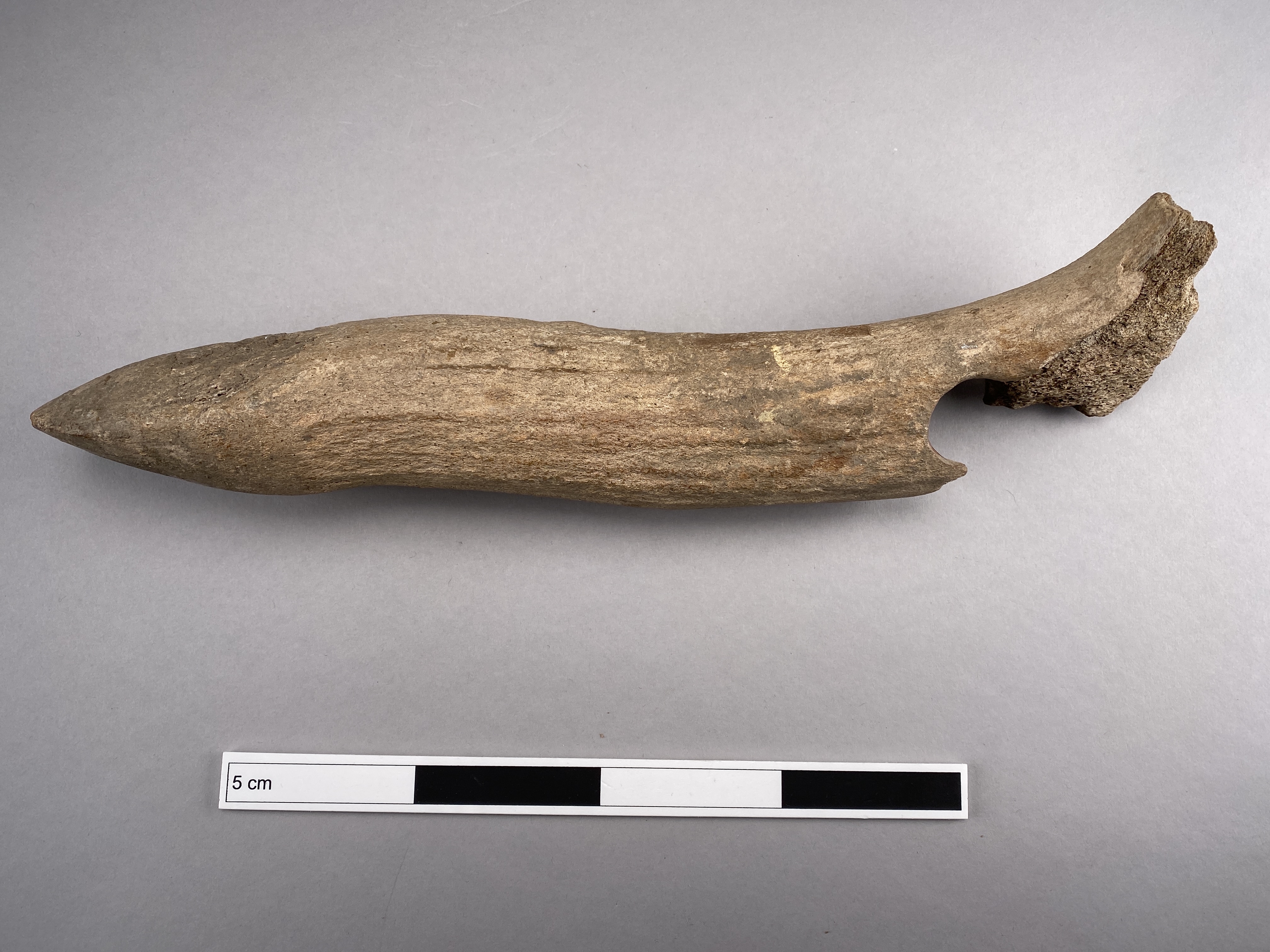 Yxa av horn med fint formad egg och skafthål. Skafthålet trasigt. Provtagen för C14-analys 2024. Efter provtagning har hålet satts igen av konservator.