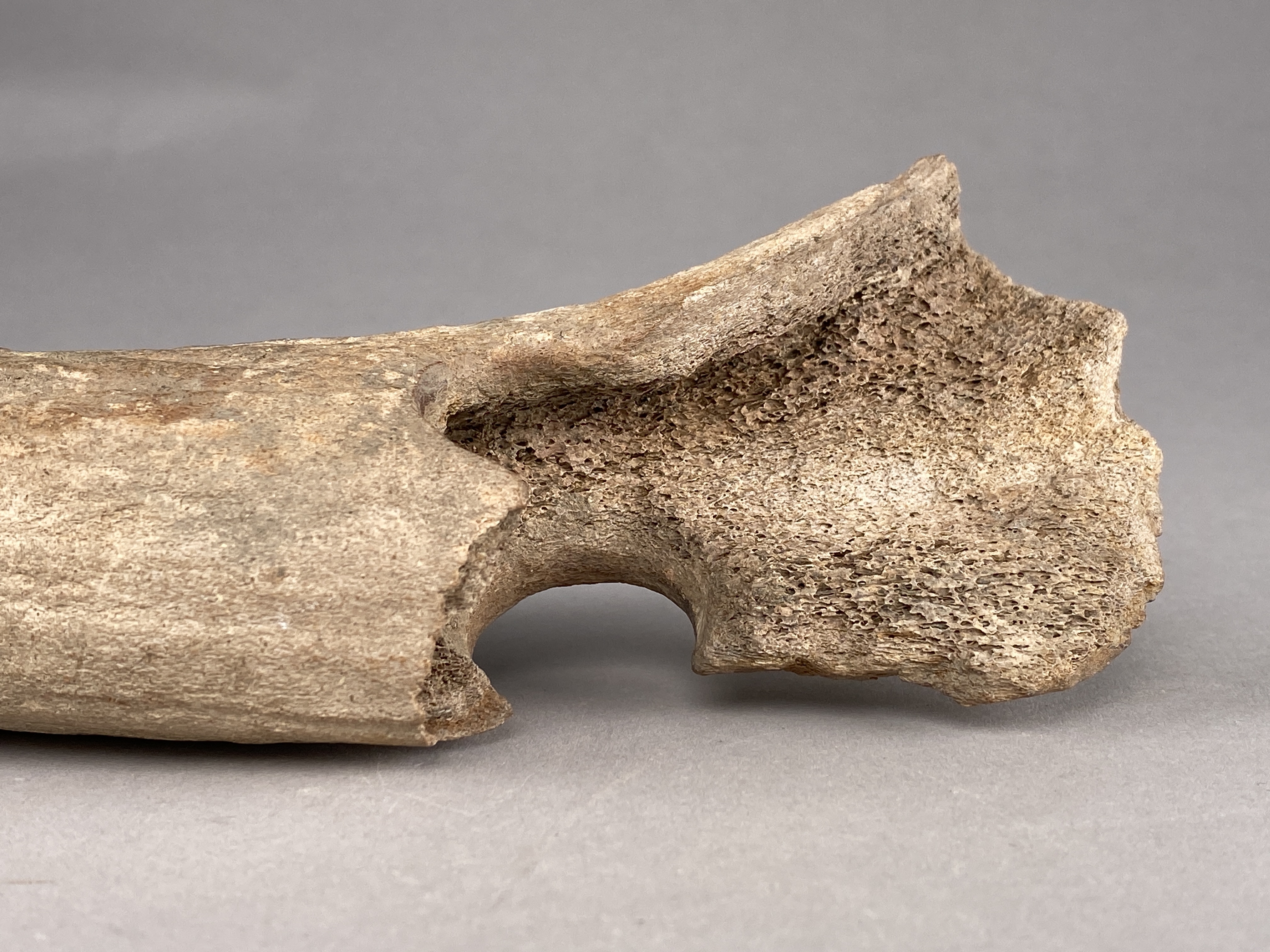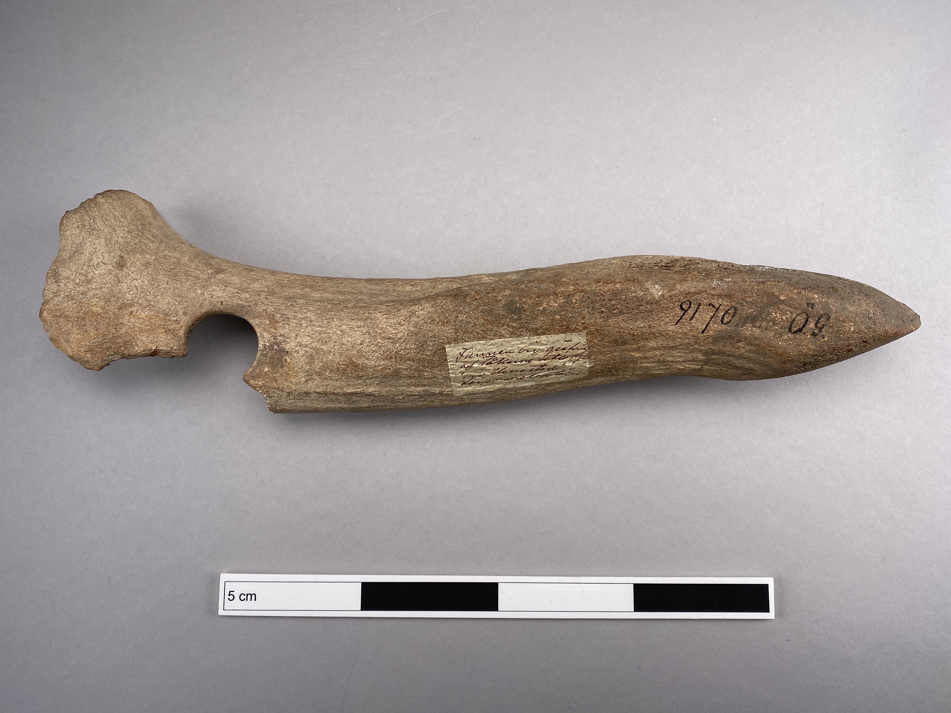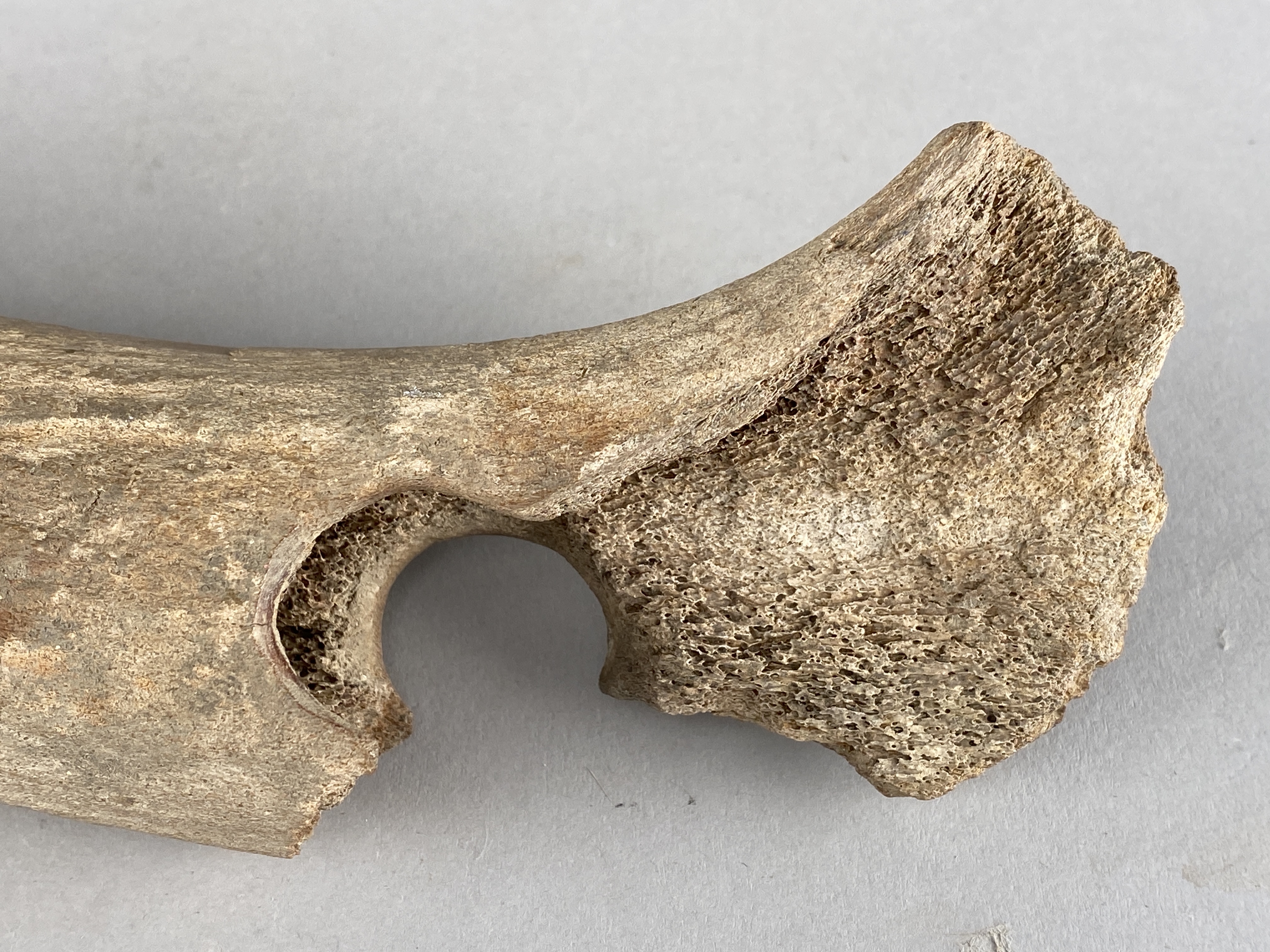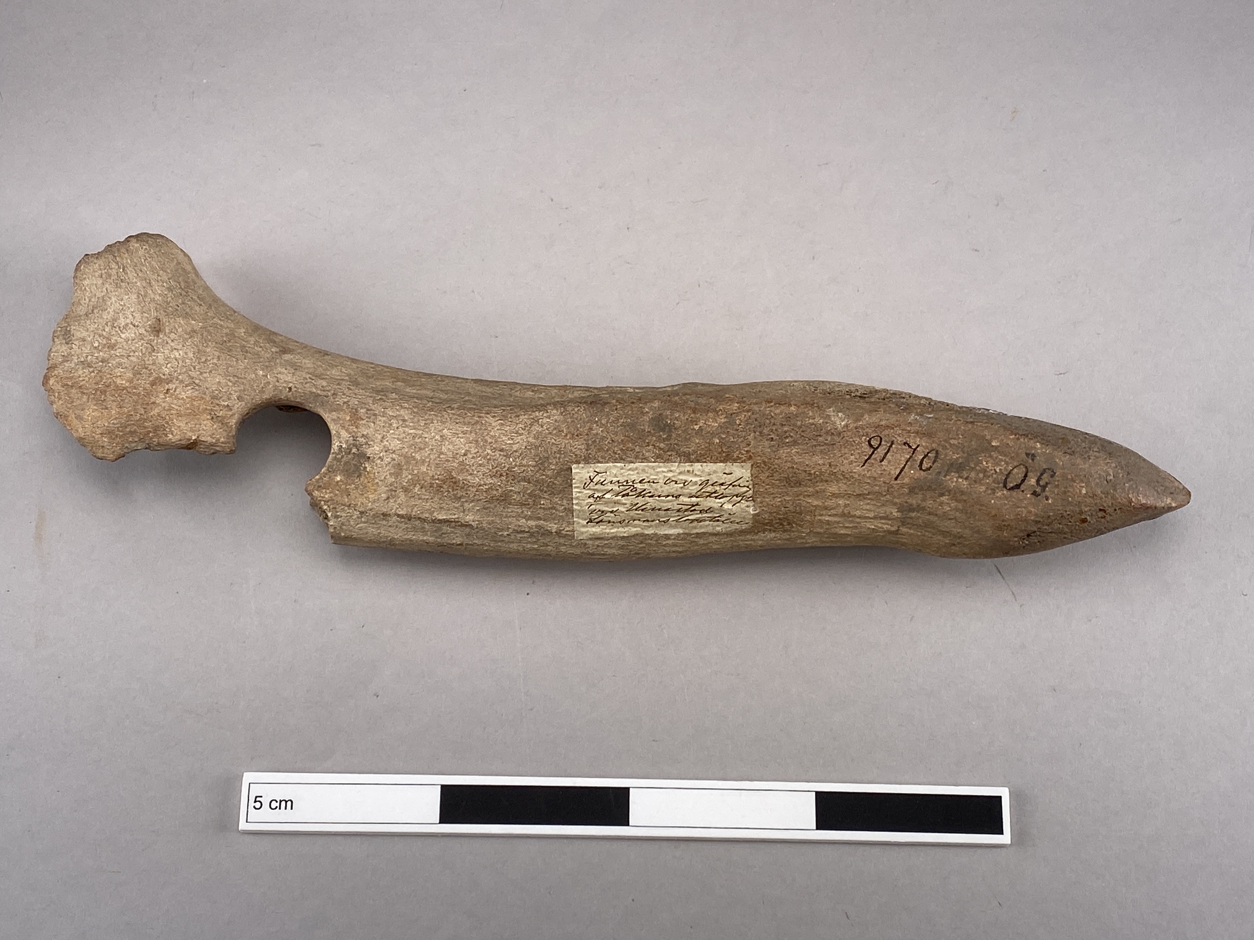 Yxa av horn med fint formad egg och skafthål. Skafthålet trasigt. Provtagen för C14-analys 2024. Efter provtagning har hålet satts igen av konservator.
