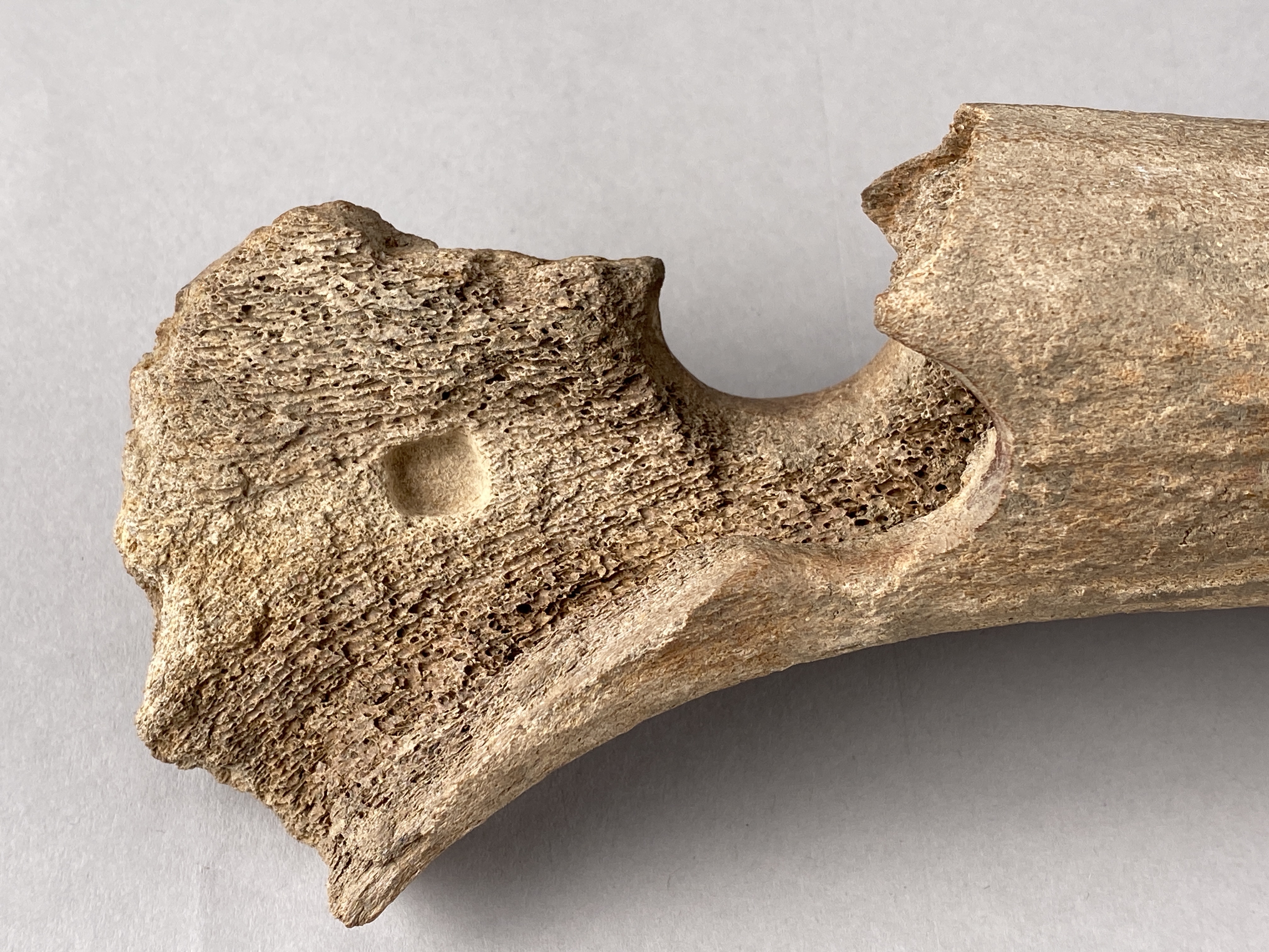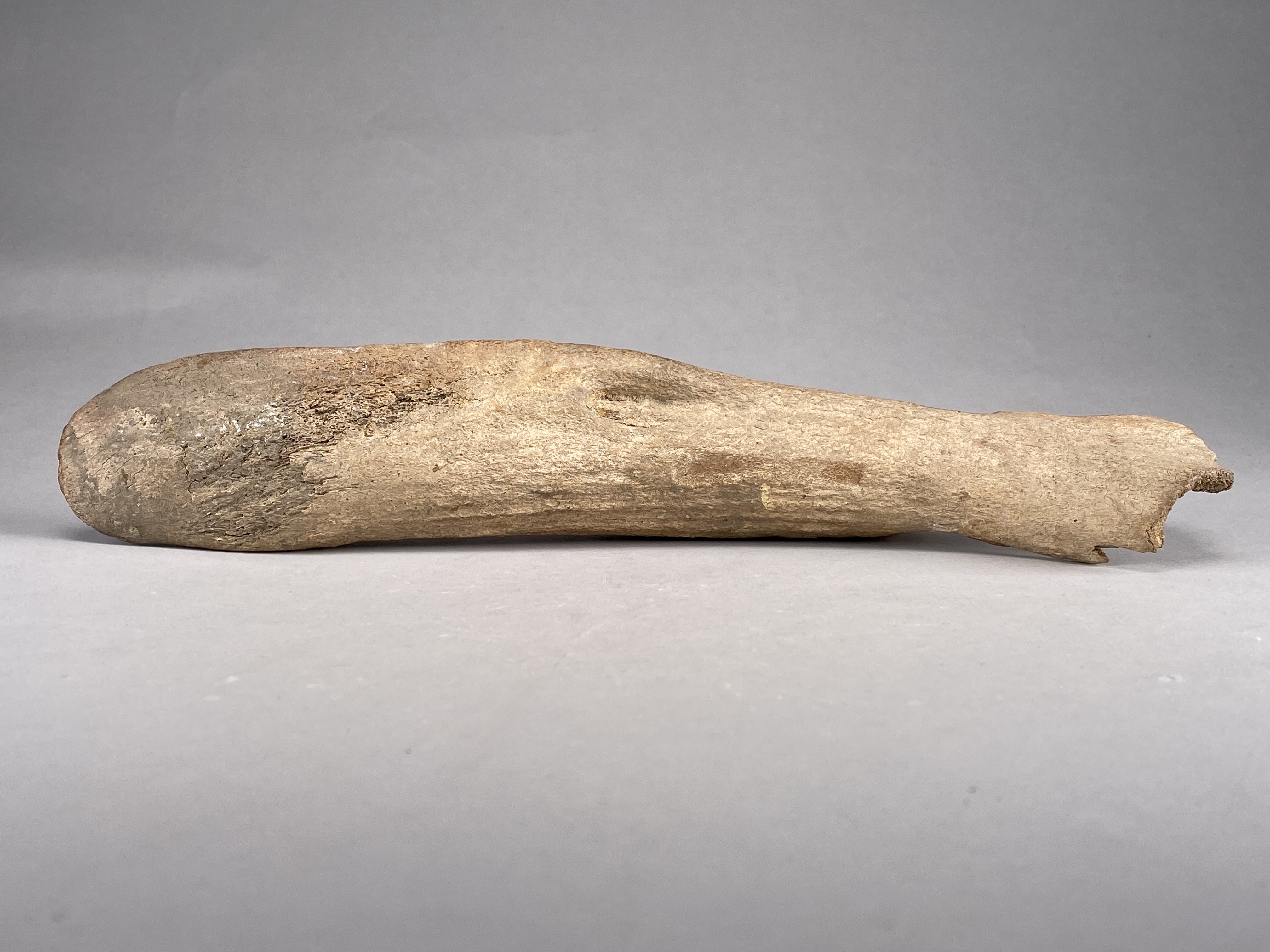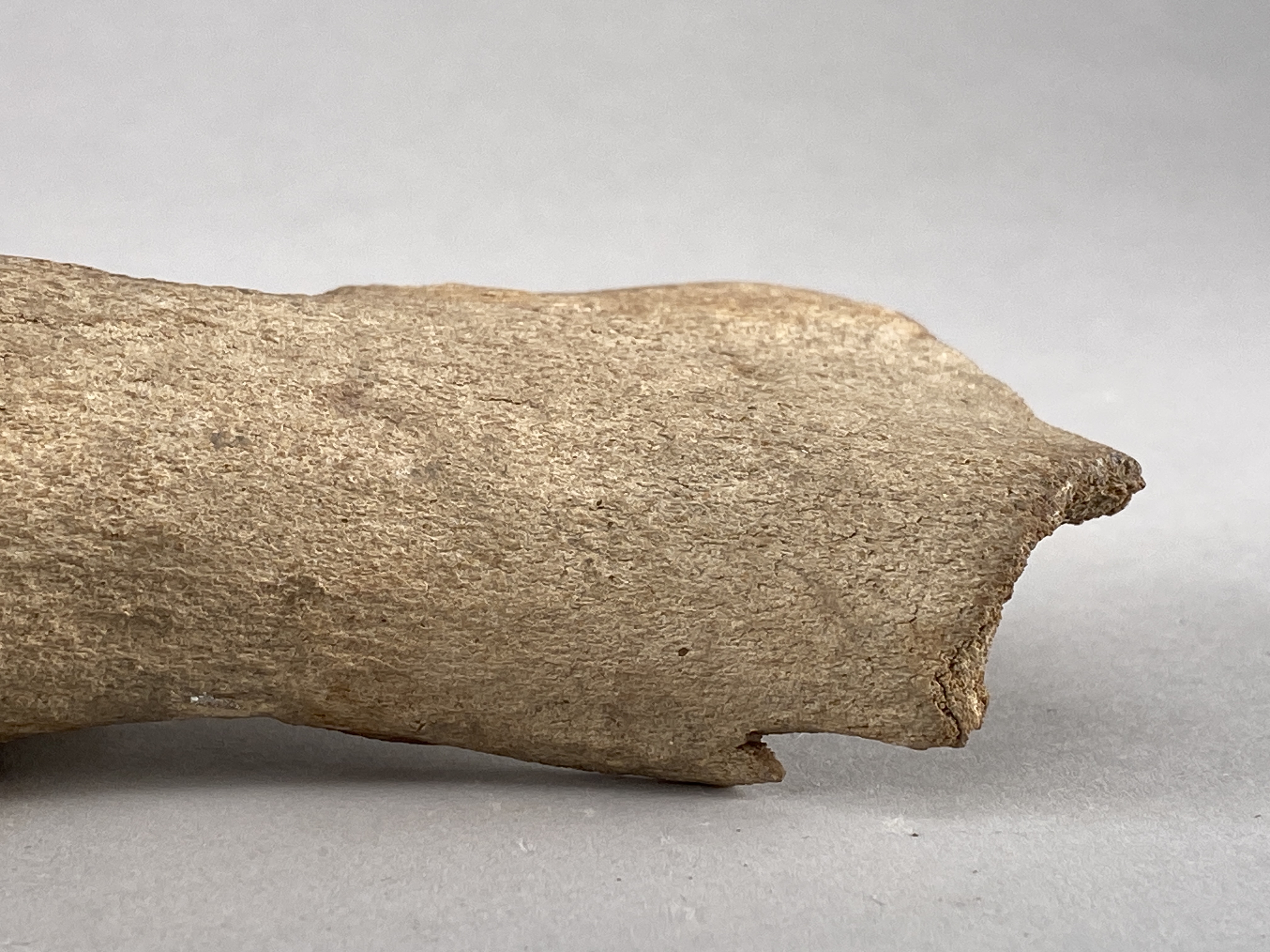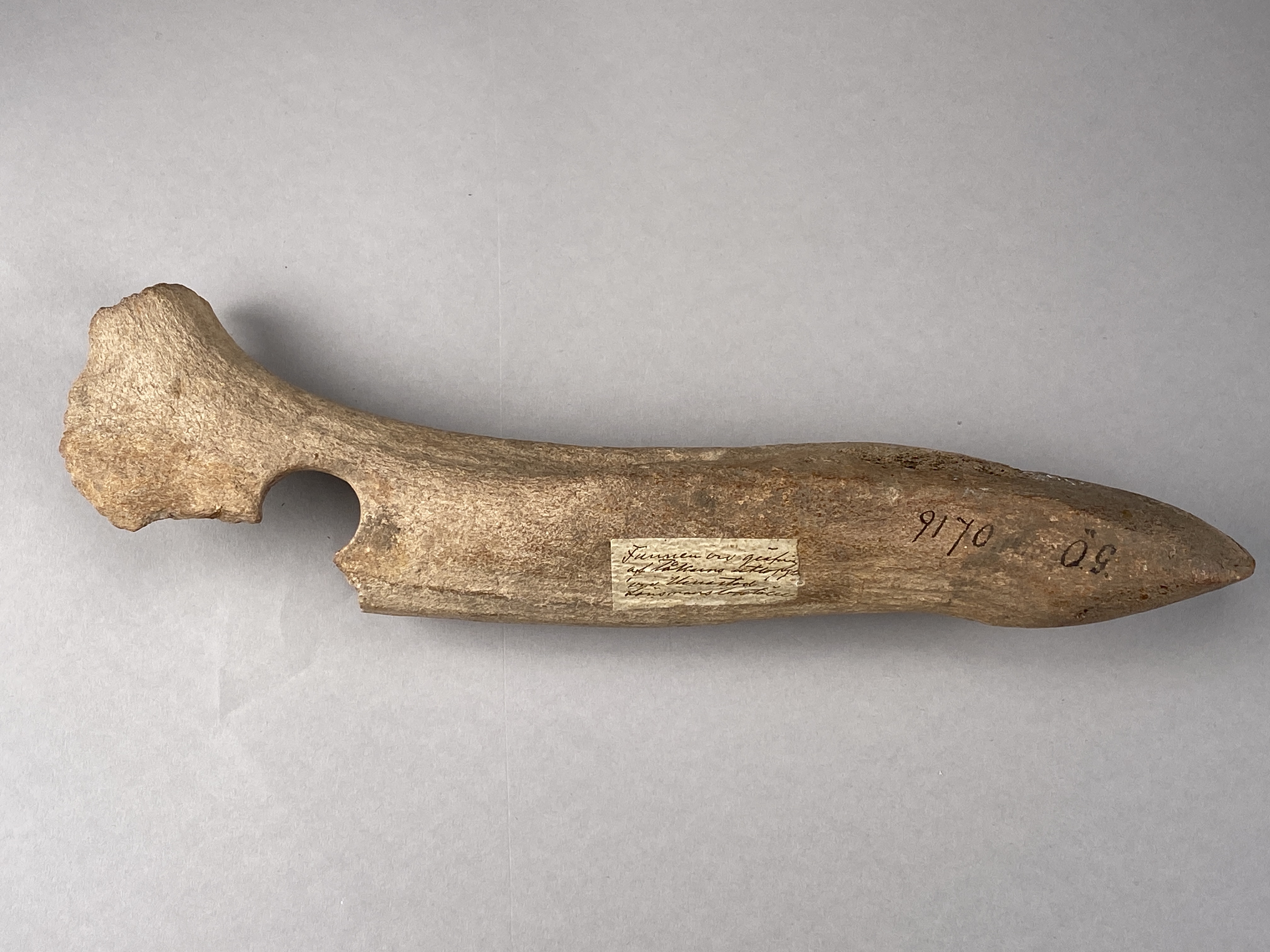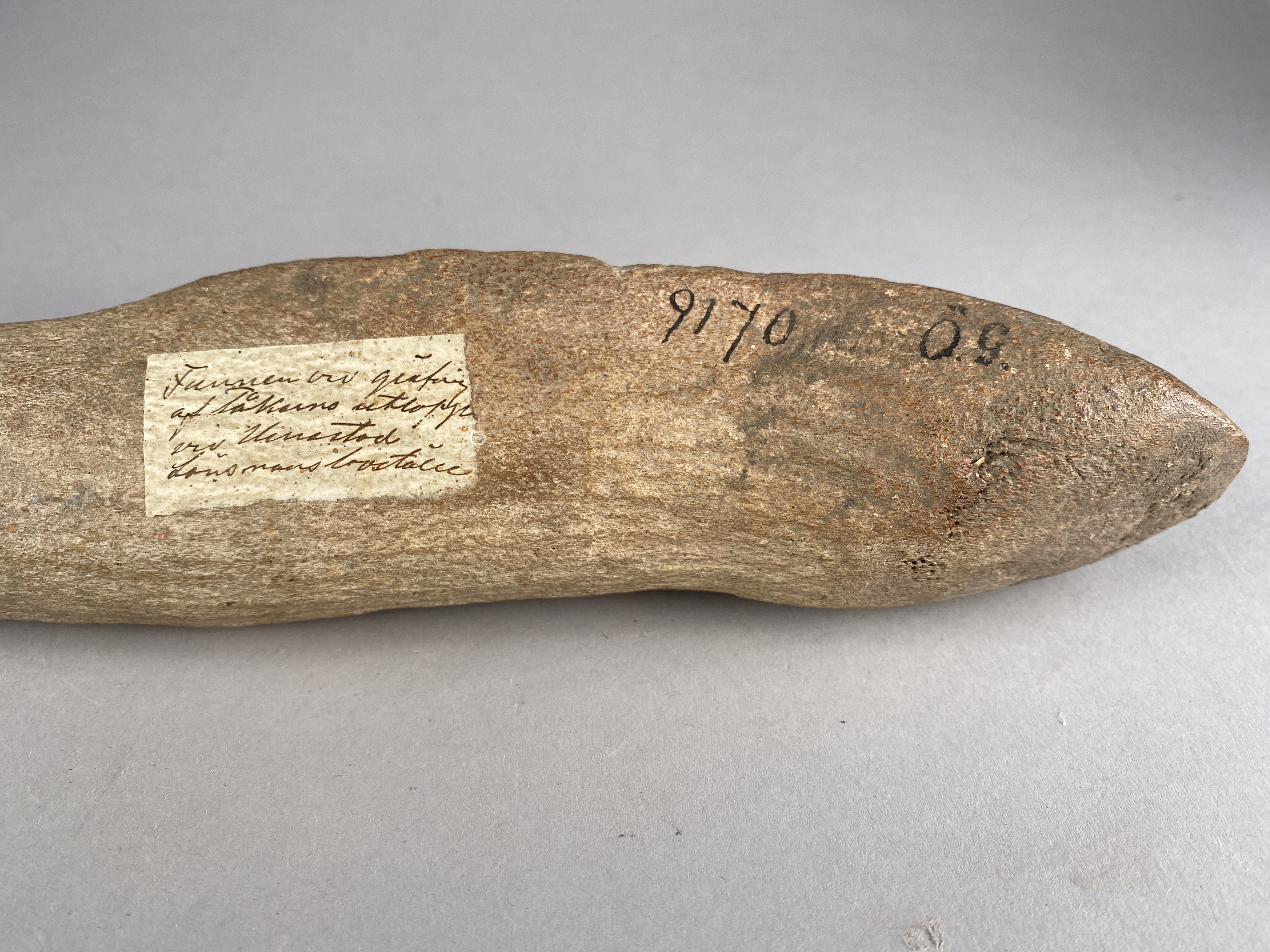 Yxa av horn med fint formad egg och skafthål. Skafthålet trasigt. Provtagen för C14-analys 2024. Efter provtagning har hålet satts igen av konservator.